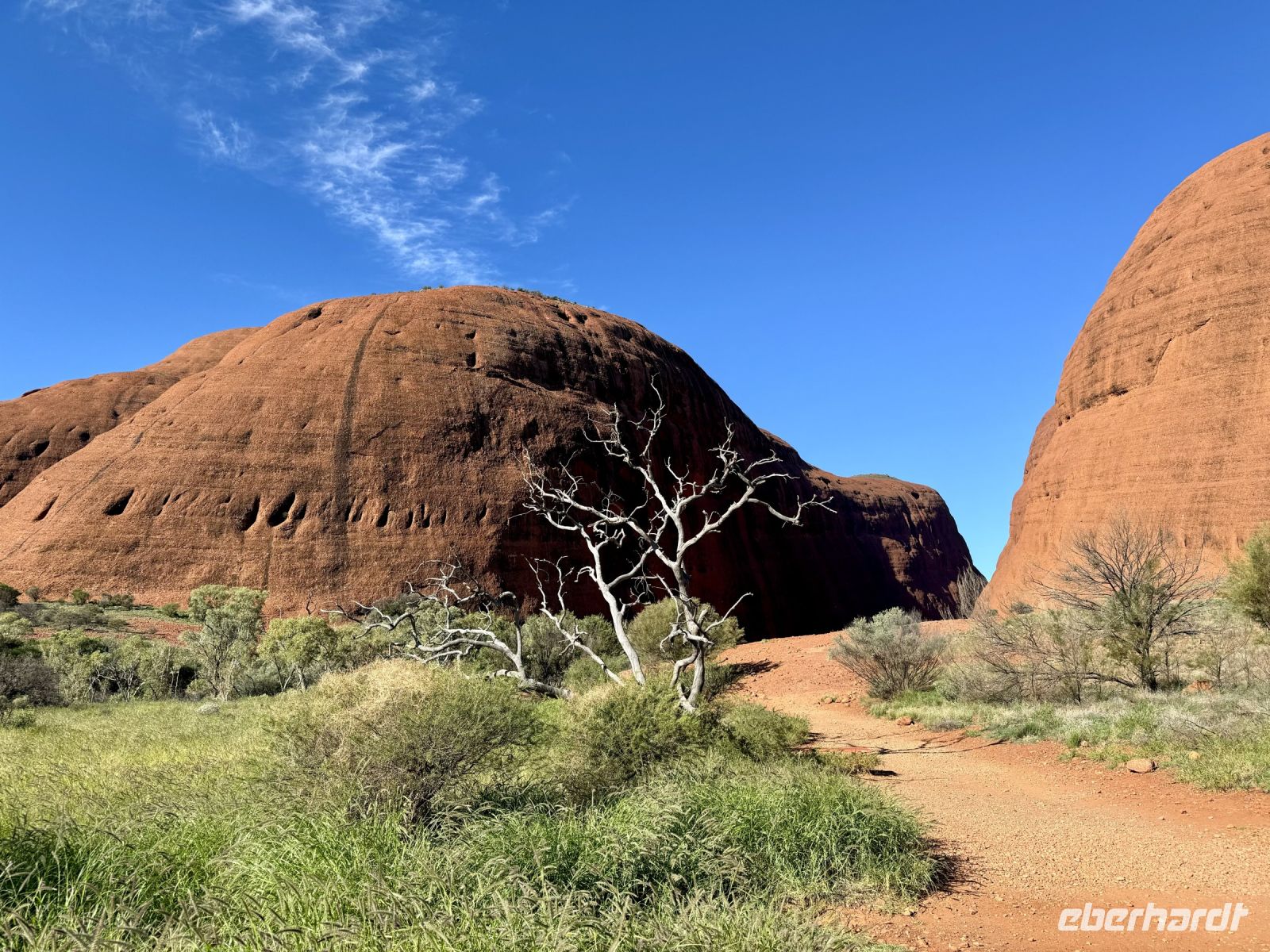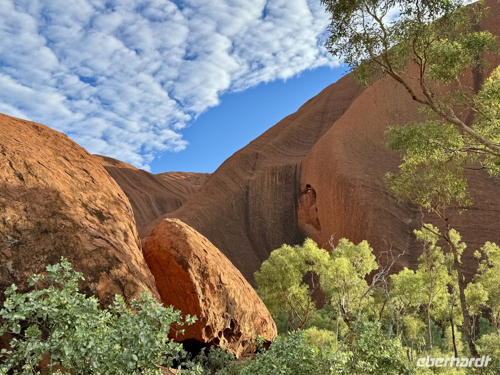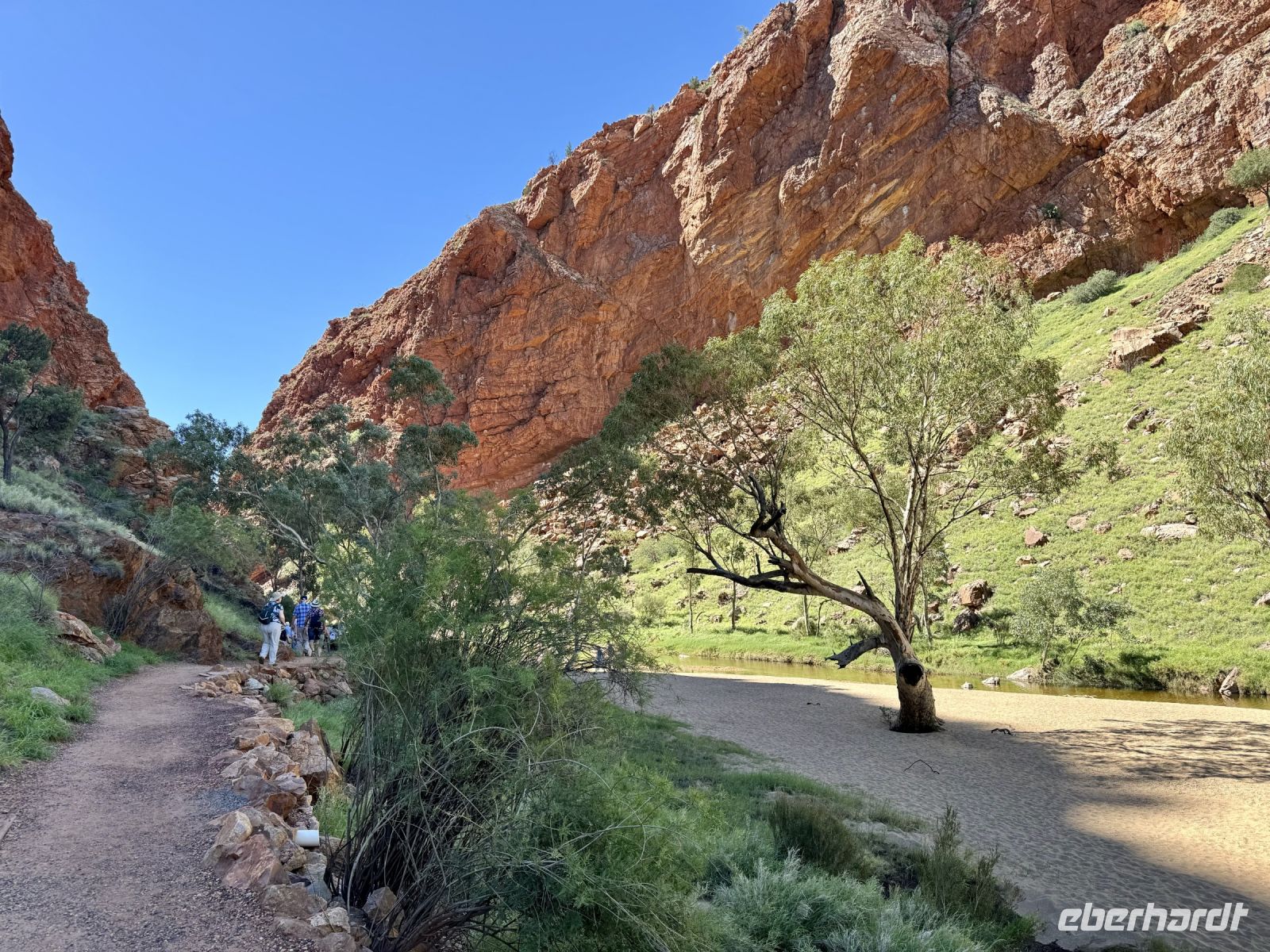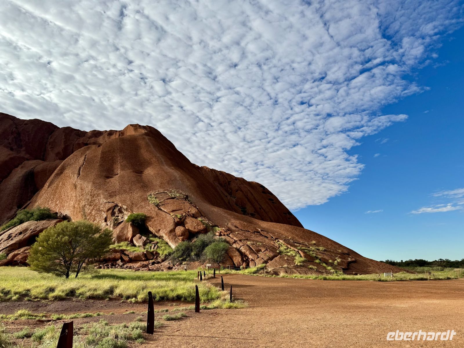 Heute ist wohl der einzige Tag auf der Reise, an dem wir freiwillig und mit großer Vorfreude und Begeisterung ganz zeitig aufstehen, denn wir wollen uns den Sonnenaufgang am Uluru anschauen! Schon allein für die Farbenspiele am Himmel hat sich das frühe Aufstehen gelohnt. Dann treffen die Strahlen der Morgensonne auf den Uluru und lassen ihn rot-orange aufleuchten. Herrlich! Warum der Uluru für die Aborigines ein heiliger Ort ist, können wir nach diesem Morgen gut verstehen. Eve entführt uns beim nachfolgenden Spaziergang zum Wasserloch auch in die Traumzeit und lässt die alten Sagen und Legenden, z. B. die Geschichte der Kunja-Schlange, auferstehen. Doch der Uluru war und ist nicht nur ein Heiligtum, sondern auch ein ritueller Ort, an dem Menschen wirklich lebten und ihren Glauben praktizierten. Die wellenförmige „Höhle“ der Frauen dürfen wir betreten; andere Stätten sind nur den Einheimischen vorbehalten. Und den Aufstieg können wir zwar noch erkennen, aber er ist seit einigen Jahren endgültig verboten, nachdem höfliches Bitten nicht geholfen hat. Inzwischen macht sich aber doch ein leichtes Hungergefühl im Bauch bemerkbar, weshalb wir zum Frühstück in unser Hotel zurückkehren. Dann starten wir auf die lange Fahrt nach Alice Springs, erst auf dem Lasseter Highway nach Westen, dann auf dem Stuart Highway nach Norden. Am Mount Conner Lookout machen wir unterwegs den ersten kleinen Fotostopp, gefolgt von einer Mittagspause am Erldunda Roadhouse, wo es auch ein paar Emus zu fotografieren gibt. In Alice Springs angekommen, besuchen wir gleich den Geburtsort der größten Stadt im Outback, die historische Telegrafenstation mit ihrer ambivalenten Geschichte. Heute ein sehr friedliches Fleckchen Erde, das uns Einblicke in das Leben der weißen Siedler/Pioniere von vor rund 150 Jahren gewährt. Vom Anzac Hill haben wir dann eine schöne Aussicht auf Alice Springs. Heute ist der Luxuszug „The Ghan“ im Ort; wir können die lange silberne Linie am Bahnhof von hier oben deutlich sehen. Schließlich beziehen wir für die nächsten beiden Nächte unsere Zimmer im Hotel und lassen den zweiten Abend im „Roten Zentrum“ ganz gemütlich ausklingen – morgen dürfen wir mal wieder etwas länger schlafen!