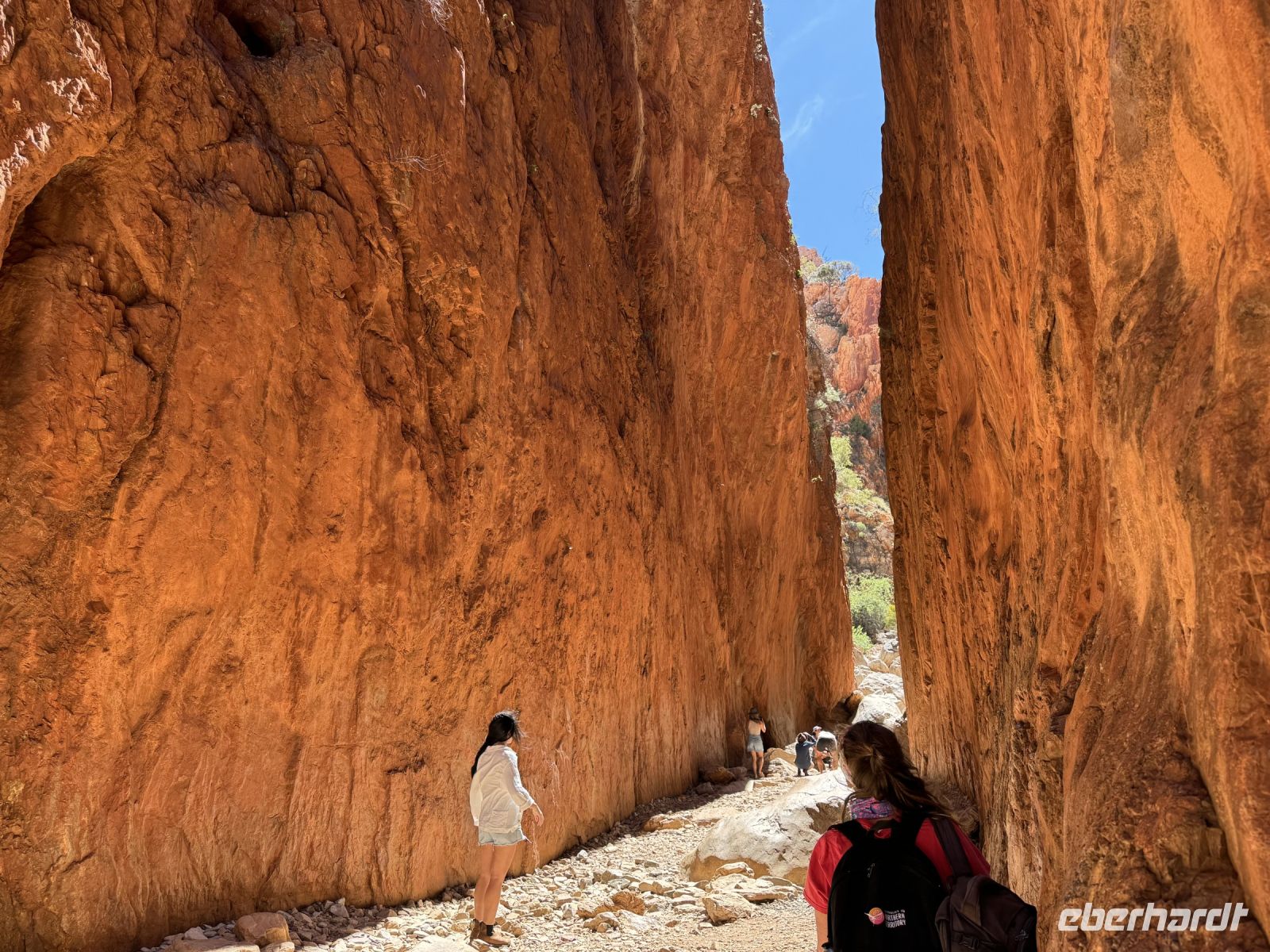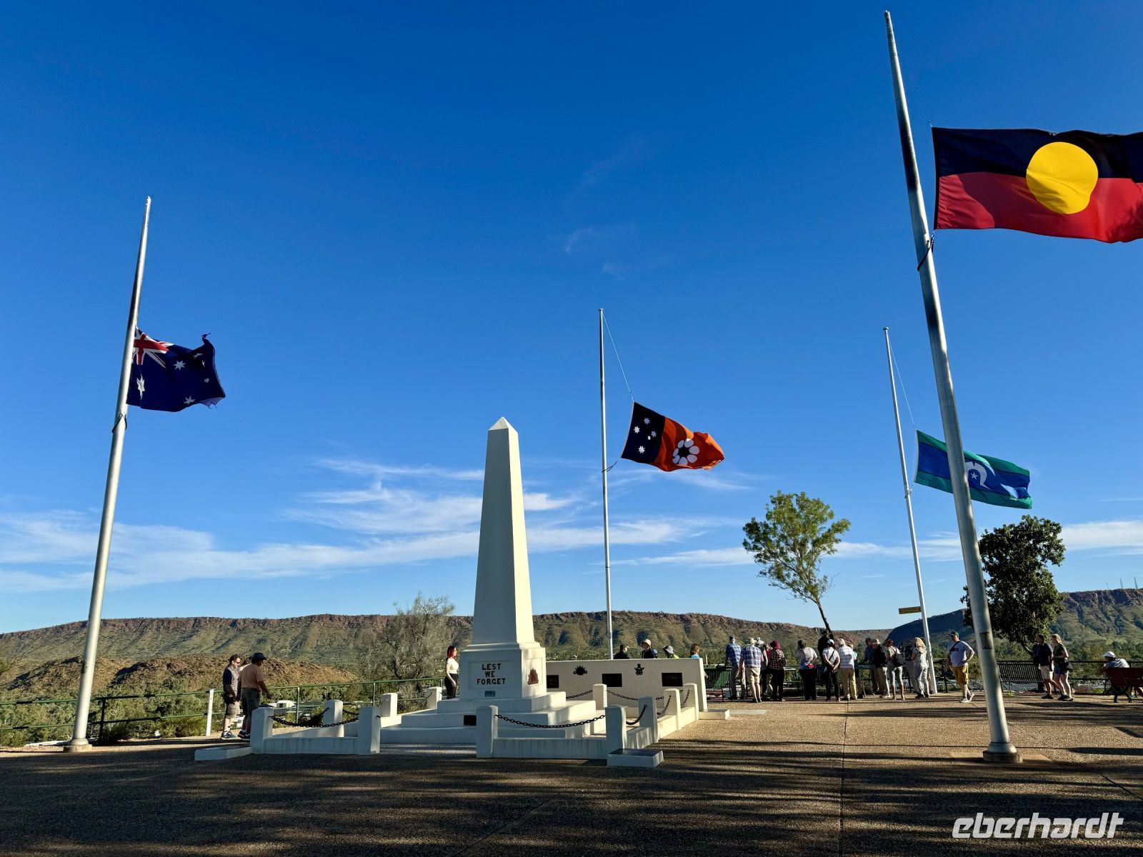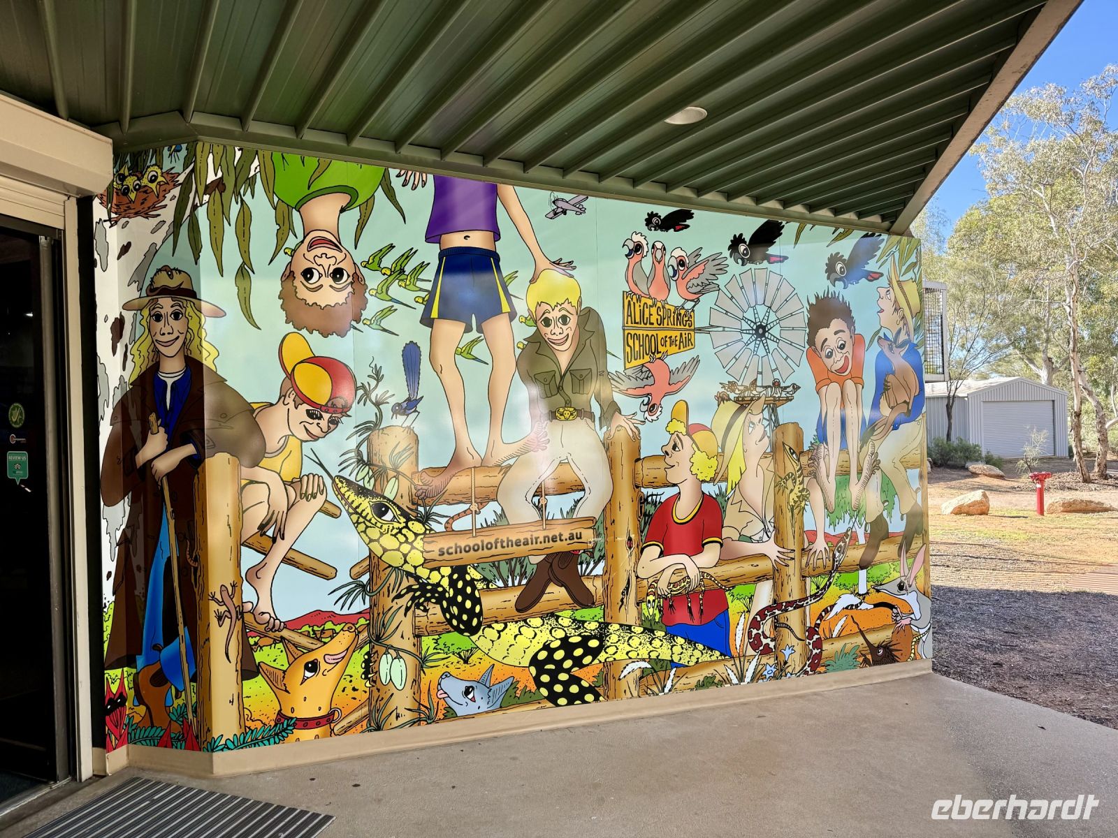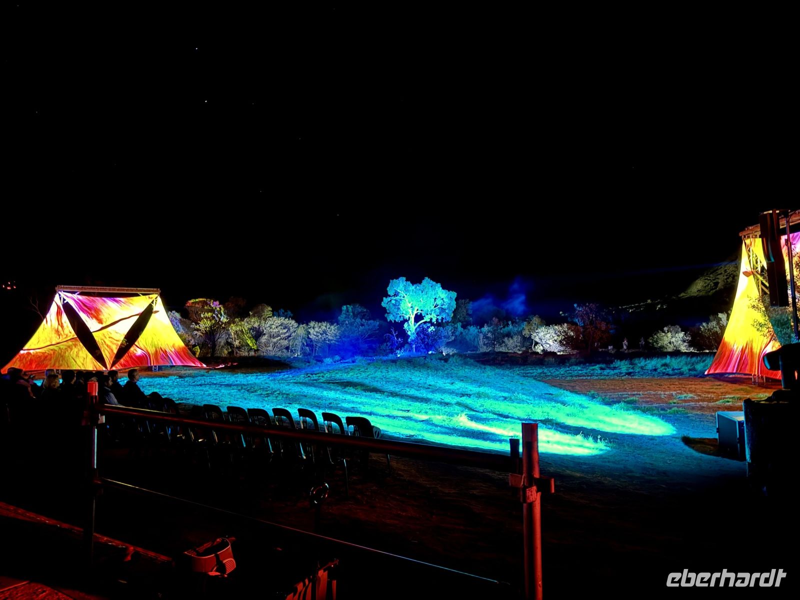 Auch heute wartet wieder ein schöner Tag mit vielen tollen Ausflügen auf uns. Auch das Wetter bleibt beständig gut – viel Sonne, bei knapp 30 Grad. Wunderbar! Wir beginnen mit zwei Besuchen in Alice Springs: Zuerst fahren wir zur School of the Air, dann zu den fliegenden Ärzten vom Royal Flying Doctor Service. Beide Institutionen leisten eine tolle Arbeit und geben den Menschen im Outback Sicherheit. Bei der School of the Air können wir sogar einer Lehrerin live beim Unterricht zuschauen. Über die Mittagszeit fahren wir aus der Stadt hinaus in die Bergkette West MacDonnell Ranges. Ost- und Westteil zusammengenommen erstreckt sich die „Schlange“ der MacDonnell Ranges über eine Strecke von mehr als 600 Kilometern. Unvorstellbar! Unterbrochen von einem leichten Mittagsbuffet besichtigen wir sowohl die Schlucht „Standley Chasm“ als auch die „Simpsons Gap“ (obwohl unser Fahrer Andrew fast vorbeigerauscht wäre). Die Lichteffekte durch die Sonnenstrahlen sind in beiden Schluchten immer wieder besonders schön, vor allem, wenn sich die Felswände im Wasser spiegeln. Uns umgeben herrliche warme Orange- und Rottöne. Mehr über die unterschiedlichen Landschaftstypen im Northern Territory und die Tierwelt erfahren wir im Alice Springs Desert Park. Zum Glück sind die Schlangen im Nachthaus hinter dicken Glaswänden untergebracht, aber uns wird trotzdem ein bisschen mulmig! Die vielen unterschiedlichen Vogelarten sind ebenfalls sehr faszinierend. Apropos Lichteffekte: Am Abend findet hier am Desert Park in Alice Springs zufällig gerade das Parrtjima-Lichterfestival statt. Schön, dass uns Eve dank ihrer Recherche diesen zusätzlichen Programmpunkt ermöglicht und sogar noch einmal hierher begleitet. Die Licht- und Lasershow und überhaupt das ganze Drumherum bilden einen weiteren kleinen Höhepunkt unseres Besuchs im Outback!