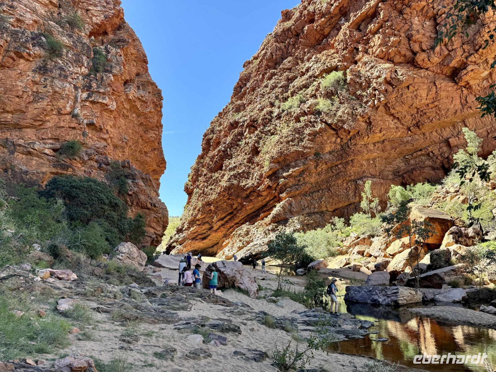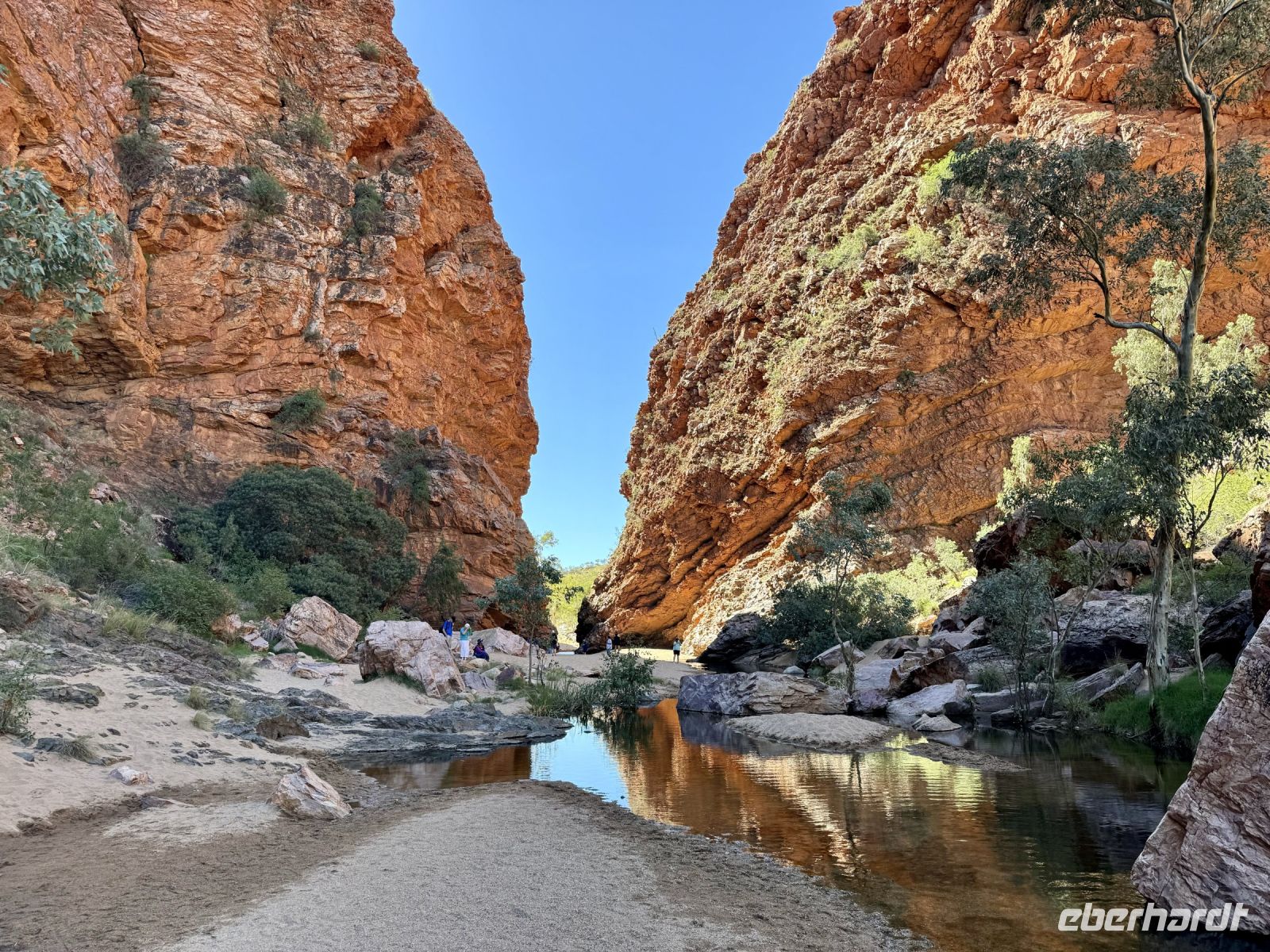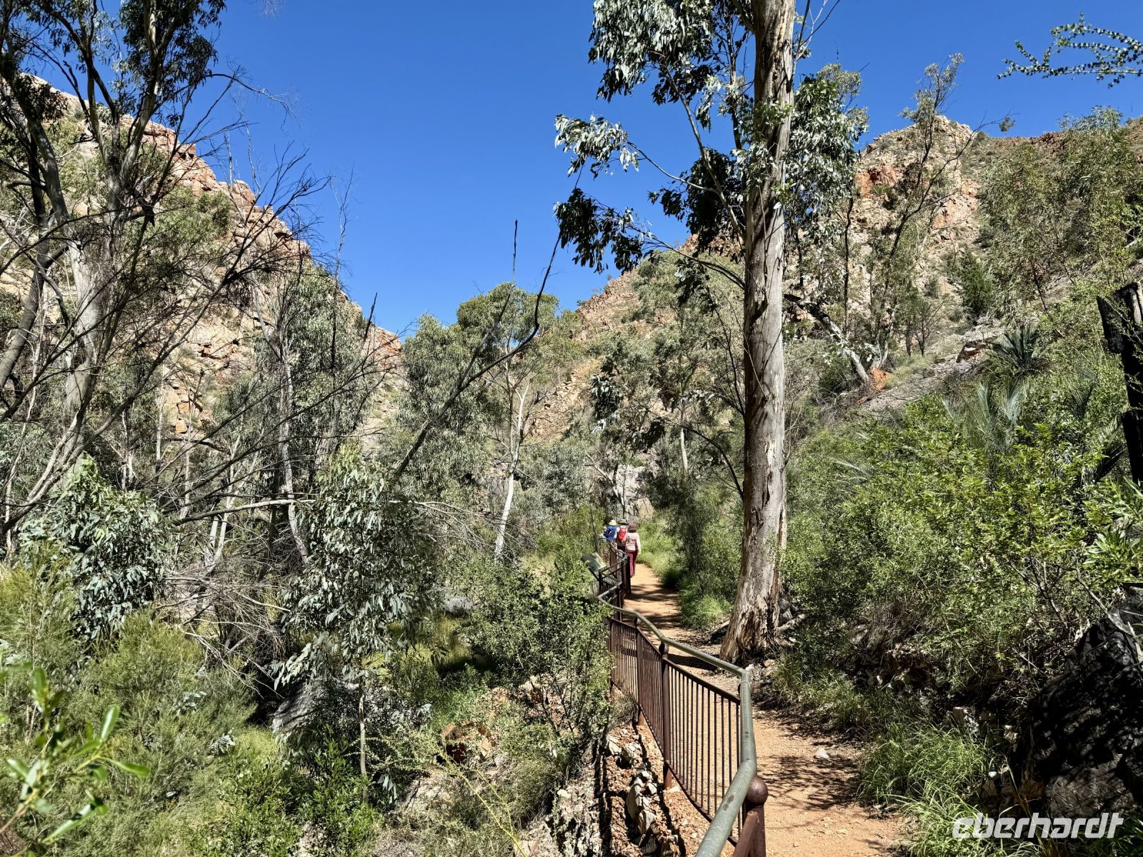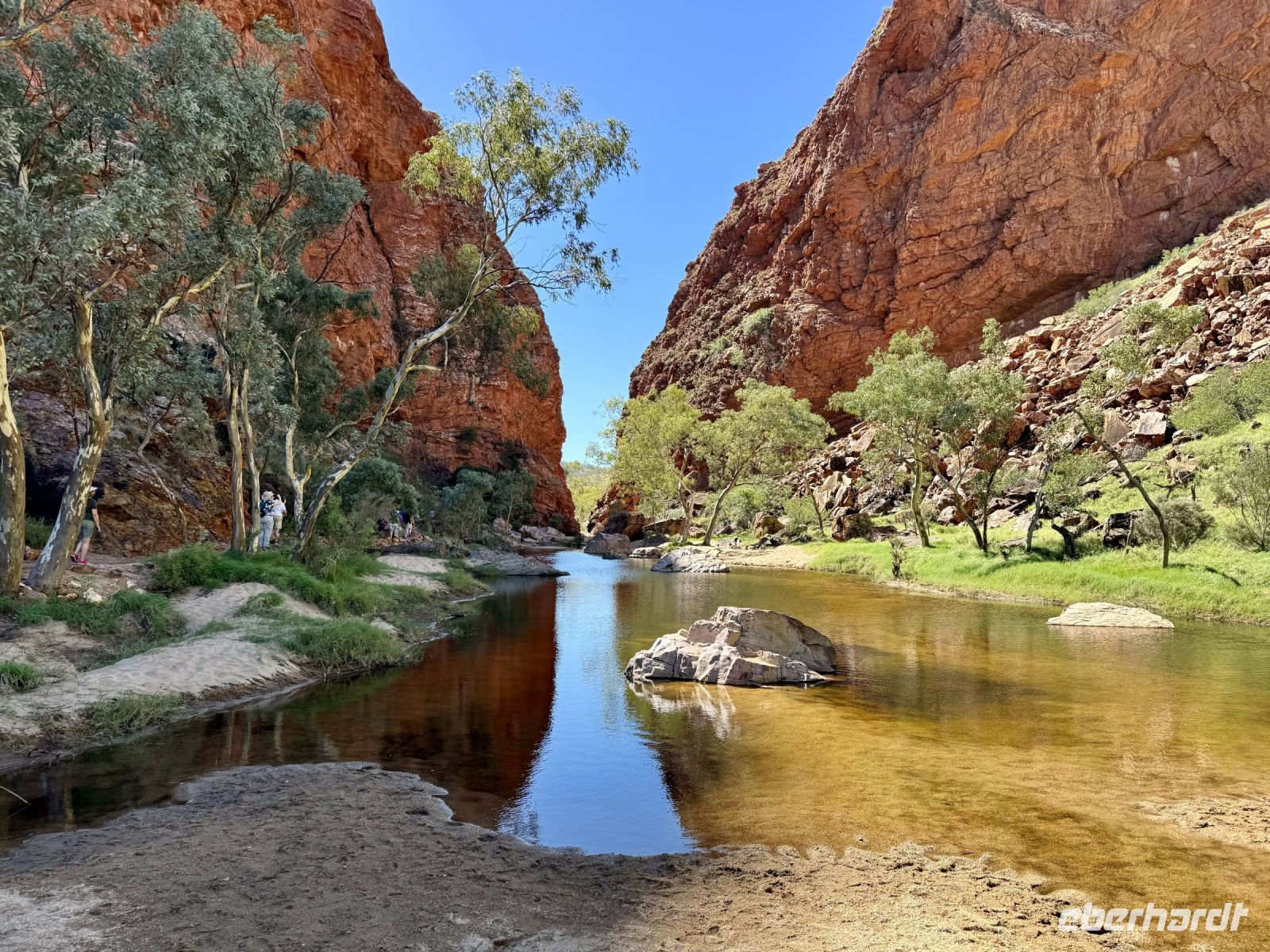 Auch heute wartet wieder ein schöner Tag mit vielen tollen Ausflügen auf uns. Auch das Wetter bleibt beständig gut – viel Sonne, bei knapp 30 Grad. Wunderbar! Wir beginnen mit zwei Besuchen in Alice Springs: Zuerst fahren wir zur School of the Air, dann zu den fliegenden Ärzten vom Royal Flying Doctor Service. Beide Institutionen leisten eine tolle Arbeit und geben den Menschen im Outback Sicherheit. Bei der School of the Air können wir sogar einer Lehrerin live beim Unterricht zuschauen. Über die Mittagszeit fahren wir aus der Stadt hinaus in die Bergkette West MacDonnell Ranges. Ost- und Westteil zusammengenommen erstreckt sich die „Schlange“ der MacDonnell Ranges über eine Strecke von mehr als 600 Kilometern. Unvorstellbar! Unterbrochen von einem leichten Mittagsbuffet besichtigen wir sowohl die Schlucht „Standley Chasm“ als auch die „Simpsons Gap“ (obwohl unser Fahrer Andrew fast vorbeigerauscht wäre). Die Lichteffekte durch die Sonnenstrahlen sind in beiden Schluchten immer wieder besonders schön, vor allem, wenn sich die Felswände im Wasser spiegeln. Uns umgeben herrliche warme Orange- und Rottöne. Mehr über die unterschiedlichen Landschaftstypen im Northern Territory und die Tierwelt erfahren wir im Alice Springs Desert Park. Zum Glück sind die Schlangen im Nachthaus hinter dicken Glaswänden untergebracht, aber uns wird trotzdem ein bisschen mulmig! Die vielen unterschiedlichen Vogelarten sind ebenfalls sehr faszinierend. Apropos Lichteffekte: Am Abend findet hier am Desert Park in Alice Springs zufällig gerade das Parrtjima-Lichterfestival statt. Schön, dass uns Eve dank ihrer Recherche diesen zusätzlichen Programmpunkt ermöglicht und sogar noch einmal hierher begleitet. Die Licht- und Lasershow und überhaupt das ganze Drumherum bilden einen weiteren kleinen Höhepunkt unseres Besuchs im Outback!