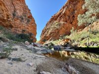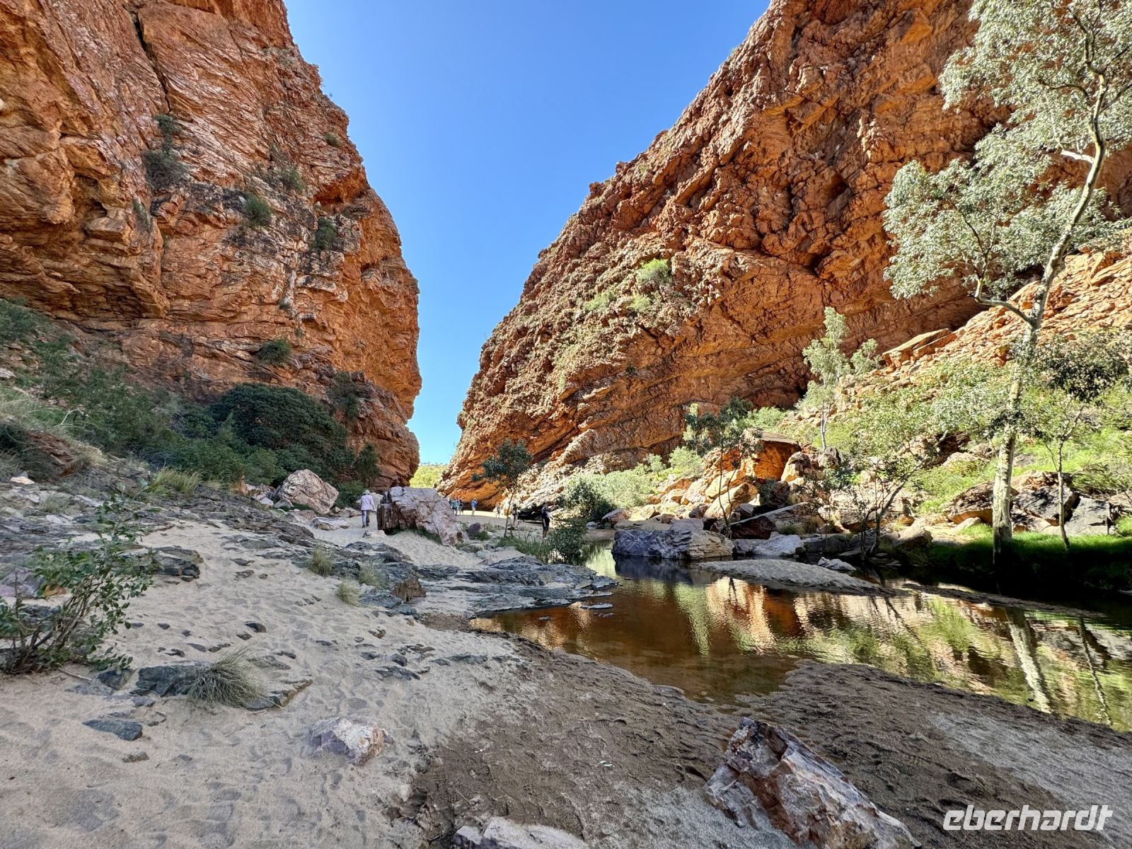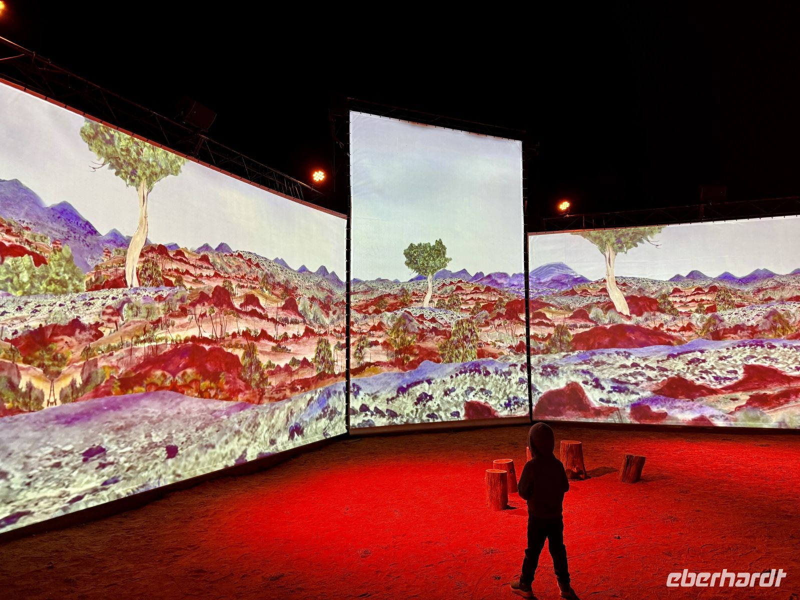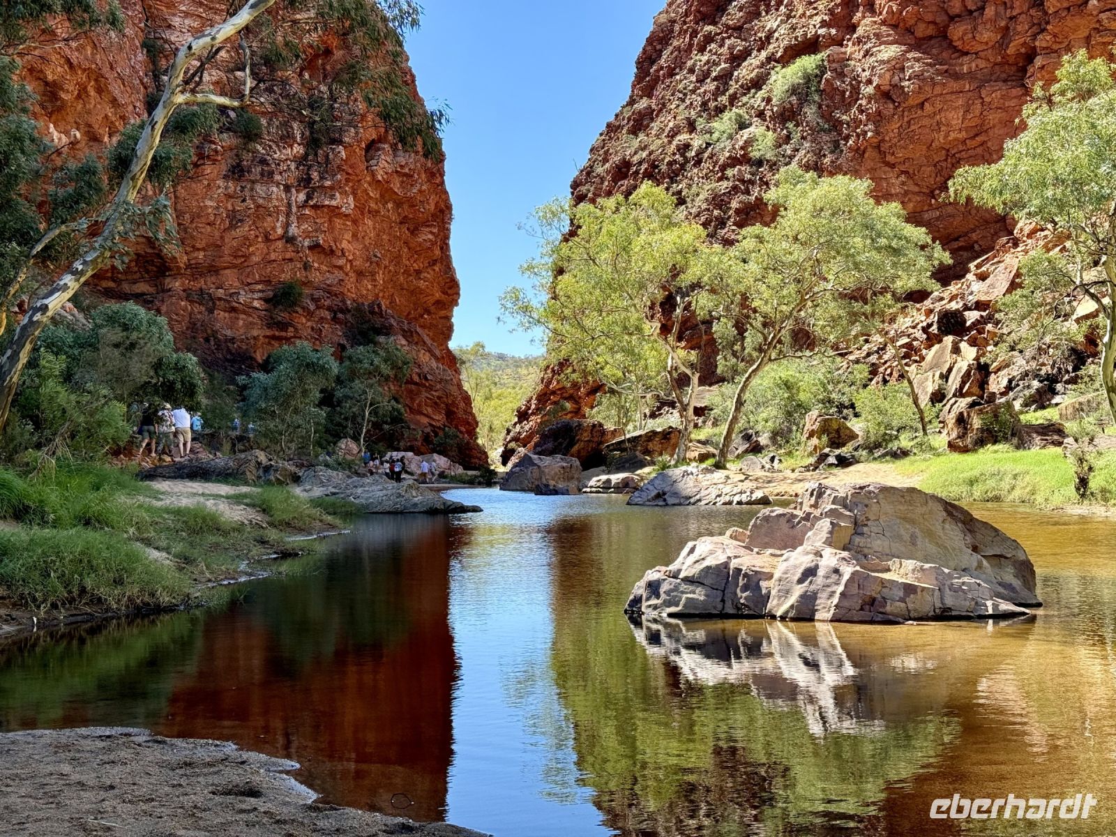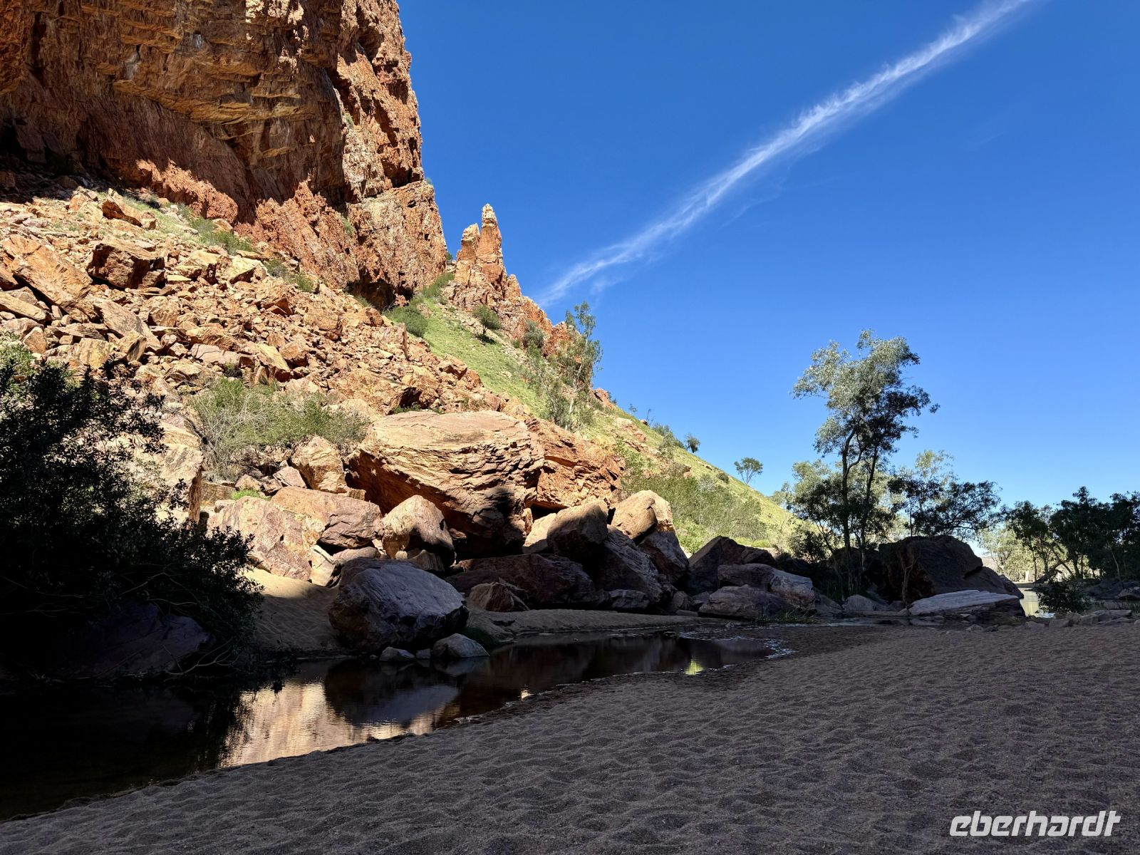 Auch heute wartet wieder ein schöner Tag mit vielen tollen Ausflügen auf uns. Auch das Wetter bleibt beständig gut – viel Sonne, bei knapp 30 Grad. Wunderbar! Wir beginnen mit zwei Besuchen in Alice Springs: Zuerst fahren wir zur School of the Air, dann zu den fliegenden Ärzten vom Royal Flying Doctor Service. Beide Institutionen leisten eine tolle Arbeit und geben den Menschen im Outback Sicherheit. Bei der School of the Air können wir sogar einer Lehrerin live beim Unterricht zuschauen. Über die Mittagszeit fahren wir aus der Stadt hinaus in die Bergkette West MacDonnell Ranges. Ost- und Westteil zusammengenommen erstreckt sich die „Schlange“ der MacDonnell Ranges über eine Strecke von mehr als 600 Kilometern. Unvorstellbar! Unterbrochen von einem leichten Mittagsbuffet besichtigen wir sowohl die Schlucht „Standley Chasm“ als auch die „Simpsons Gap“ (obwohl unser Fahrer Andrew fast vorbeigerauscht wäre). Die Lichteffekte durch die Sonnenstrahlen sind in beiden Schluchten immer wieder besonders schön, vor allem, wenn sich die Felswände im Wasser spiegeln. Uns umgeben herrliche warme Orange- und Rottöne. Mehr über die unterschiedlichen Landschaftstypen im Northern Territory und die Tierwelt erfahren wir im Alice Springs Desert Park. Zum Glück sind die Schlangen im Nachthaus hinter dicken Glaswänden untergebracht, aber uns wird trotzdem ein bisschen mulmig! Die vielen unterschiedlichen Vogelarten sind ebenfalls sehr faszinierend. Apropos Lichteffekte: Am Abend findet hier am Desert Park in Alice Springs zufällig gerade das Parrtjima-Lichterfestival statt. Schön, dass uns Eve dank ihrer Recherche diesen zusätzlichen Programmpunkt ermöglicht und sogar noch einmal hierher begleitet. Die Licht- und Lasershow und überhaupt das ganze Drumherum bilden einen weiteren kleinen Höhepunkt unseres Besuchs im Outback!