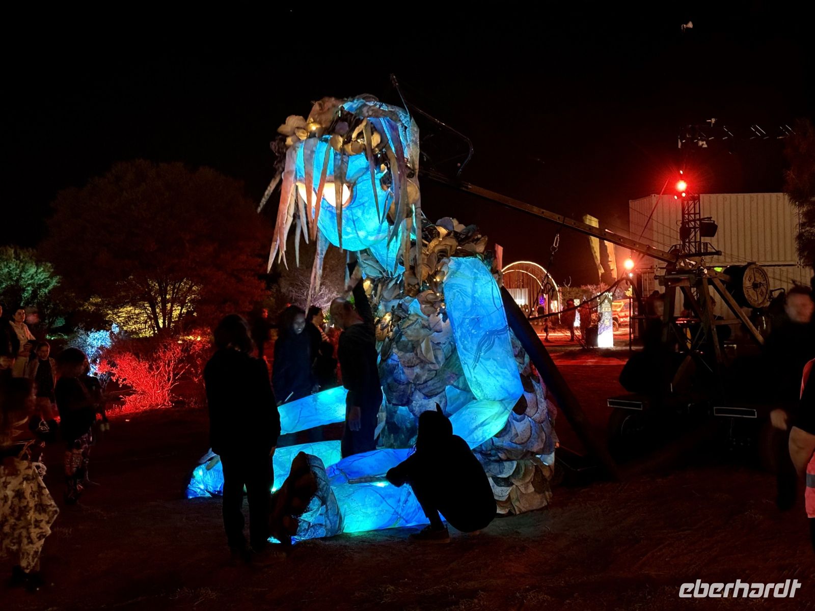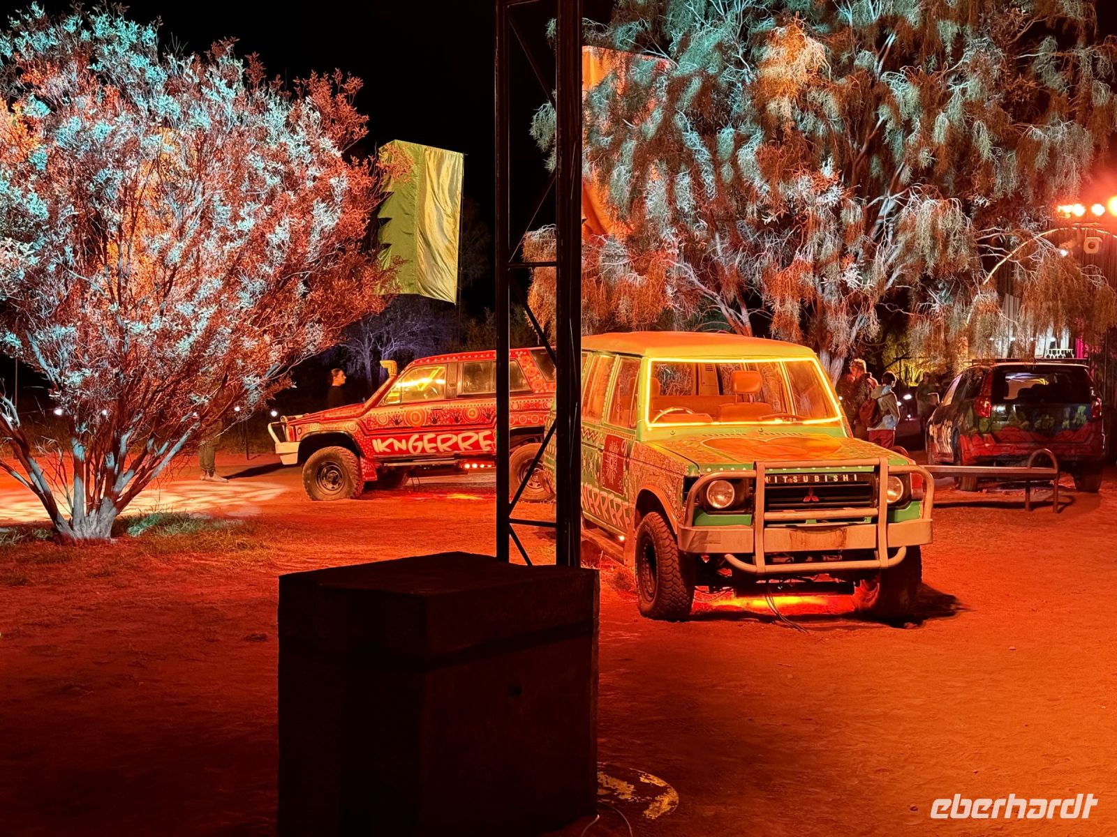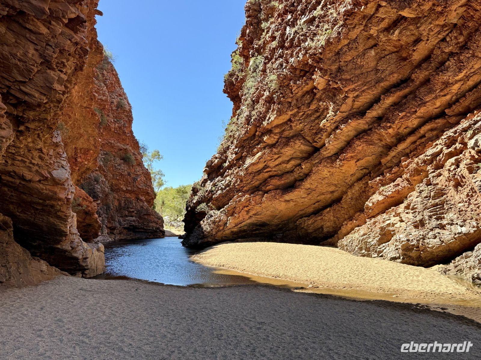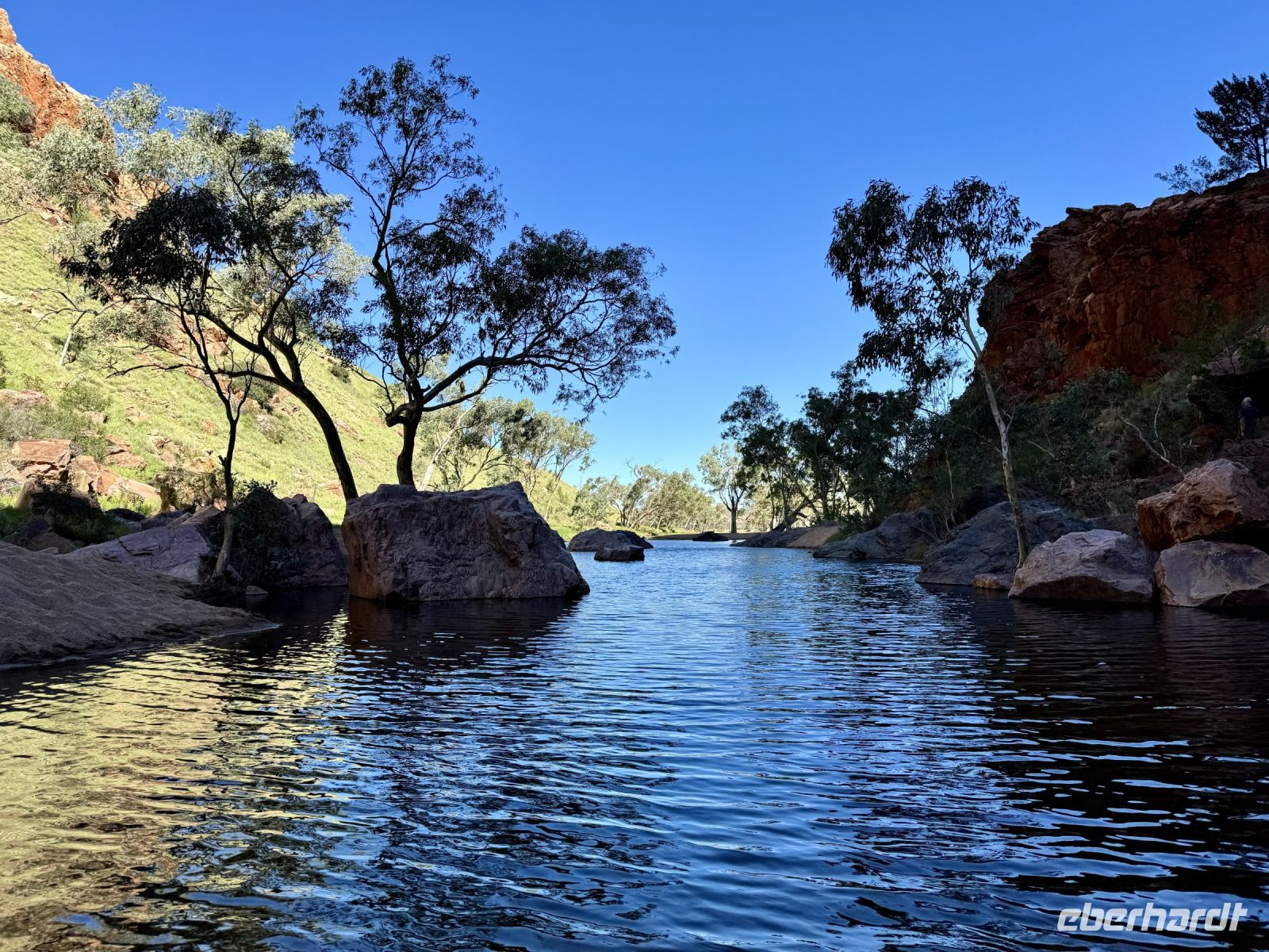 Auch heute wartet wieder ein schöner Tag mit vielen tollen Ausflügen auf uns. Auch das Wetter bleibt beständig gut – viel Sonne, bei knapp 30 Grad. Wunderbar! Wir beginnen mit zwei Besuchen in Alice Springs: Zuerst fahren wir zur School of the Air, dann zu den fliegenden Ärzten vom Royal Flying Doctor Service. Beide Institutionen leisten eine tolle Arbeit und geben den Menschen im Outback Sicherheit. Bei der School of the Air können wir sogar einer Lehrerin live beim Unterricht zuschauen. Über die Mittagszeit fahren wir aus der Stadt hinaus in die Bergkette West MacDonnell Ranges. Ost- und Westteil zusammengenommen erstreckt sich die „Schlange“ der MacDonnell Ranges über eine Strecke von mehr als 600 Kilometern. Unvorstellbar! Unterbrochen von einem leichten Mittagsbuffet besichtigen wir sowohl die Schlucht „Standley Chasm“ als auch die „Simpsons Gap“ (obwohl unser Fahrer Andrew fast vorbeigerauscht wäre). Die Lichteffekte durch die Sonnenstrahlen sind in beiden Schluchten immer wieder besonders schön, vor allem, wenn sich die Felswände im Wasser spiegeln. Uns umgeben herrliche warme Orange- und Rottöne. Mehr über die unterschiedlichen Landschaftstypen im Northern Territory und die Tierwelt erfahren wir im Alice Springs Desert Park. Zum Glück sind die Schlangen im Nachthaus hinter dicken Glaswänden untergebracht, aber uns wird trotzdem ein bisschen mulmig! Die vielen unterschiedlichen Vogelarten sind ebenfalls sehr faszinierend. Apropos Lichteffekte: Am Abend findet hier am Desert Park in Alice Springs zufällig gerade das Parrtjima-Lichterfestival statt. Schön, dass uns Eve dank ihrer Recherche diesen zusätzlichen Programmpunkt ermöglicht und sogar noch einmal hierher begleitet. Die Licht- und Lasershow und überhaupt das ganze Drumherum bilden einen weiteren kleinen Höhepunkt unseres Besuchs im Outback!