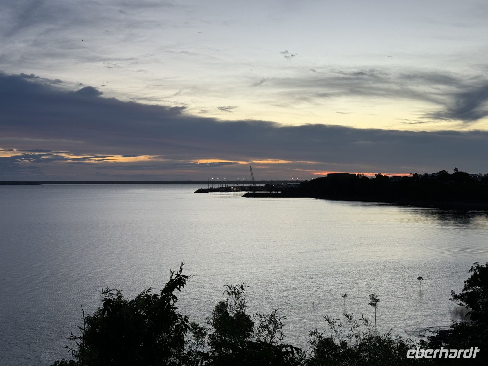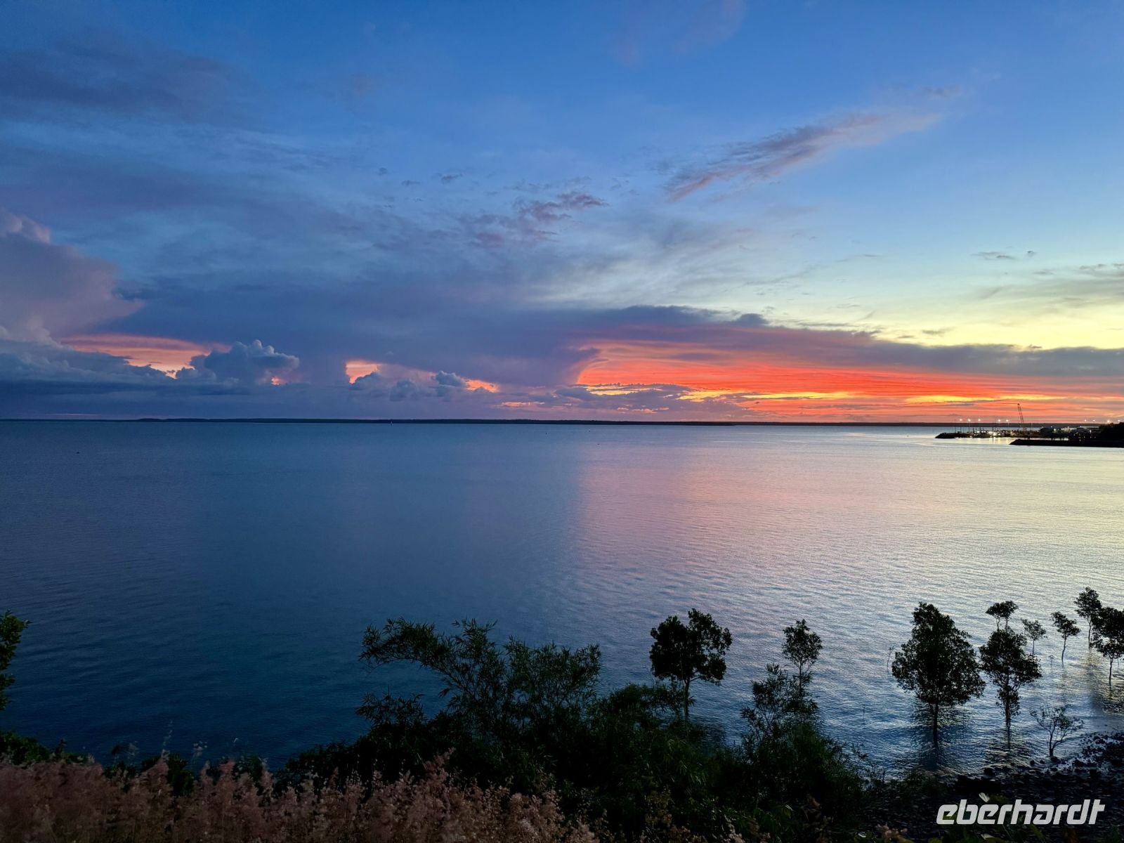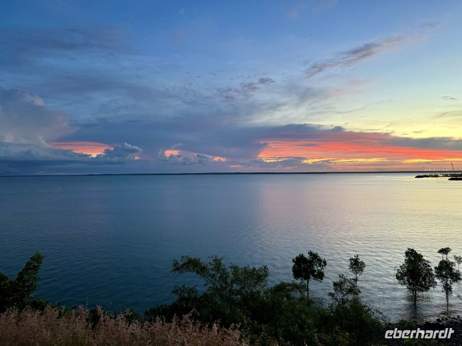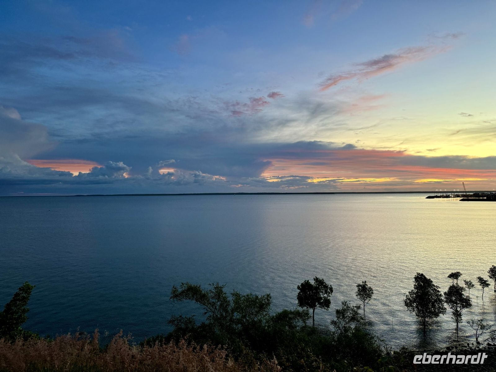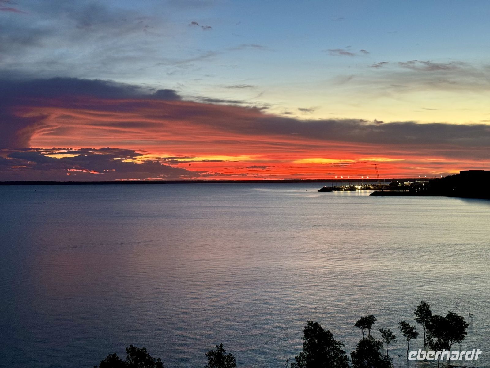 Unser Abenteuer im Outback geht heute ganz entspannt zu Ende. Erst am Mittag werden wir von Andrew abgeholt und zum kleinen Flughafen von Alice Springs gebracht. Wir verabschieden uns von Eve und Andrew jeweils mit einem großen Applaus und gehen dann ins Terminal, wo die Bordkarten bereits ausgedruckt auf uns warten. Wir fliegen diesmal mit einer Embraer E190, dem bisher kleinsten Flugzeug auf unserer Reise. Nach dem Start können wir sehr gut die lange Linie der MacDonnell Ranges ausmachen und fotografieren. Die reine Flugzeit beträgt nur etwa 1,5 Stunden. Schon beim Verlassen des Flugzeugs werden wir von der schwülen Hitze regelrecht erschlagen. Es ist nur 4 bis 5 Grad wärmer als in Alice Springs, aber die Luftfeuchtigkeit ist wesentlich höher. In Darwin empfangen uns unsere neue Reiseleiterin Esther (ursprünglich aus Basel) und unsere Busfahrerin Melinda. Sie möchten uns ab morgen den Kakadu-Nationalpark zeigen. Heute fahren wir jedoch nur noch zum Hotel, wobei uns Esther und Melinda zur Orientierung auf dem Weg noch die Esplanade, das Parlament, die Mitchell Street mit ihren Geschäften und Kneipen sowie die St Mary's Cathedral zeigen. Mit einigen Gästen treffe ich mich nach dem Check-In an der Rezeption und laufe hinunter zum Ufer. Wir wollen uns noch den Sonnenuntergang anschauen, der dank der Gewitterwolken am Horizont ganz besonders dramatisch ausfällt. Als besonders — und zwar ganz besonders gut — empfinden wir das in der Halbpension inkludierte Abendessen im Hotelrestaurant.