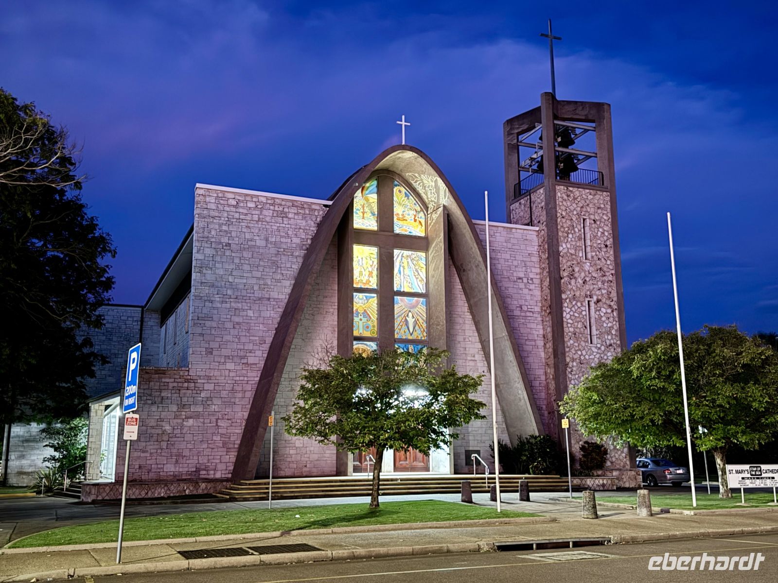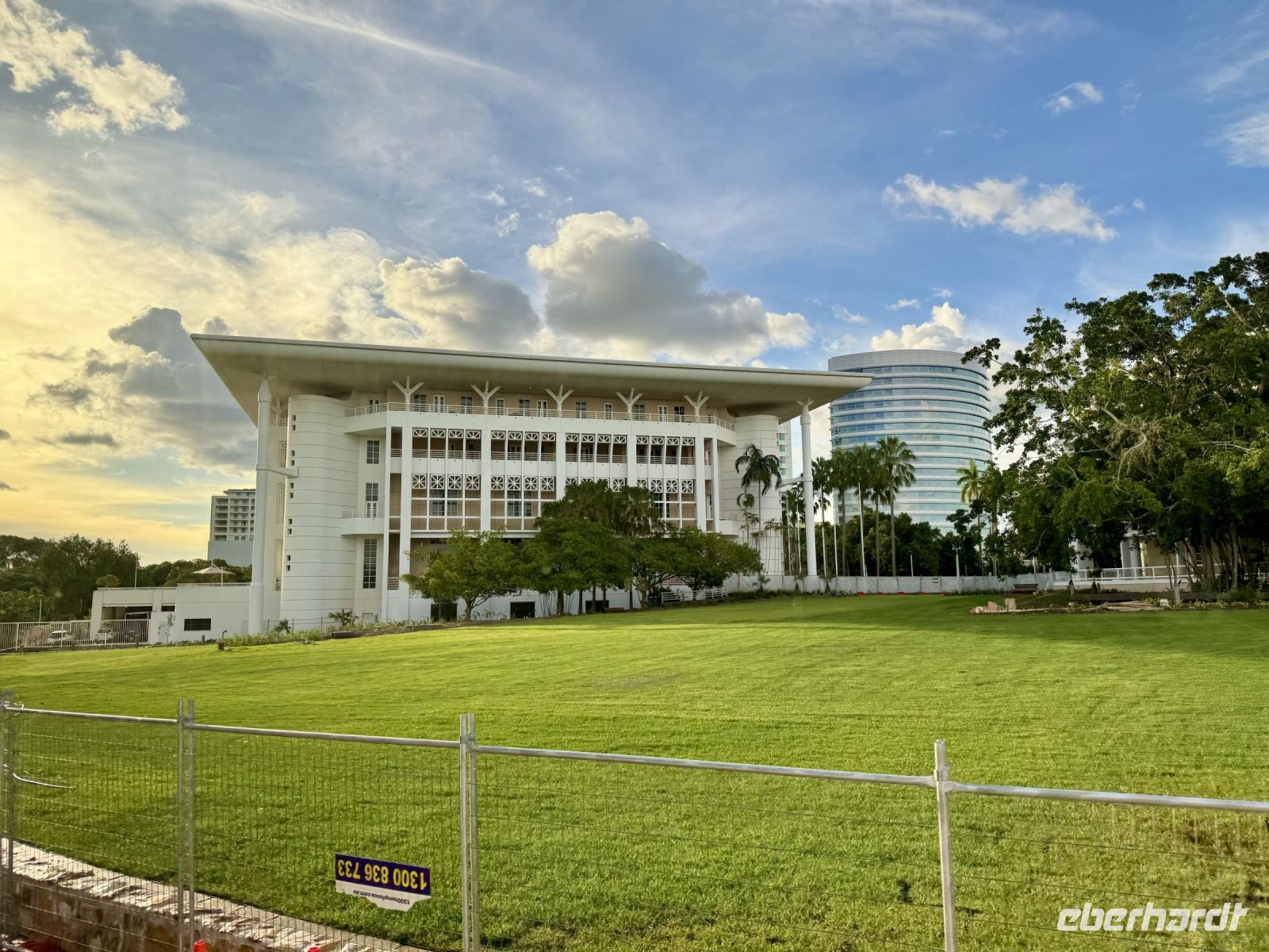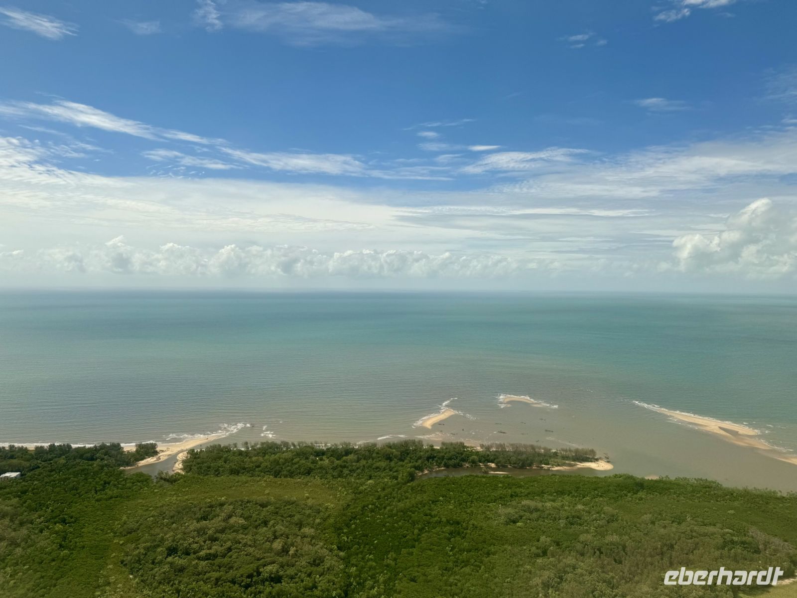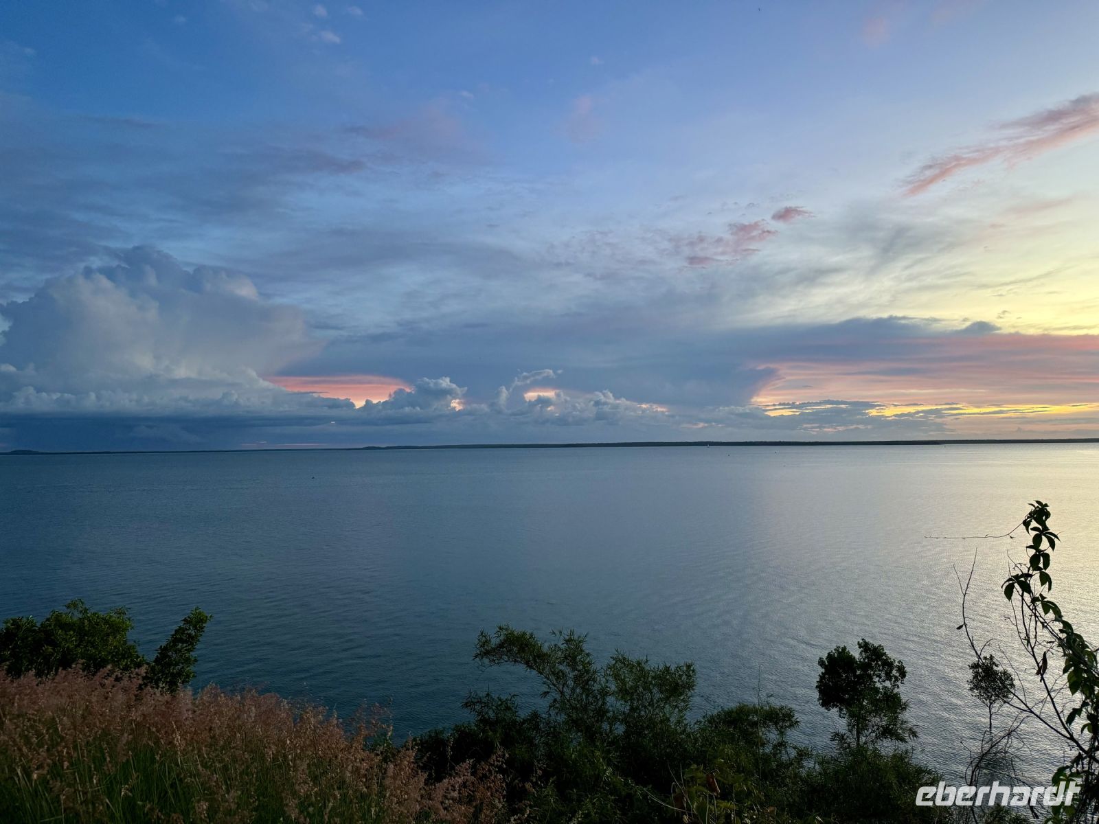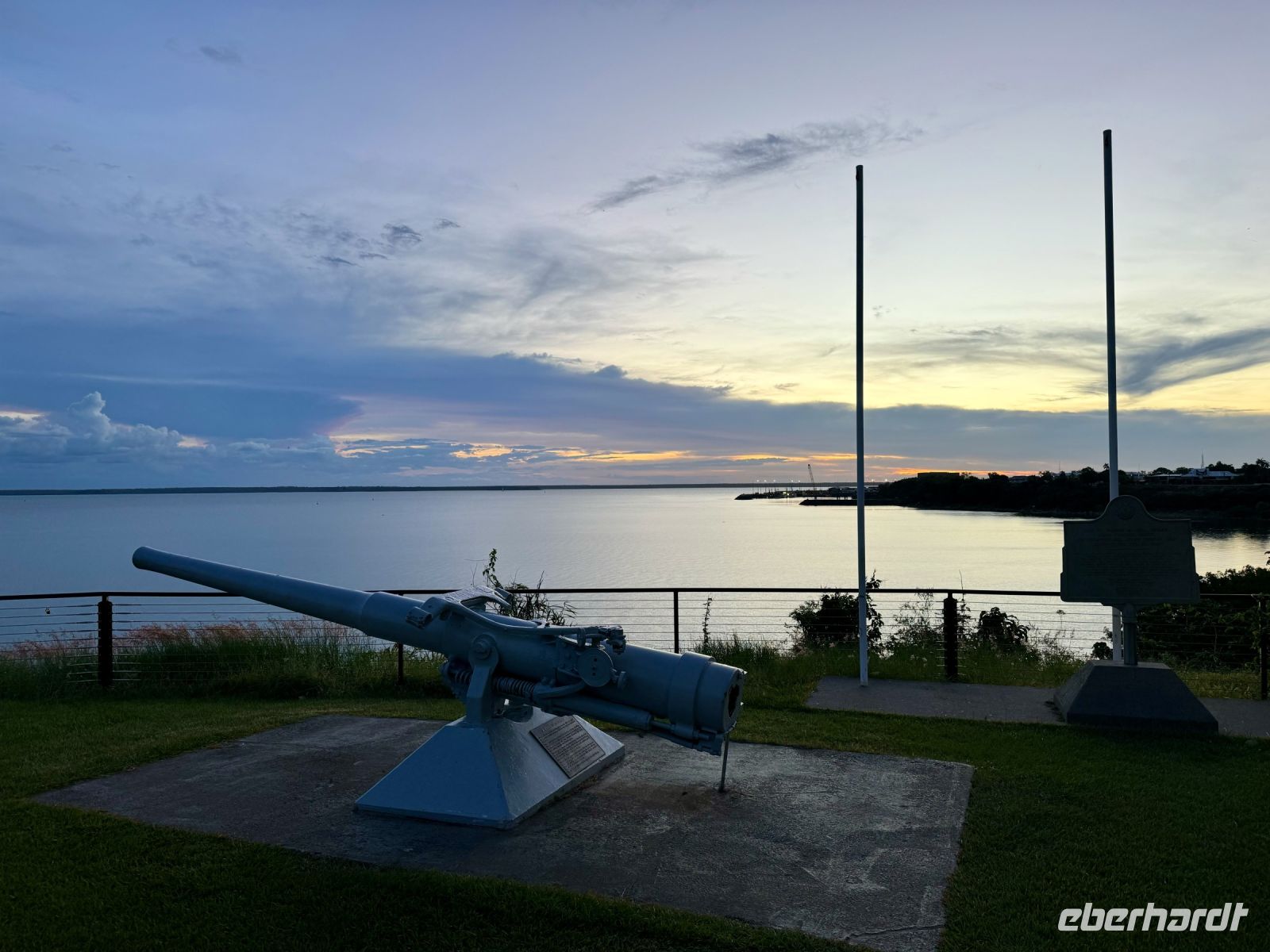 Unser Abenteuer im Outback geht heute ganz entspannt zu Ende. Erst am Mittag werden wir von Andrew abgeholt und zum kleinen Flughafen von Alice Springs gebracht. Wir verabschieden uns von Eve und Andrew jeweils mit einem großen Applaus und gehen dann ins Terminal, wo die Bordkarten bereits ausgedruckt auf uns warten. Wir fliegen diesmal mit einer Embraer E190, dem bisher kleinsten Flugzeug auf unserer Reise. Nach dem Start können wir sehr gut die lange Linie der MacDonnell Ranges ausmachen und fotografieren. Die reine Flugzeit beträgt nur etwa 1,5 Stunden. Schon beim Verlassen des Flugzeugs werden wir von der schwülen Hitze regelrecht erschlagen. Es ist nur 4 bis 5 Grad wärmer als in Alice Springs, aber die Luftfeuchtigkeit ist wesentlich höher. In Darwin empfangen uns unsere neue Reiseleiterin Esther (ursprünglich aus Basel) und unsere Busfahrerin Melinda. Sie möchten uns ab morgen den Kakadu-Nationalpark zeigen. Heute fahren wir jedoch nur noch zum Hotel, wobei uns Esther und Melinda zur Orientierung auf dem Weg noch die Esplanade, das Parlament, die Mitchell Street mit ihren Geschäften und Kneipen sowie die St Mary's Cathedral zeigen. Mit einigen Gästen treffe ich mich nach dem Check-In an der Rezeption und laufe hinunter zum Ufer. Wir wollen uns noch den Sonnenuntergang anschauen, der dank der Gewitterwolken am Horizont ganz besonders dramatisch ausfällt. Als besonders — und zwar ganz besonders gut — empfinden wir das in der Halbpension inkludierte Abendessen im Hotelrestaurant.