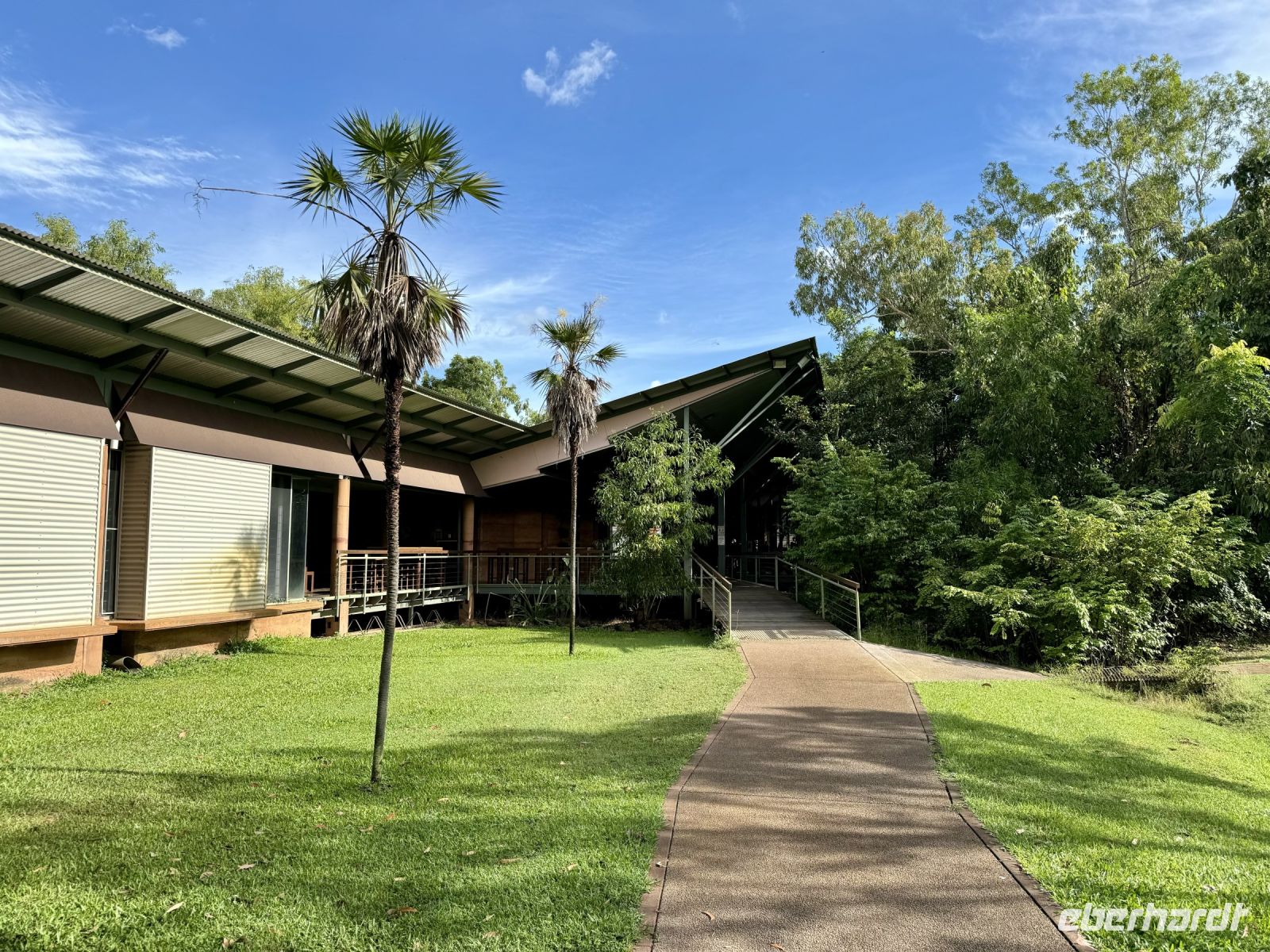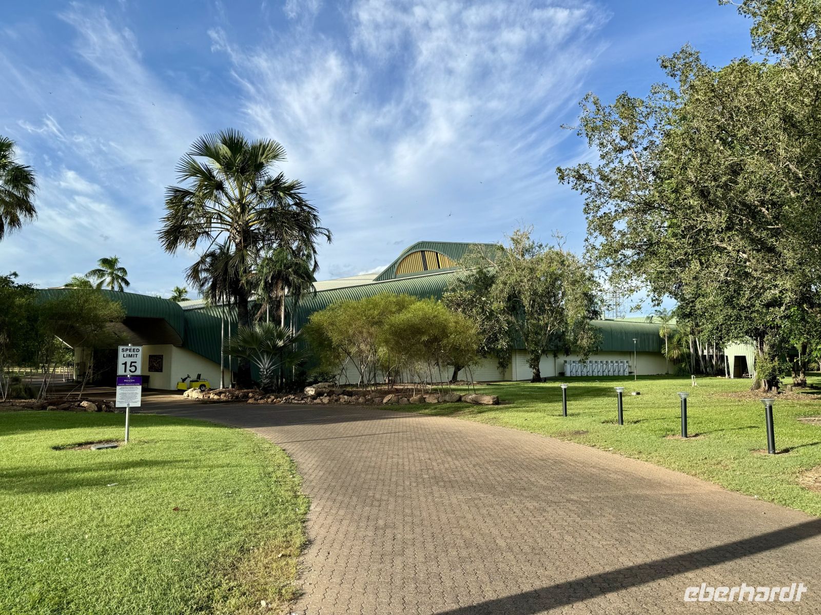 Wie vorab mitgeteilt, können wir heute leider nicht bis ins Arnhemland fahren, da die Straße dorthin nach der Regenzeit immer noch überschwemmt ist. Deshalb gibt es ein Alternativprogramm, das uns ebenfalls Leben und Kultur der Aboriginals näherbringen soll. Bevor wir Darwin jedoch verlassen, halten wir an einem Aussichtspunkt, von wo aus wir einen Blick zurück auf das Stadtzentrum werfen können. Am Wasser ist es ganz schön windig, wodurch wir die Wärme (noch) nicht so spüren. Trotzdem habe ich heute zum ersten Mal meine kurze Wanderhose an, denn Esther hat für den Nationalpark bis zu 37 Grad angekündigt! Pudakul heißt das kleine familiengeführte Erlebniszentrum, in dem wir auf einer Führung ganz viel über die Sitten und Gebräuche der lokalen Aboriginal-Familien lernen, beginnend mit Pflanzen und Bäumen, deren Rinde oder Früchte u. a. als Heilmittel für verschiedene Krankheiten dienen. Wir erfahren außerdem, wie ein Didgeridoo hergestellt wird, dürfen auch ein paar Tönen lauschen, erhalten Einblicke in die Verwandtschaftsverhältnisse und Bestrafungsrituale, und werden auf Wunsch am Unterarm mit einer Schildkröte (Frauen) bzw. einem Krokodil bemalt (Männer). Diese kleinen „Tattoos“ werden uns nun ein, zwei Tage als Erinnerung begleiten. Im Flechten von Körben und Taschen benötigen wir im Schnitt noch sehr viel Übung; im Speerwerfen schneiden wir schon besser ab. Trotzdem bin ich froh, dass wir uns unser Abendessen als Gruppe nicht selbst erjagen müssen. Die Zeit vergeht wie im Flug und unser Aufbruch rückt viel zu schnell heran. Ein kleines Mittagsbuffet mit Pies, Wraps und Obst rundet unseren informativen Besuch bei der sehr herzlichen Familie ab. Nun geht es hinein in den riesigen Kakadu-Nationalpark, der rund halb so groß ist wie die Schweiz. Bis zum kleinen Ort Jabiru im Zentrum des Nationalparks benötigen wir mit einer kleinen Foto-/Toilettenpause noch ungefähr zwei Stunden. Der Arnhem Highway führt fast immer geradeaus durch weitläufige Buschlandschaften. Ab und zu sehen wir ein Wallaby am Straßenrand entlanghüpfen, eines überquert sogar vor uns die Straße. Auch ein kleiner Waran begibt sich gemächlich auf die große Reise auf die andere Straßenseite, kann von Melinda aber geschickt umfahren werden. Kurz vor Jabiru führt uns Esther durch das Besucherzentrum des Nationalparks, in dem wir anhand von Modellen von Schlangen, Krokodilen und anderen Tieren in die Fauna des Parks eingeführt werden. Auch unser Hotel in Jabiru ist in Form eines riesigen grünen Krokodils gestaltet — so langsam haben wir die Botschaft verstanden und sind beständig auf der Hut! Durch das riesige Maul gehen wir hinein, während sich unsere Zimmer weiter hinten im Bauch des Ungetüms befinden.