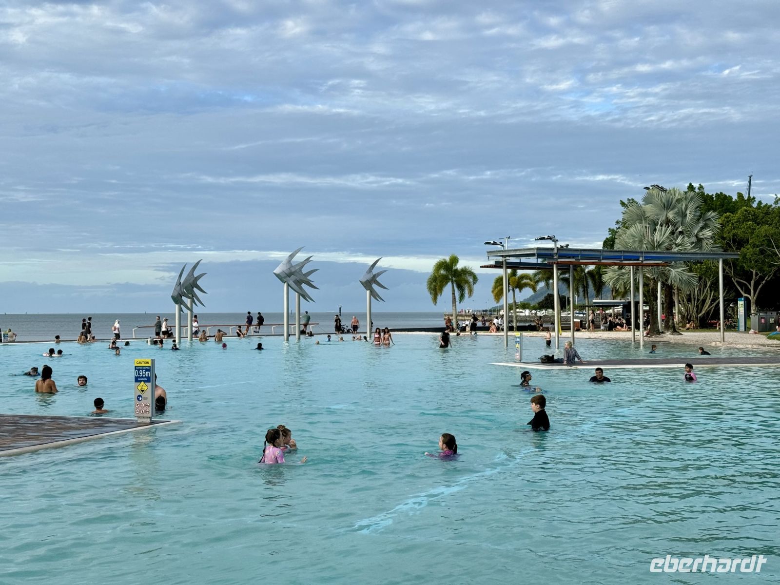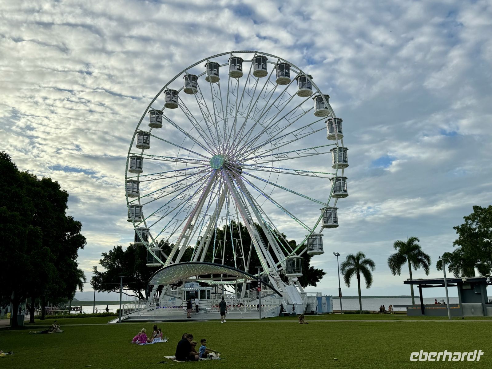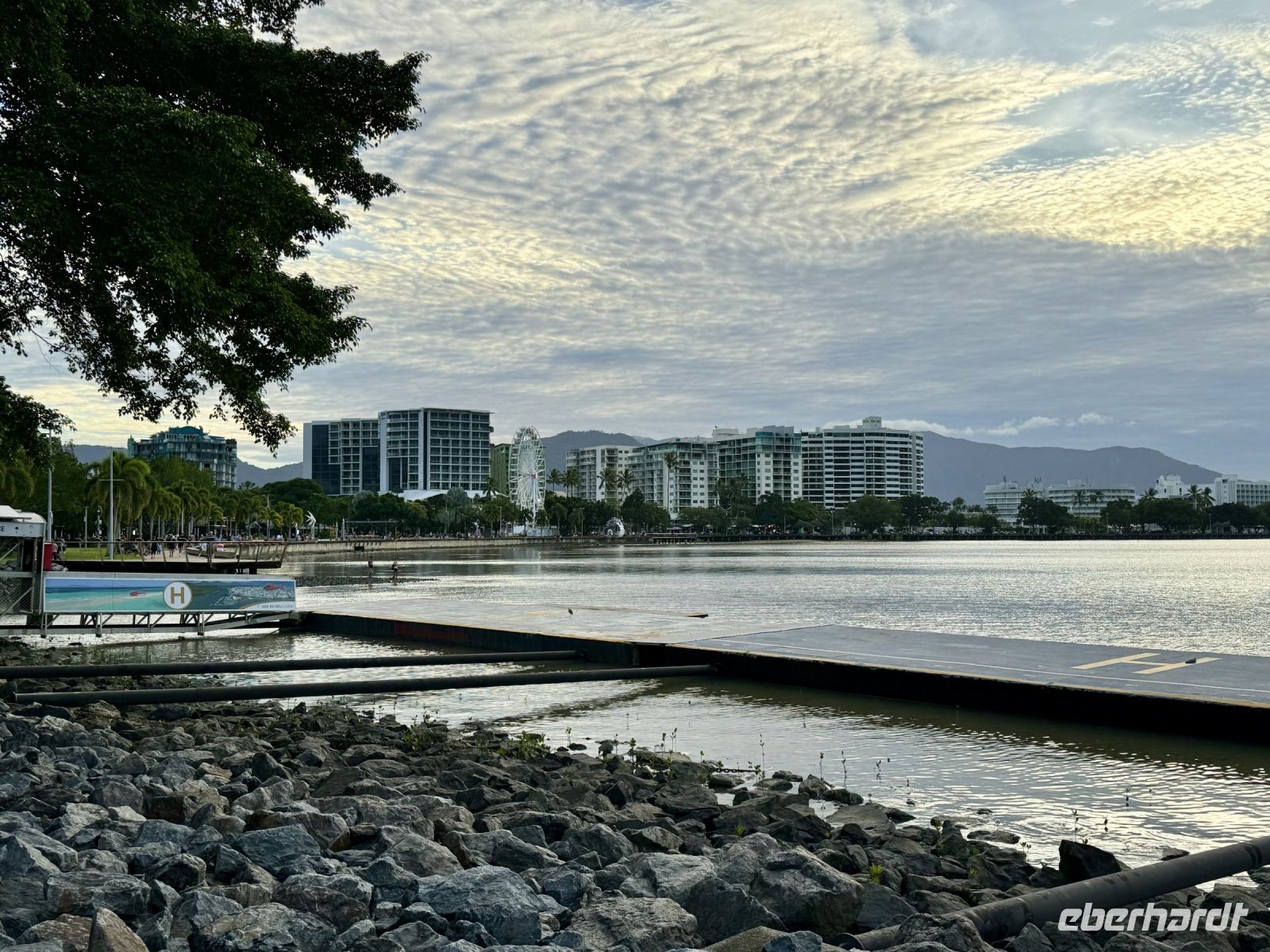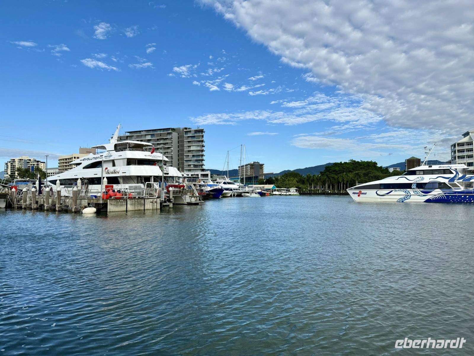 Überpünktlich und gut gelaunt wie immer steht Melinda am Morgen vor dem Hotel bereit. Dafür bewundere ich sie wirklich. Für uns ist es die letzte zeitige Abfahrt vor dem Frühstück auf dieser Reise und wir bekommen vom Hotel wieder Frühstücksboxen in die Hand gedrückt. Nach einer halben Stunde sind wir am Flughafen, verabschieden uns von Melinda, nehmen die bereits ausgedruckten Bordkarten in Empfang und dürfen unsere Koffer an unserem eigenen Schalter nur für die Eberhardt-Gruppe abgeben (extra namentlich ausgeschrieben). Was für ein Service! Es kommt sogar noch besser! Im Flugzeug (wieder eine Embraer E190) sitzen wir als Gruppe ganz vorne, was für ca. die Hälfte von uns ein kostenloses Upgrade auf Business-Class-Sitze bedeutet. Wir fliegen über den Kakadu-Nationalpark in Richtung Osten, landen irgendwo mitten im Urwald im Nirgendwo und im strömenden Regen zwischen — Fluggäste raus, Fluggäste rein — dann geht es weiter Richtung Cairns. Freundlicherweise lässt uns der Flugkapitän während der Pause ein Foto vom Cockpit machen. In Cairns haben wir zur Überraschung mit Stefan einen jungen Mann als Busfahrer, der erst vor einigen Jahren von Deutschland nach Australien ausgewandert ist. Er liebt die entspannte Lebensart in Cairns und gibt uns auf der Fahrt zum Hotel gleich ein paar Insider-Tipps. Leider sind wir trotz gefahrenem Umweg nach 15 bis 20 Minuten schon da — gern hätten wir ihn noch weiter ausgefragt. Unser Hotel liegt nur wenige Minuten von Lagune und Hafen entfernt direkt an der Uferpromenade, ist noch recht neu und wirkt sehr eindrucksvoll. Fast alle Zimmer sind schon bezugsfertig; auf die anderen drei müssen wir auch nur kurz warten. Am Nachmittag bietet sich ein Spaziergang zum Hafen an. Direkt im Meer baden können wir in Cairns mangels Strand leider nicht, aber dafür gibt es das Schwimmbecken der Lagune. Gleich vor dem Hotel steht auch ein Riesenrad für einen Blick auf Cairns aus der Vogelperspektive. Meine Halbpensionsgäste kommen in den Genuss eines kleinen Abendspaziergangs zum Hafen und eines leckeren Menüs, bei dem auf Wunsch auch Känguru und Krokodil zur Auswahl stehen.