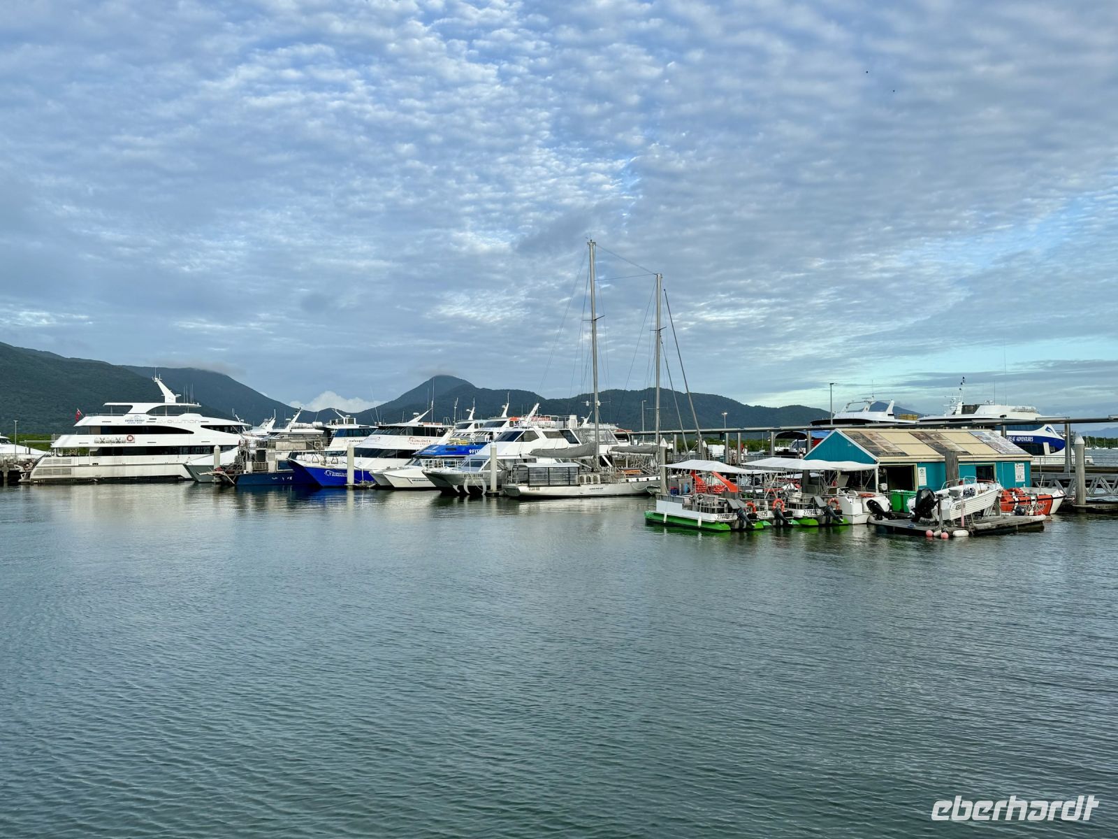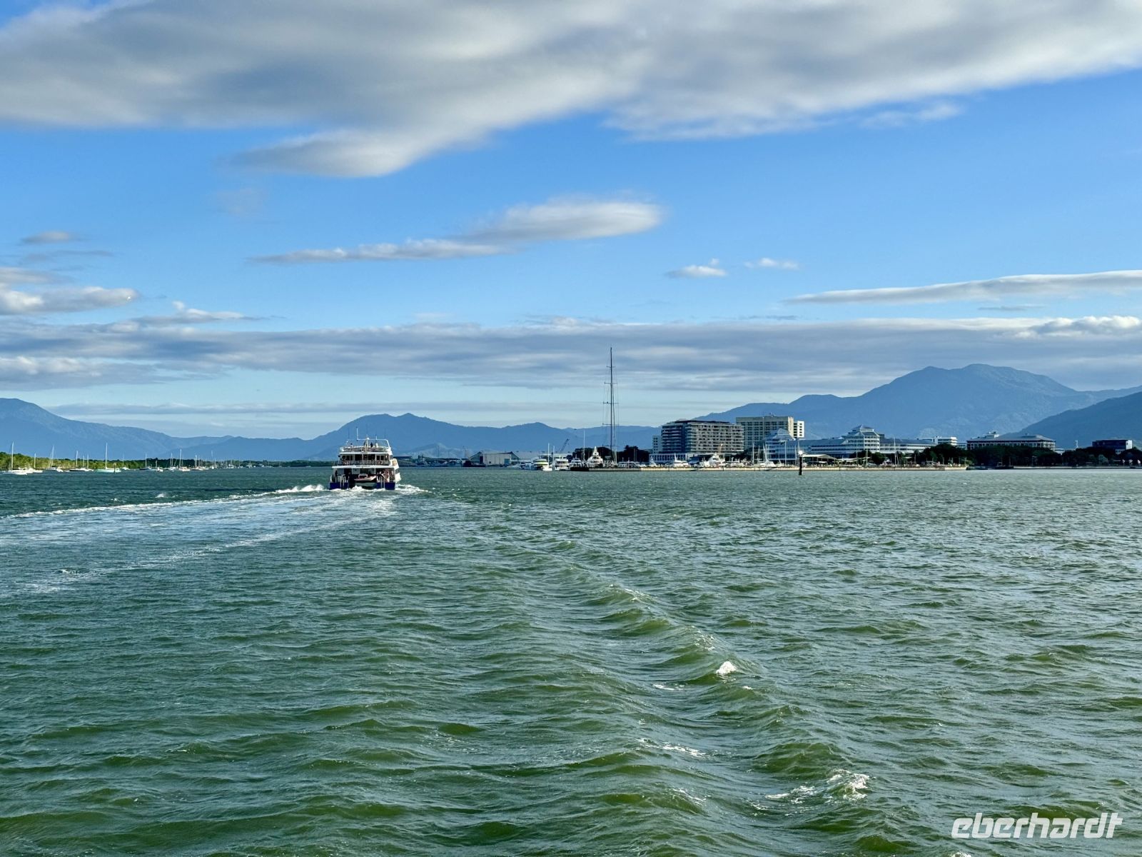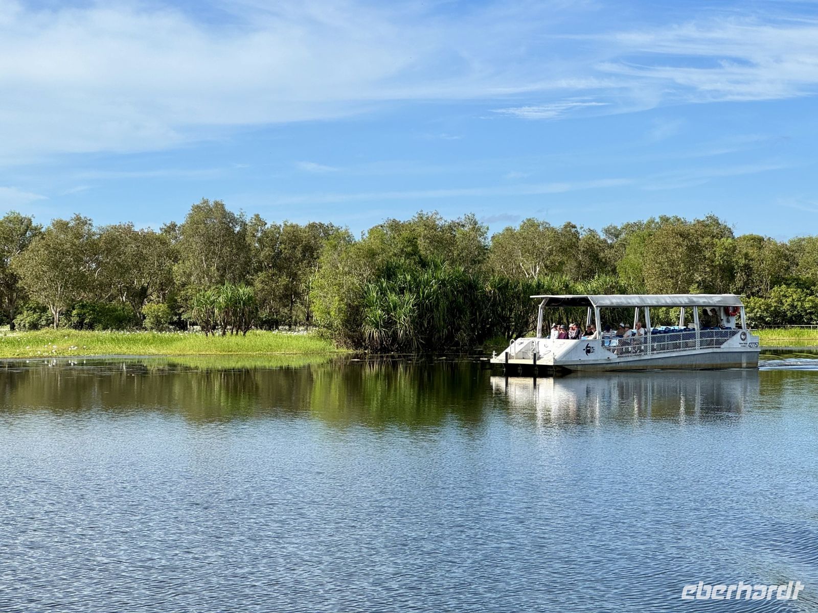 Überpünktlich und gut gelaunt wie immer steht Melinda am Morgen vor dem Hotel bereit. Dafür bewundere ich sie wirklich. Für uns ist es die letzte zeitige Abfahrt vor dem Frühstück auf dieser Reise und wir bekommen vom Hotel wieder Frühstücksboxen in die Hand gedrückt. Nach einer halben Stunde sind wir am Flughafen, verabschieden uns von Melinda, nehmen die bereits ausgedruckten Bordkarten in Empfang und dürfen unsere Koffer an unserem eigenen Schalter nur für die Eberhardt-Gruppe abgeben (extra namentlich ausgeschrieben). Was für ein Service! Es kommt sogar noch besser! Im Flugzeug (wieder eine Embraer E190) sitzen wir als Gruppe ganz vorne, was für ca. die Hälfte von uns ein kostenloses Upgrade auf Business-Class-Sitze bedeutet. Wir fliegen über den Kakadu-Nationalpark in Richtung Osten, landen irgendwo mitten im Urwald im Nirgendwo und im strömenden Regen zwischen — Fluggäste raus, Fluggäste rein — dann geht es weiter Richtung Cairns. Freundlicherweise lässt uns der Flugkapitän während der Pause ein Foto vom Cockpit machen. In Cairns haben wir zur Überraschung mit Stefan einen jungen Mann als Busfahrer, der erst vor einigen Jahren von Deutschland nach Australien ausgewandert ist. Er liebt die entspannte Lebensart in Cairns und gibt uns auf der Fahrt zum Hotel gleich ein paar Insider-Tipps. Leider sind wir trotz gefahrenem Umweg nach 15 bis 20 Minuten schon da — gern hätten wir ihn noch weiter ausgefragt. Unser Hotel liegt nur wenige Minuten von Lagune und Hafen entfernt direkt an der Uferpromenade, ist noch recht neu und wirkt sehr eindrucksvoll. Fast alle Zimmer sind schon bezugsfertig; auf die anderen drei müssen wir auch nur kurz warten. Am Nachmittag bietet sich ein Spaziergang zum Hafen an. Direkt im Meer baden können wir in Cairns mangels Strand leider nicht, aber dafür gibt es das Schwimmbecken der Lagune. Gleich vor dem Hotel steht auch ein Riesenrad für einen Blick auf Cairns aus der Vogelperspektive. Meine Halbpensionsgäste kommen in den Genuss eines kleinen Abendspaziergangs zum Hafen und eines leckeren Menüs, bei dem auf Wunsch auch Känguru und Krokodil zur Auswahl stehen.