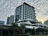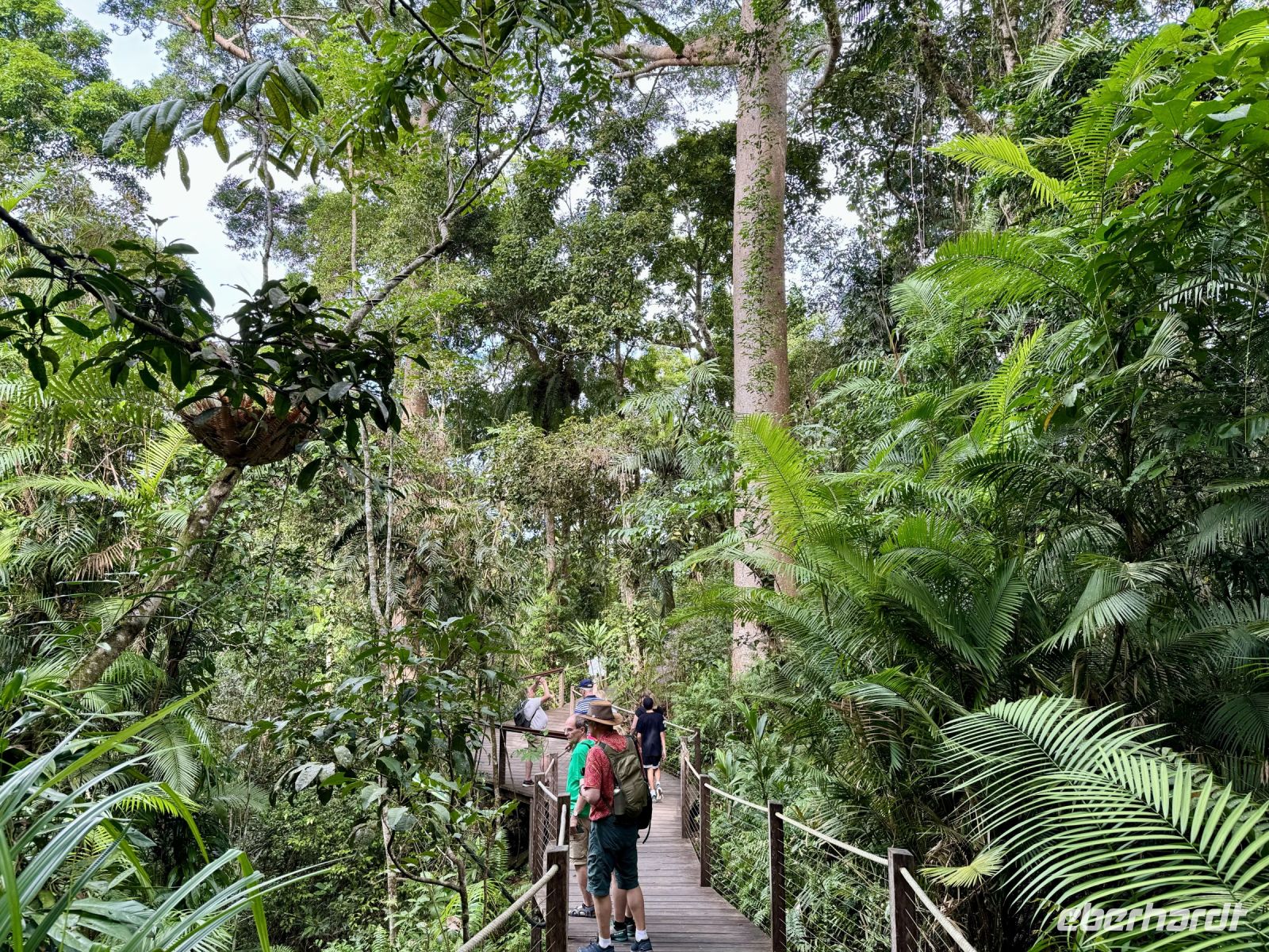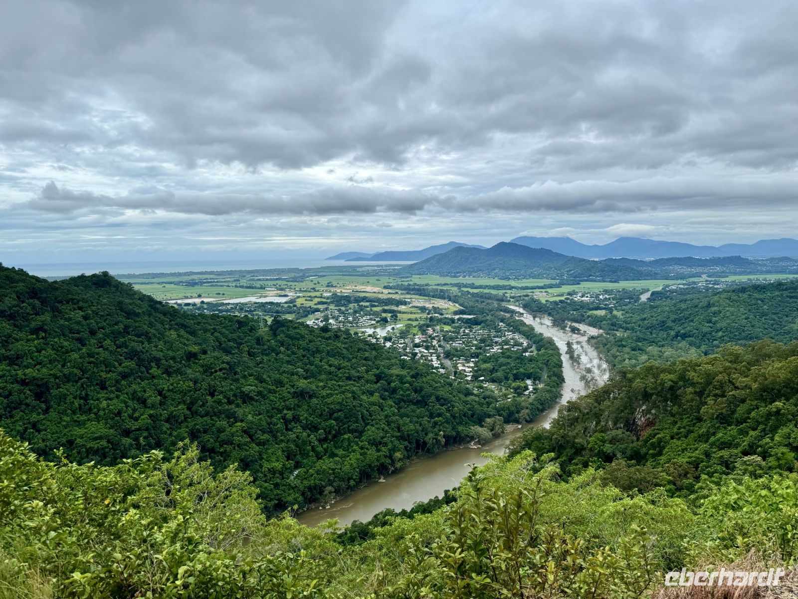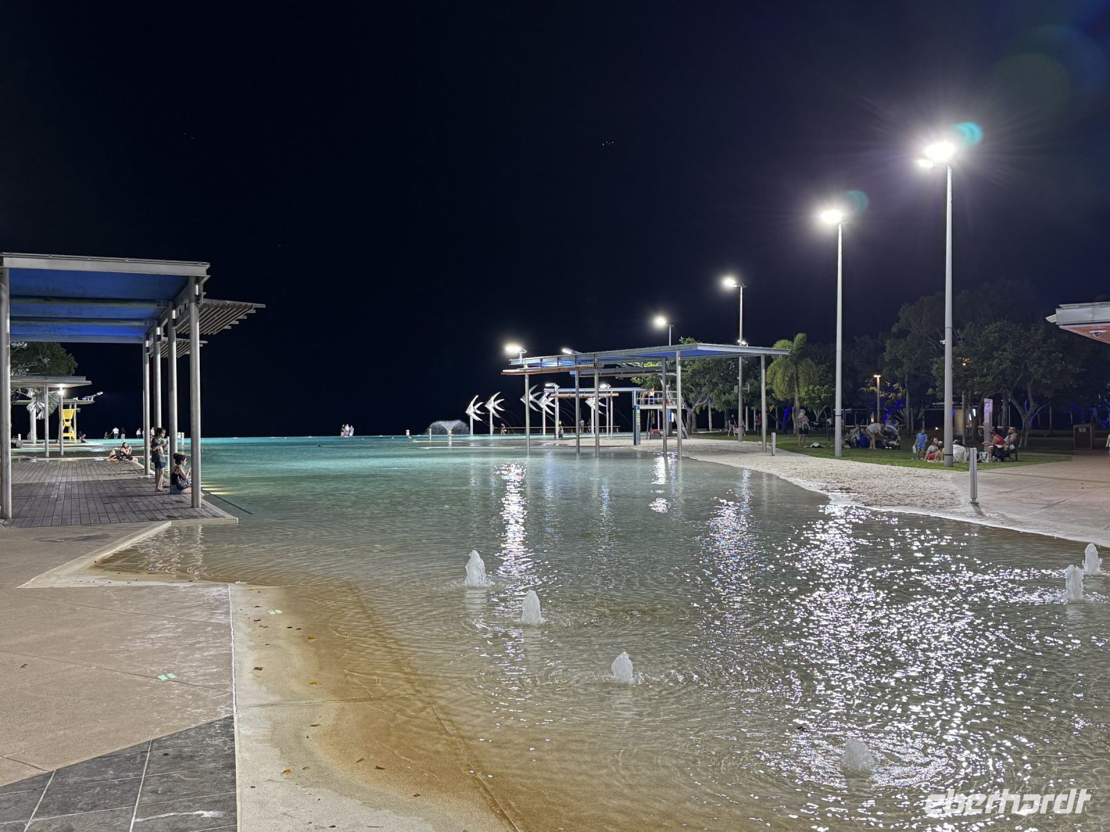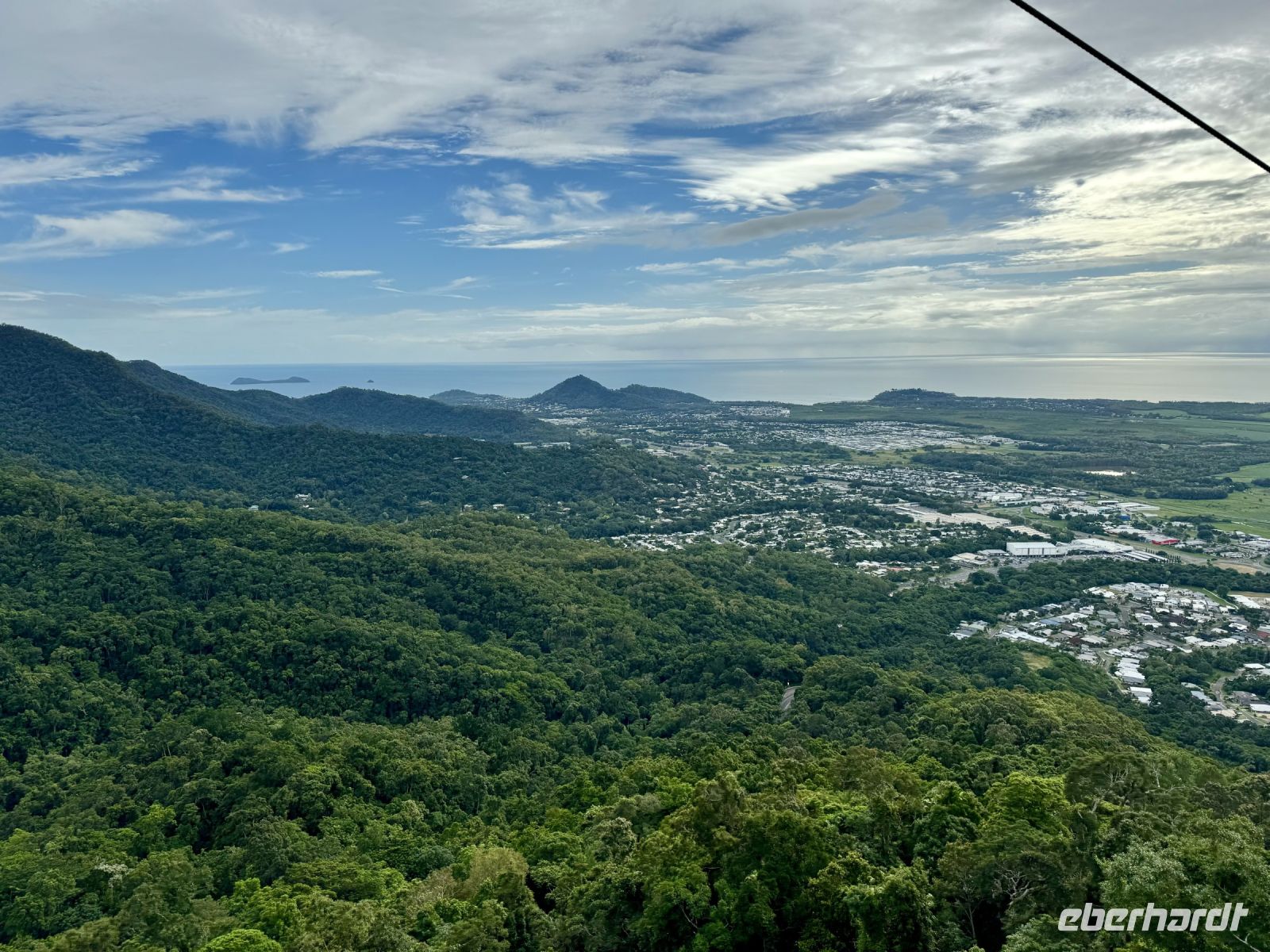 Überpünktlich und gut gelaunt wie immer steht Melinda am Morgen vor dem Hotel bereit. Dafür bewundere ich sie wirklich. Für uns ist es die letzte zeitige Abfahrt vor dem Frühstück auf dieser Reise und wir bekommen vom Hotel wieder Frühstücksboxen in die Hand gedrückt. Nach einer halben Stunde sind wir am Flughafen, verabschieden uns von Melinda, nehmen die bereits ausgedruckten Bordkarten in Empfang und dürfen unsere Koffer an unserem eigenen Schalter nur für die Eberhardt-Gruppe abgeben (extra namentlich ausgeschrieben). Was für ein Service! Es kommt sogar noch besser! Im Flugzeug (wieder eine Embraer E190) sitzen wir als Gruppe ganz vorne, was für ca. die Hälfte von uns ein kostenloses Upgrade auf Business-Class-Sitze bedeutet. Wir fliegen über den Kakadu-Nationalpark in Richtung Osten, landen irgendwo mitten im Urwald im Nirgendwo und im strömenden Regen zwischen — Fluggäste raus, Fluggäste rein — dann geht es weiter Richtung Cairns. Freundlicherweise lässt uns der Flugkapitän während der Pause ein Foto vom Cockpit machen. In Cairns haben wir zur Überraschung mit Stefan einen jungen Mann als Busfahrer, der erst vor einigen Jahren von Deutschland nach Australien ausgewandert ist. Er liebt die entspannte Lebensart in Cairns und gibt uns auf der Fahrt zum Hotel gleich ein paar Insider-Tipps. Leider sind wir trotz gefahrenem Umweg nach 15 bis 20 Minuten schon da — gern hätten wir ihn noch weiter ausgefragt. Unser Hotel liegt nur wenige Minuten von Lagune und Hafen entfernt direkt an der Uferpromenade, ist noch recht neu und wirkt sehr eindrucksvoll. Fast alle Zimmer sind schon bezugsfertig; auf die anderen drei müssen wir auch nur kurz warten. Am Nachmittag bietet sich ein Spaziergang zum Hafen an. Direkt im Meer baden können wir in Cairns mangels Strand leider nicht, aber dafür gibt es das Schwimmbecken der Lagune. Gleich vor dem Hotel steht auch ein Riesenrad für einen Blick auf Cairns aus der Vogelperspektive. Meine Halbpensionsgäste kommen in den Genuss eines kleinen Abendspaziergangs zum Hafen und eines leckeren Menüs, bei dem auf Wunsch auch Känguru und Krokodil zur Auswahl stehen.