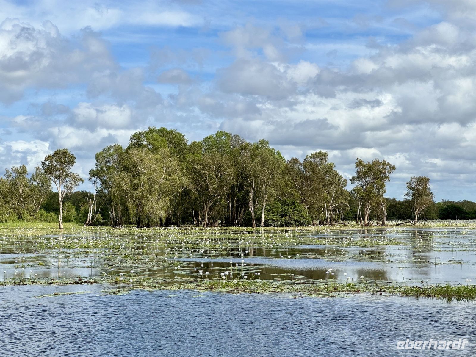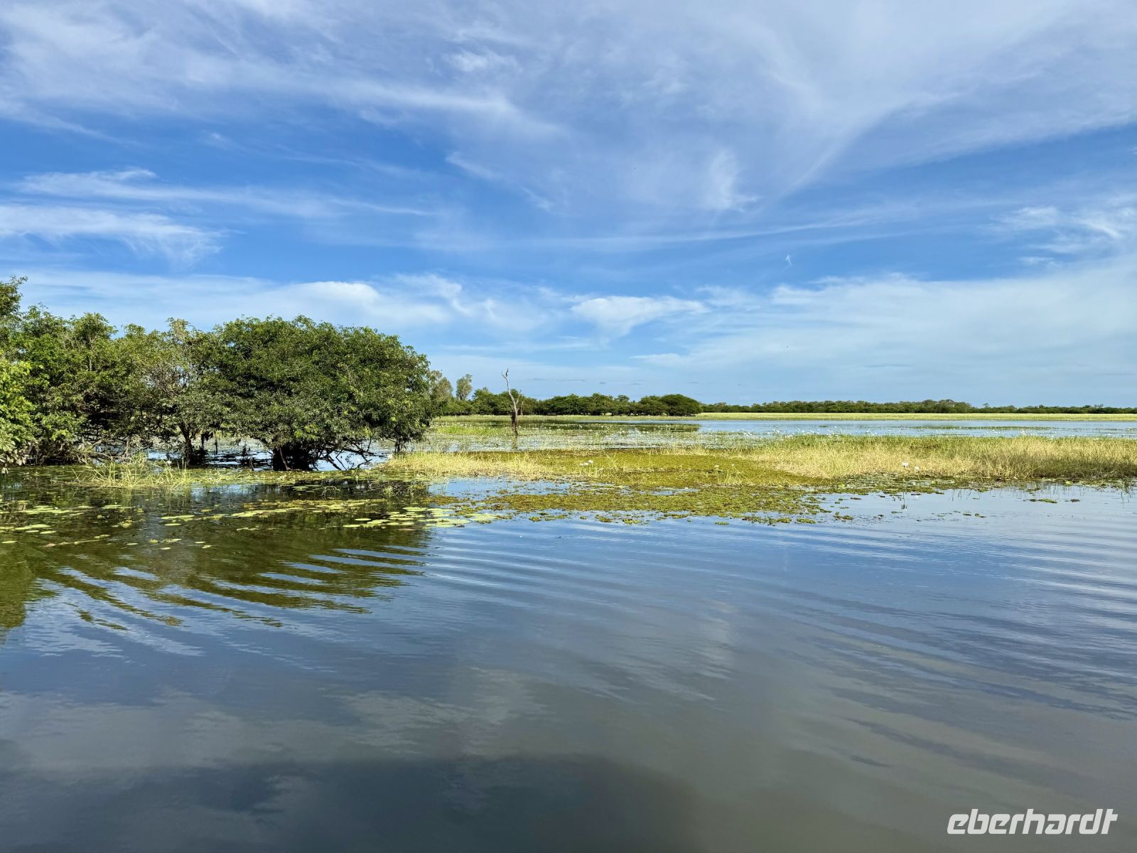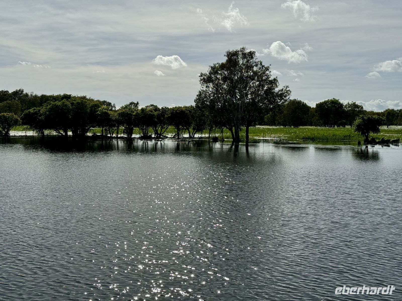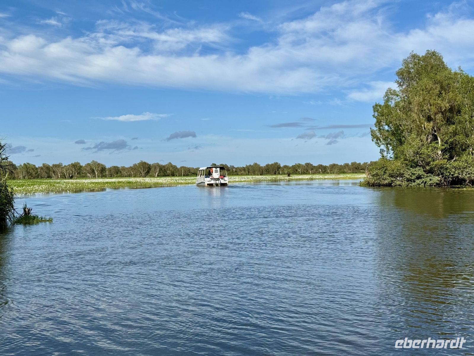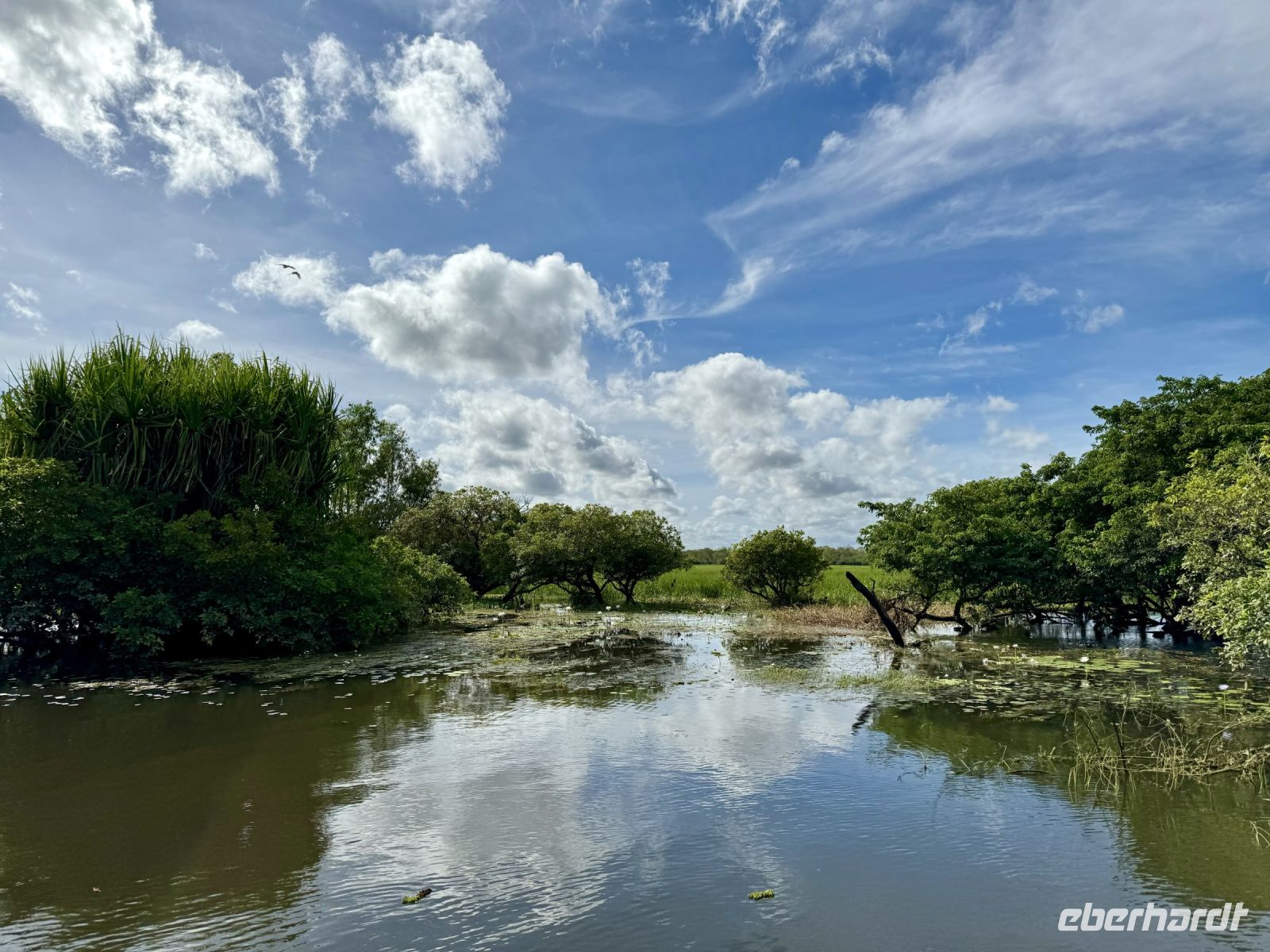 Vom Frühstück im Kopf des Krokodilhotels geht es als erster Programmpunkt an Bord eines kleinen Ausflugsboots auf dem South Alligator River und auf die Suche nach echten Krokodilen. Nach der Regenzeit sind viele Ufergebiete im Kakadu-Nationalpark noch überflutet, das Wasser ist überall um uns herum. Wir sind fernab der Zivilisation; vom Motor des Bootes abgesehen sind kaum unnatürliche Geräusche zu vernehmen. Die Natur strahlt Ruhe und Frieden aus, wenngleich der Tod nur wenige Zentimeter entfernt neben oder unter uns lauert. Ein mulmiges Gefühl, als wir tatsächlich — zum Glück in einiger Entfernung — zwischen den Wurzeln eines Baumes die Augen und das Maul eines mittelgroßen Krokodils knapp aus dem Wasser ragen sehen. So gern wir uns gewünscht haben, Krokodile zu sehen: die Gänse, Schlangenhalsvögel und Schwärme von weißen Kakadus sind uns wesentlich sympathischer. Dann die Meldung über Funk: das zweite Boot hat ein weiteres Krokodil gefunden, größer und am Ufer liegend. Nun denn, wir fahren hin und machen Fotos von diesem urzeitlichen Ungetüm, das regungslos im Unterholz vor sich hin döst. Bloß nicht zu lange bleiben, denn man weiß ja nie so richtig, wie lange das Sättigungsgefühl eines Krokodils noch anhalten mag. Zur Not stünden aber noch Wasserbüffel auf dem Speiseplan, von denen wir zwei Exemplare in der Nähe des Bootsanlegers sehen. Mein Sättigungsgefühl hält immer maximal zwei Stunden, das weiß ich ganz genau, weshalb ich mich riesig auf das nun folgende Mittagsbuffet in der Cooinda Lodge freue. Warmes Hähnchenfleisch, grüner Salat, Coleslaw, Schokokuchen … sie wissen anscheinend genau, womit sie mich als Reiseleiter glücklich machen können, und meine Gäste ebenfalls. Am Nachmittag besuchen wir dann ein weiteres, sehr interessantes Kulturzentrum der Aborigines und schauen uns am sog. „Nourlangie Rock“ Felsmalereien an, die teilweise viele tausend Jahre alt sind. Die Darstellungen umfassen Jagdszenen und Traumzeitlegenden, die auch in der umliegenden Landschaft als Bezeichnungen und charakteristische Formationen wieder auftauchen. Die Kulisse wird dominiert von dichter Buschvegetation und Felsen aus rotem Sandstein. In der Ferne können wir zudem das Arnhem-Plateau ausmachen. Im Vergleich zum Outback herrscht hier allerdings schon wieder eine schwüle Hitze, was jegliche Bewegung im Freien gleich wieder etwas beschwerlicher macht. Im angenehm klimatisierten Bus können wir uns zwischendurch immer wieder ausruhen, auch auf der Rückfahrt nach Darwin. Esther zeigt uns derweil Videos, die die Arbeit der Ranger im Nationalpark dokumentieren, von gefährlichen Auseinandersetzungen mit Krokodilen bis hin zu ebenso gefährlichen Auseinandersetzungen mit uneinsichtigen Wilderern. Unterwegs machen wir einen Stopp an einem charakteristischen australischen Roadhouse, der Corroboree Park Tavern (natürlich mit Krokodil auf dem Schild), und genehmigen uns ein erfrischendes Eis. Unser Hotel in Darwin kennen wir ja bereits, nur von Esther müssen wir uns leider schon wieder verabschieden. Sie war ein toller Guide für den Kakadu-Nationalpark und ein sehr angenehmer Mensch dazu.