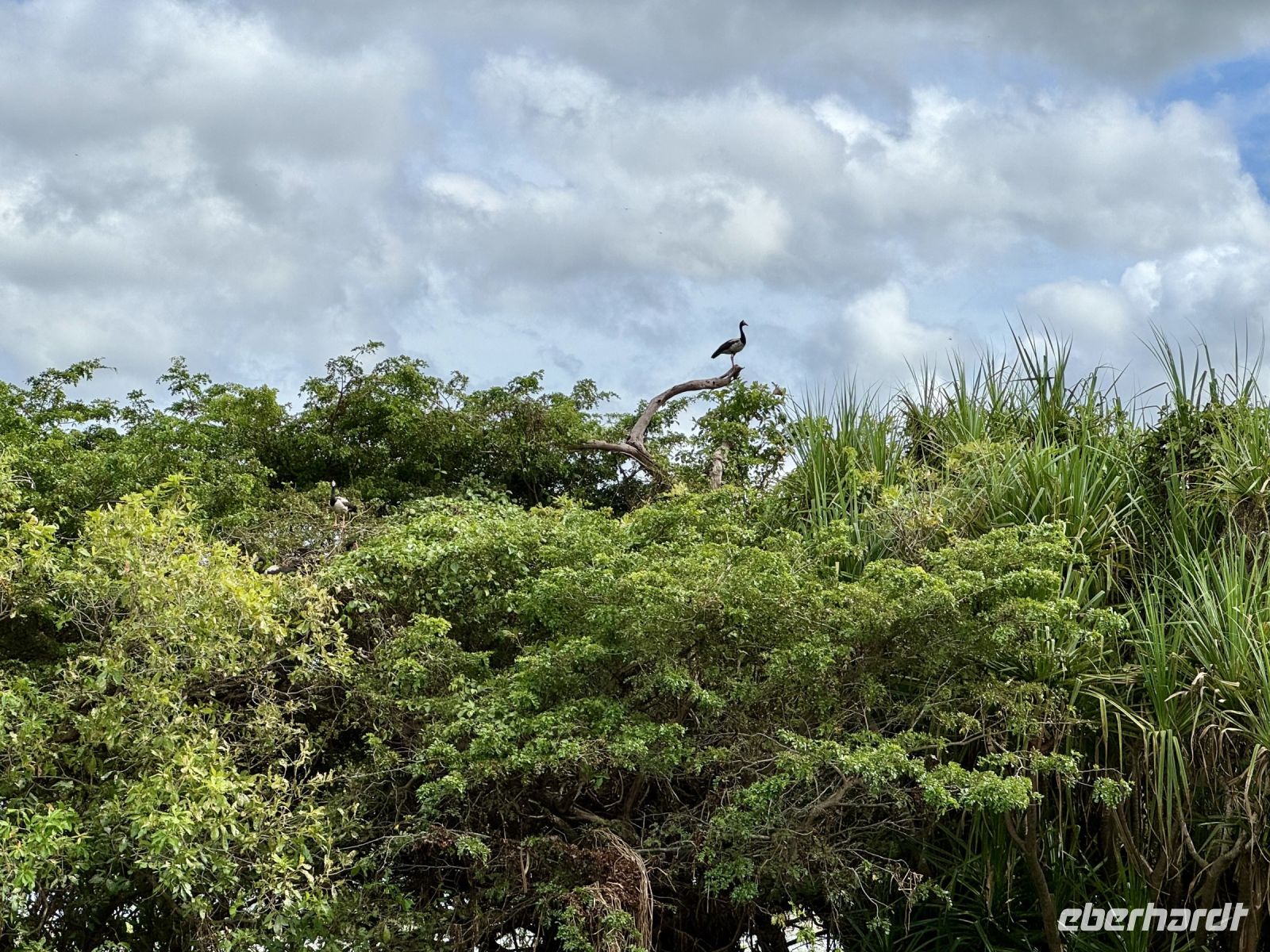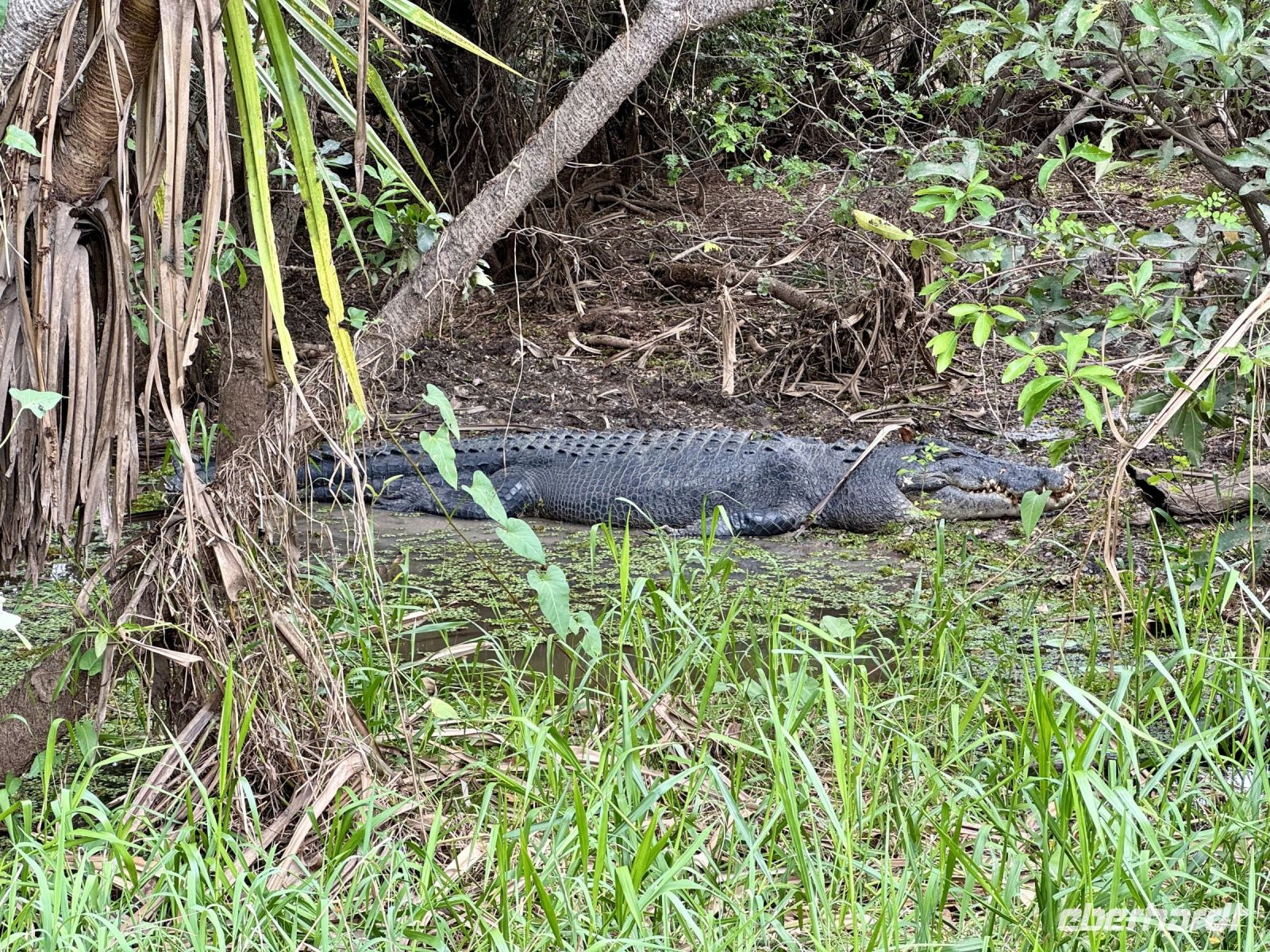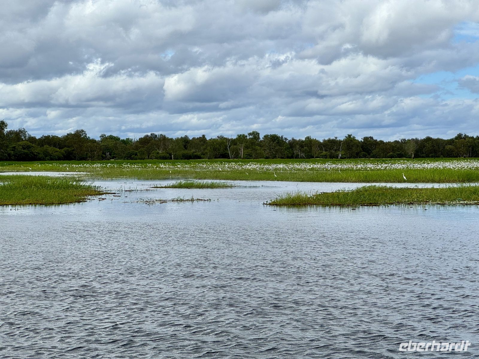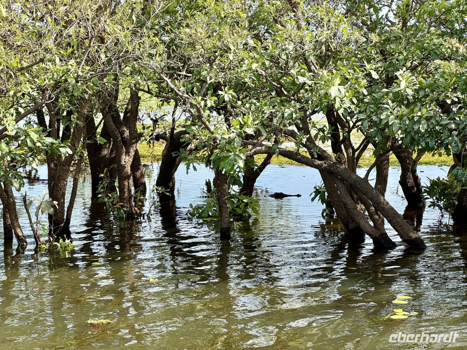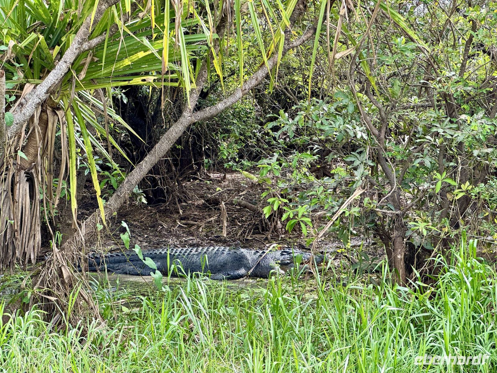 Vom Frühstück im Kopf des Krokodilhotels geht es als erster Programmpunkt an Bord eines kleinen Ausflugsboots auf dem South Alligator River und auf die Suche nach echten Krokodilen. Nach der Regenzeit sind viele Ufergebiete im Kakadu-Nationalpark noch überflutet, das Wasser ist überall um uns herum. Wir sind fernab der Zivilisation; vom Motor des Bootes abgesehen sind kaum unnatürliche Geräusche zu vernehmen. Die Natur strahlt Ruhe und Frieden aus, wenngleich der Tod nur wenige Zentimeter entfernt neben oder unter uns lauert. Ein mulmiges Gefühl, als wir tatsächlich — zum Glück in einiger Entfernung — zwischen den Wurzeln eines Baumes die Augen und das Maul eines mittelgroßen Krokodils knapp aus dem Wasser ragen sehen. So gern wir uns gewünscht haben, Krokodile zu sehen: die Gänse, Schlangenhalsvögel und Schwärme von weißen Kakadus sind uns wesentlich sympathischer. Dann die Meldung über Funk: das zweite Boot hat ein weiteres Krokodil gefunden, größer und am Ufer liegend. Nun denn, wir fahren hin und machen Fotos von diesem urzeitlichen Ungetüm, das regungslos im Unterholz vor sich hin döst. Bloß nicht zu lange bleiben, denn man weiß ja nie so richtig, wie lange das Sättigungsgefühl eines Krokodils noch anhalten mag. Zur Not stünden aber noch Wasserbüffel auf dem Speiseplan, von denen wir zwei Exemplare in der Nähe des Bootsanlegers sehen. Mein Sättigungsgefühl hält immer maximal zwei Stunden, das weiß ich ganz genau, weshalb ich mich riesig auf das nun folgende Mittagsbuffet in der Cooinda Lodge freue. Warmes Hähnchenfleisch, grüner Salat, Coleslaw, Schokokuchen … sie wissen anscheinend genau, womit sie mich als Reiseleiter glücklich machen können, und meine Gäste ebenfalls. Am Nachmittag besuchen wir dann ein weiteres, sehr interessantes Kulturzentrum der Aborigines und schauen uns am sog. „Nourlangie Rock“ Felsmalereien an, die teilweise viele tausend Jahre alt sind. Die Darstellungen umfassen Jagdszenen und Traumzeitlegenden, die auch in der umliegenden Landschaft als Bezeichnungen und charakteristische Formationen wieder auftauchen. Die Kulisse wird dominiert von dichter Buschvegetation und Felsen aus rotem Sandstein. In der Ferne können wir zudem das Arnhem-Plateau ausmachen. Im Vergleich zum Outback herrscht hier allerdings schon wieder eine schwüle Hitze, was jegliche Bewegung im Freien gleich wieder etwas beschwerlicher macht. Im angenehm klimatisierten Bus können wir uns zwischendurch immer wieder ausruhen, auch auf der Rückfahrt nach Darwin. Esther zeigt uns derweil Videos, die die Arbeit der Ranger im Nationalpark dokumentieren, von gefährlichen Auseinandersetzungen mit Krokodilen bis hin zu ebenso gefährlichen Auseinandersetzungen mit uneinsichtigen Wilderern. Unterwegs machen wir einen Stopp an einem charakteristischen australischen Roadhouse, der Corroboree Park Tavern (natürlich mit Krokodil auf dem Schild), und genehmigen uns ein erfrischendes Eis. Unser Hotel in Darwin kennen wir ja bereits, nur von Esther müssen wir uns leider schon wieder verabschieden. Sie war ein toller Guide für den Kakadu-Nationalpark und ein sehr angenehmer Mensch dazu.
