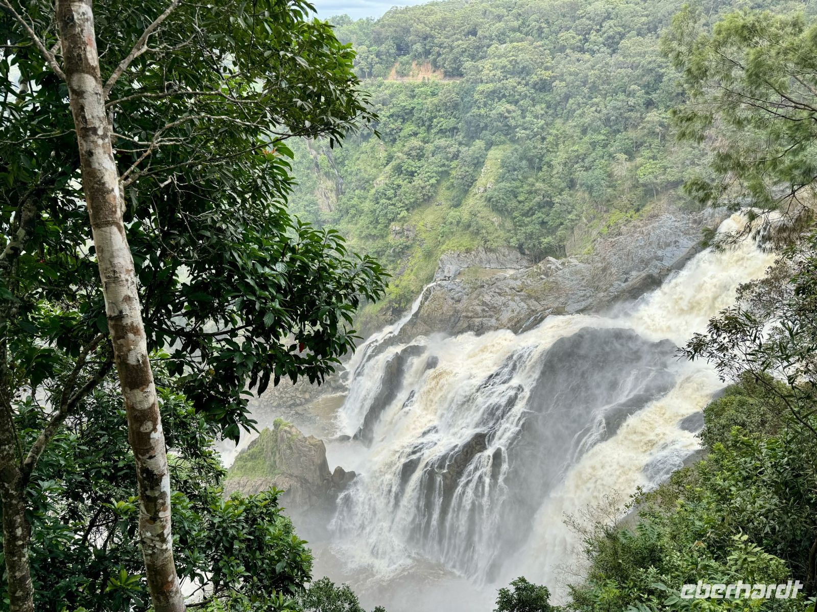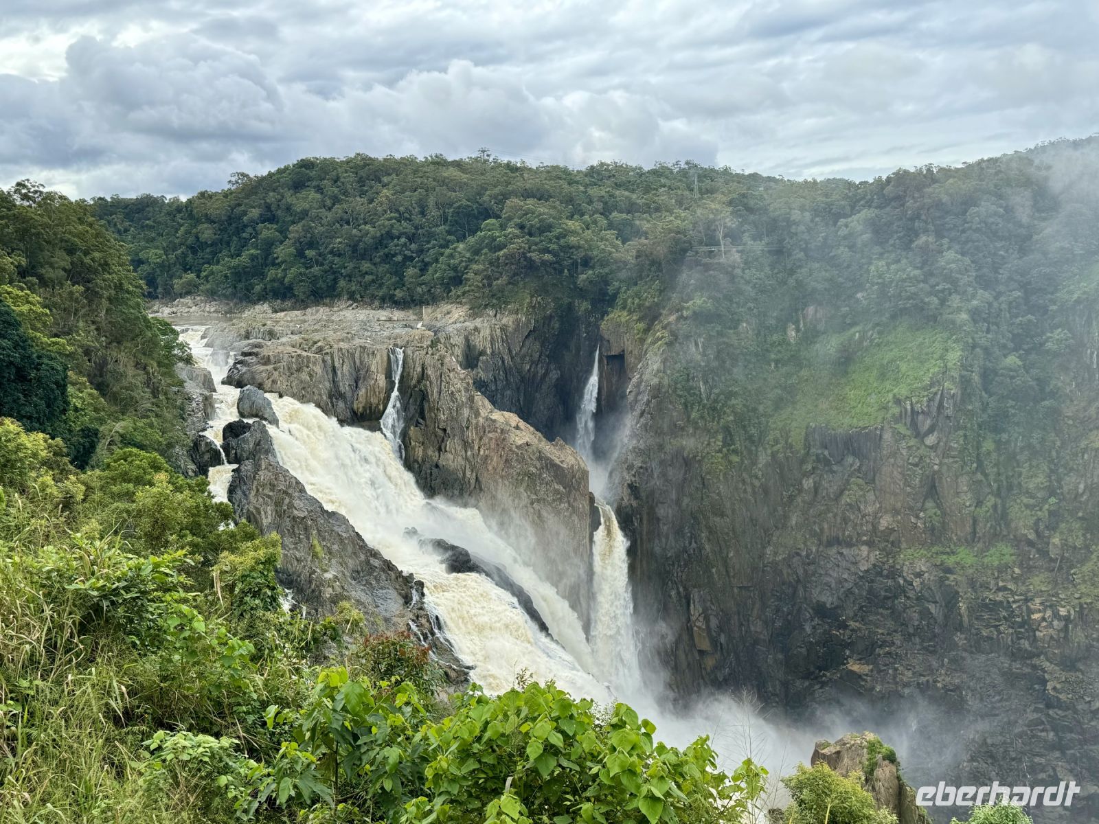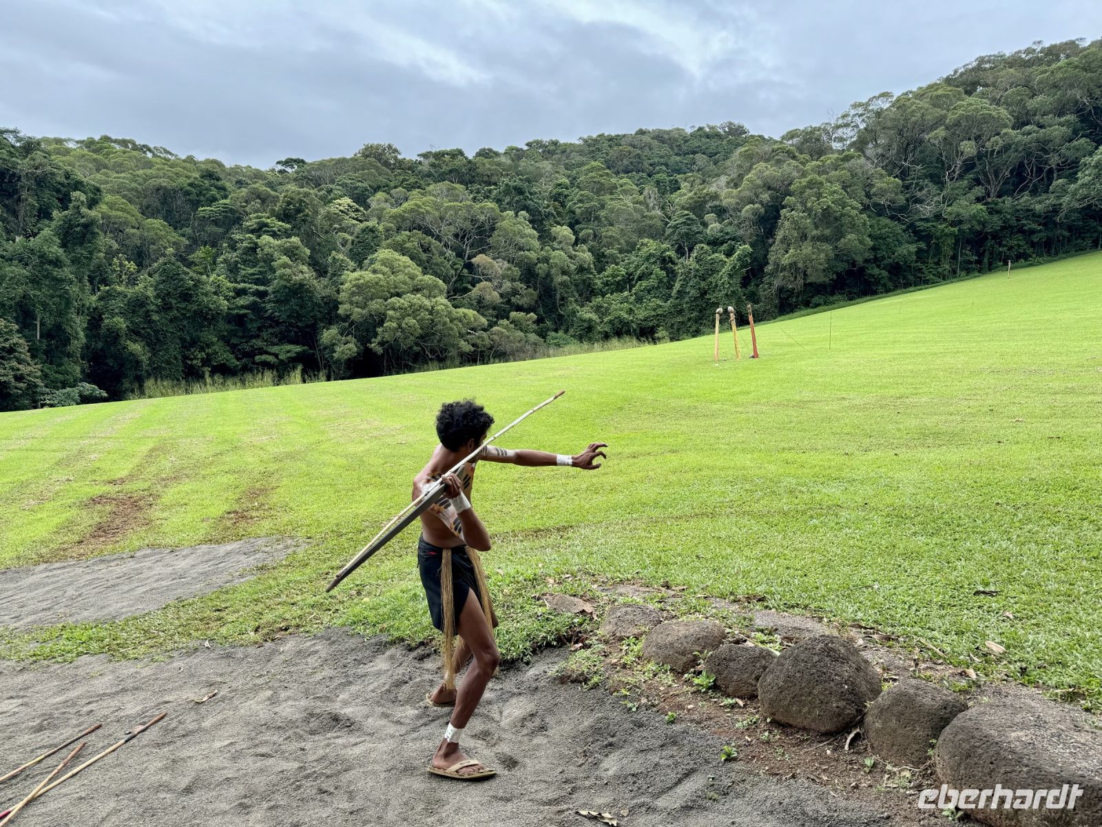 Ein richtiger Regenwald-Actiontag steht für uns heute auf dem Programm! Nach einem kurzen Bustransfer finden wir uns an der Talstation der Skyrail nach Kuranda wieder. Über den Dächern des Regenwalds schweben wir dahin, unter uns ein dichter grüner Dschungel. Zwei Zwischenstationen entführen uns zu kleinen Spaziergängen und belohnen mit herrlichen Aussichten über die Atherton Tablelands und die Barron Gorge mit dem mächtigen Wasserfall. Bevor wir in Kuranda im Souvenirladen hängen bleiben, laufen wir lieber los in Richtung Bushaltestelle, denn auf uns wartet ein Shuttlebus zur sog. Rainforestation. Dort bekommen wir eine Vorführung im Speerwerfen, Didgeridoo-Spielen und dürfen uns selbst im Werfen eines Bumerangs versuchen. Ganz zum Schluss darf/muss/soll ich ebenfalls ran, „Bloß nicht blamieren!“ denke ich bei mir, immerhin hab ich das ja schon ein paar Mal gemacht. Der Bumerang landet zum Glück nicht direkt vor mir im Gras und die Flugbahn sieht halbwegs passabel aus. Puh! Zum Abschluss unserer Führung begeben wir uns zur Tanzshow der Pamagirri, die uns sog. „Imitation Dances“ vorführen. Auf diese Weise sollte der Nachwuchs mit der Tierwelt vertraut gemacht werden. Höhepunkt des Tages ist für meine Gäste aber ganz klar das Fotoshooting mit Olli, dem kleinen Koala. Ganz begeistert zeigen sie mir ihre Erinnerungsfotos! Nach etwas Freizeit in Kuranda fahren wir mit der historischen Kuranda Scenic Railway nach Cairns zurück. Die Strecke diente der Versorgung der Pioniere im Hinterland und stellte eine technische Meisterleistung dar. Nach einem kurzen Halt an den Barron Falls, die wir am Vormittag schon von der Seilbahn aus gesehen hatten, schlängelt sich der Zug durch die Schlucht und viele Tunnel hinab in Richtung Küste. Dabei passieren wir noch mehrere kleinere Wasserfälle, die an den steilen Felswänden hinabstürzen. Zurück in Cairns laufen wir dann etwa 15 Minuten vom Bahnhof zum Hotel und haben sogar noch Zeit für eine Erfrischungspause vor dem HP-Abendessen.