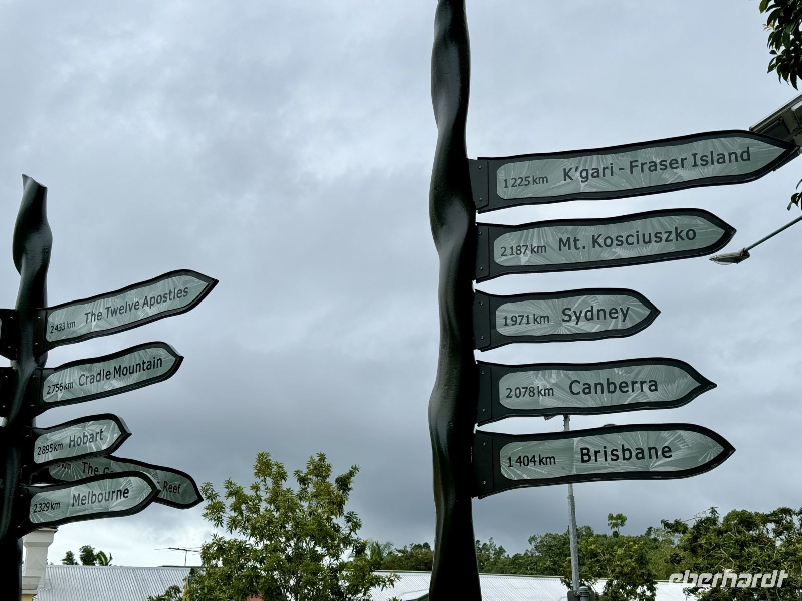Den heutigen freien Tag haben wir uns alle redlich verdient. Zeitige Flüge, Zeitverschiebungen, viele neue Eindrücke, durchaus auch viel Bewegung … da tut so ein bisschen Erholung zwischendurch sehr gut. Wobei das nicht bedeutet, dass meine Gäste vorhaben, den ganzen Tag etwa untätig am Hotelpool zu liegen, nein, nein! Wir haben schon im Vorfeld Rundflüge mit dem Kleinflugzeug über das Great Barrier Reef und Tagesausflüge zur Green Island gebucht. Auch der Botanische Garten steht hoch im Kurs. Ein Ehepaar fährt sogar mit dem Bus in den schönen Nachbarort Palm Cove und geht dort am Strand spazieren. Ich selbst widme mich den vielen, vielen gesammelten Fotos und meinem Reisebericht, besichtige aber am Nachmittag auch zwei Kunstgalerien in der Nähe des Hotels. Ein kleiner Fußmarsch trennt uns dann später am Abend von unserem ganz besonderen HP-Abendessen in einem balinesischen Restaurant. Während wir drinnen vortrefflich schmausen, beginnt draußen — nachdem tagsüber schon ein paar Tropfen herunterkamen — ein heftiger Regenschauer, sodass wir uns lieber ein Taxi zurück ins Hotel rufen lassen. Eigentlich sollte die Regenzeit vorbei sein, aber es schüttet noch fast die ganze Nacht.