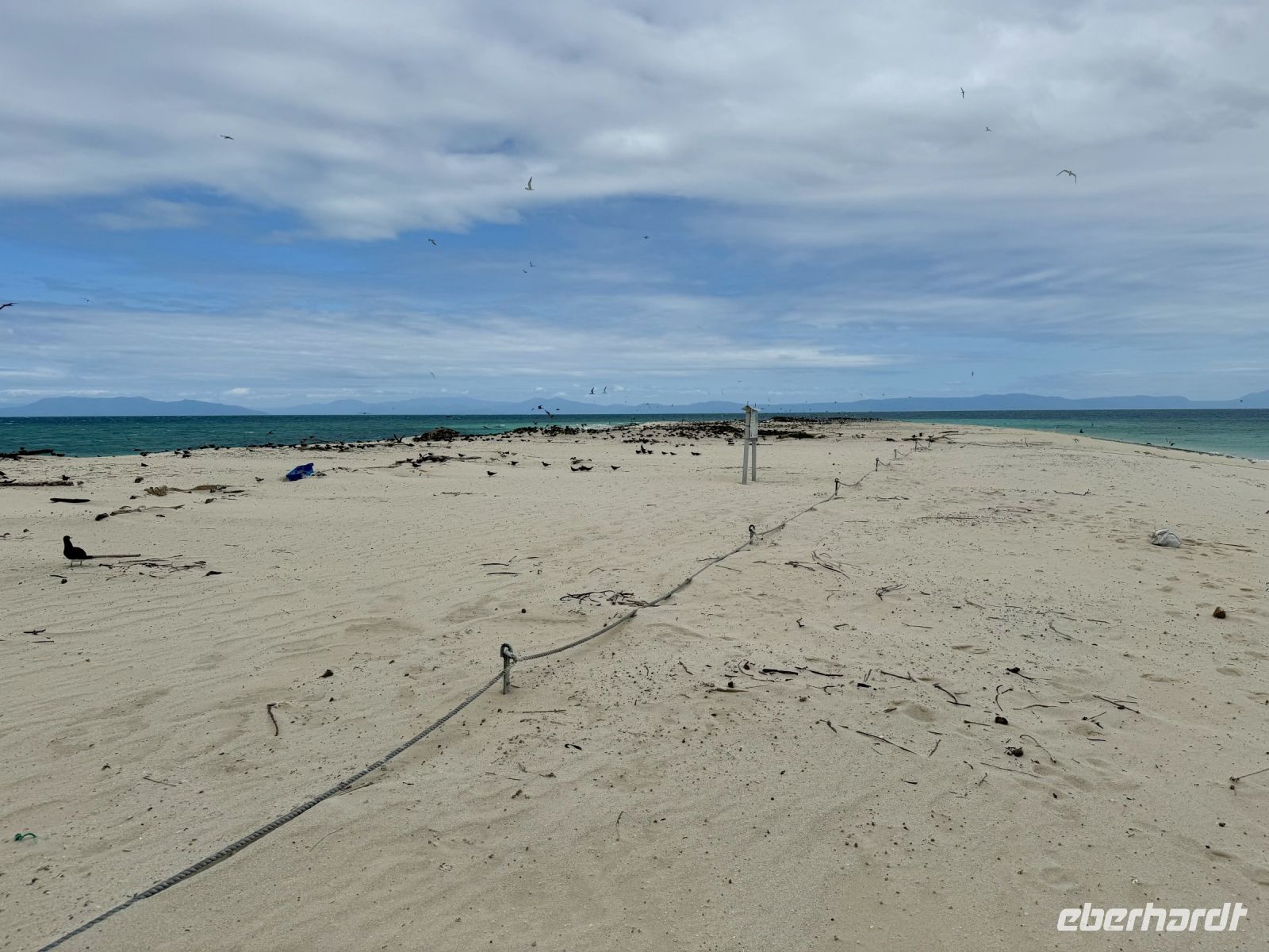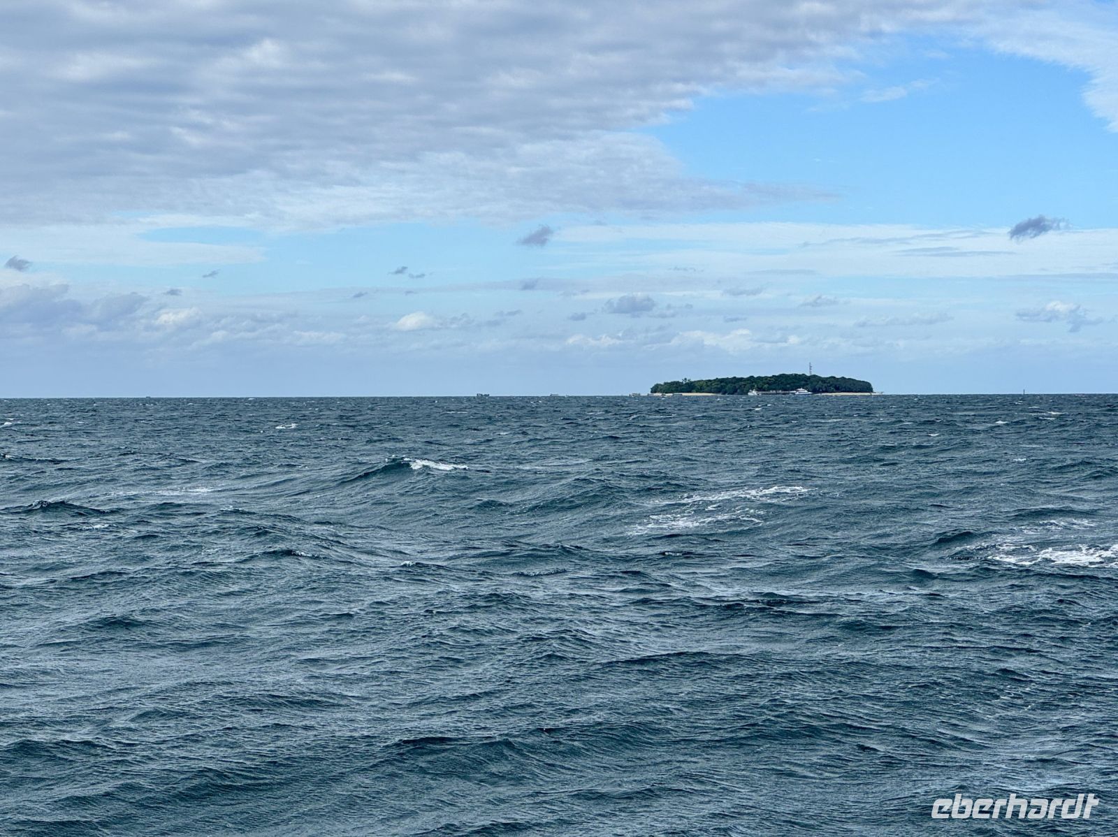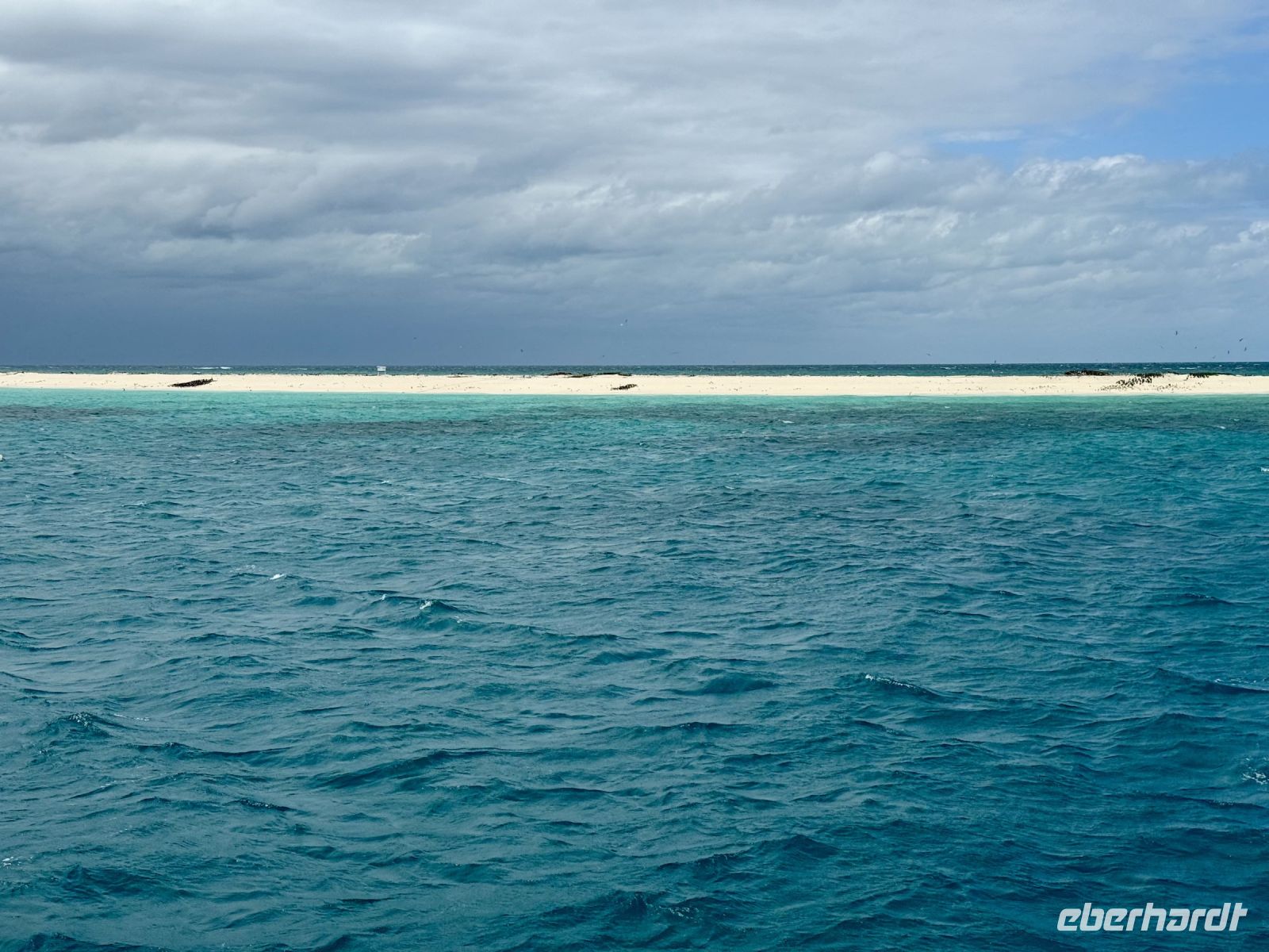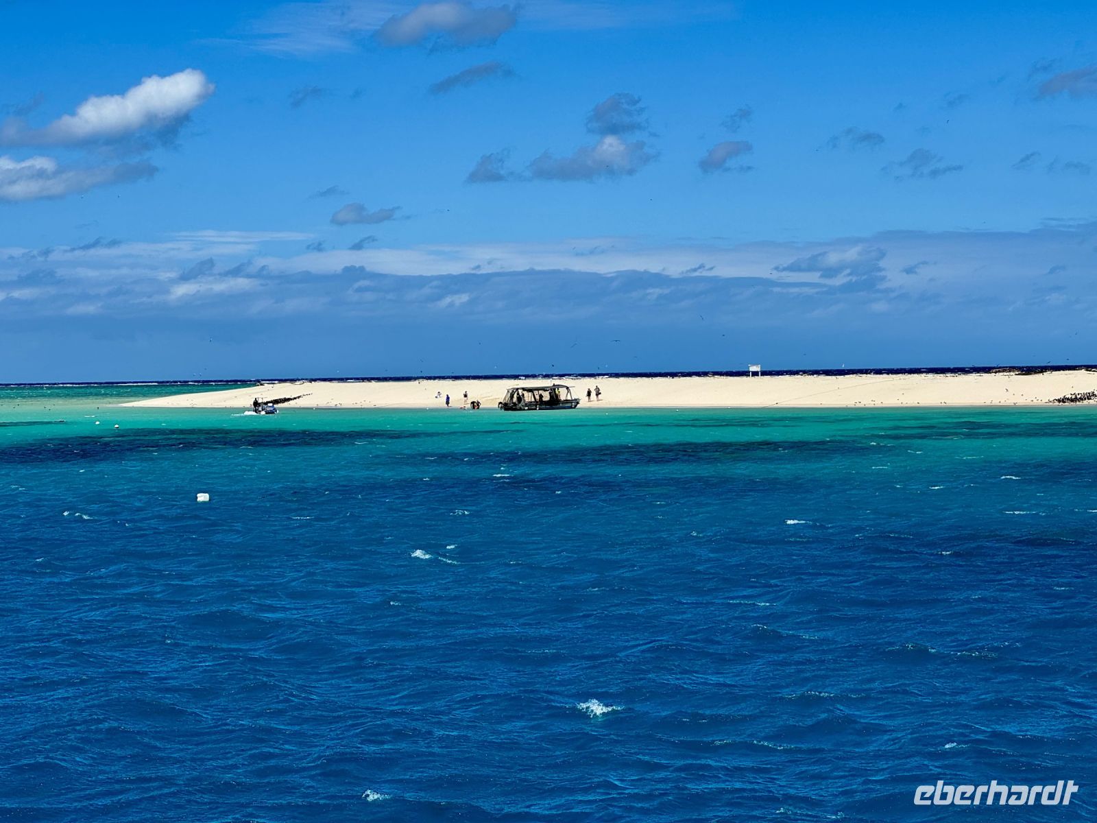 Nach dem gestrigen Dschungeltag steht heute ein Ganztagesausflug zum Great Barrier Reef an, dem zweiten Weltnaturerbe in der Umgebung von Cairns. Mit dem Katamaran „Ocean Spirit“ werden wir zur kleinen Insel Michaelmas Cay gebracht, die eigentlich nicht mehr ist als eine Sandbank und ein Vogelschutzgebiet. Witzigerweise bleibt jeder vorbildlich auf seiner Seite des Absperrseils: wir Menschen auf der einen, die Vögel auf der anderen. Wettertechnisch haben wir heute — und das ist schon eine erwähnenswerte Besonderheit auf dieser Reise mit meinen strahlenden Wetterengeln — nicht so viel Glück: Vor der Hinfahrt werden aus guten Gründen Tabletten gegen Seekrankheit verteilt und die Sonne zeigt sich nur sehr selten. Es herrscht auch ein starker Wind, der uns die feinen Sandkörner der kleinen Insel hartnäckig unter die Nase reibt. Wir lassen uns aber nicht abschrecken und gehen trotzdem auf große Schnorchel-Entdeckungstour. Einmal im Wasser, lassen wir uns dank der Schwimmwesten treiben und gelangen recht schnell hinaus zu den Riffen, wo sich viele Korallen, Riesenmuscheln und Fische erblicken lassen. Derweil ist die Crew unseres Ausflugsbootes stets um unser Wohlergehen besorgt und lässt uns nicht aus den Augen. Für das Mittagessen vom Buffet kehren wir rechtzeitig zum Katamaran zurück, damit wir anschließend noch eine halbstündige Spritztour mit dem Halbtauchboot unternehmen können. Wer beim Schnorcheln nicht dabei sein konnte, hat hier nochmals Gelegenheit für einen Blick auf unterschiedlichste Korallentypen und ganze Schwärme von Fischen. Sogar einen kleinen Hai können einige Gäste sehen. Inzwischen hat sich das Wetter auch gebessert, die Sonne lacht wieder vom Himmel, manch ein Ausflugsgast legt sich sogar aufs Sonnendeck unseres Katamarans. Vor der Rückfahrt gibt es ein Glas Sekt für jeden und Schokoladenkuchen — verhungern und verdursten muss heute wirklich niemand. Die Rückfahrt nach Cairns dauert rund 1,5 Stunden und führt uns an der Green Island vorbei. Als wir von Bord gehen, steht fast die ganze Crew Spalier und winkt zum Abschied. Beim HP-Abendessen stehen verschiedene Spezialitäten der modernen australischen Küche auf der Speisekarte, darunter nochmals Känguru und erstmals das australische Nationaldessert Pavlova.