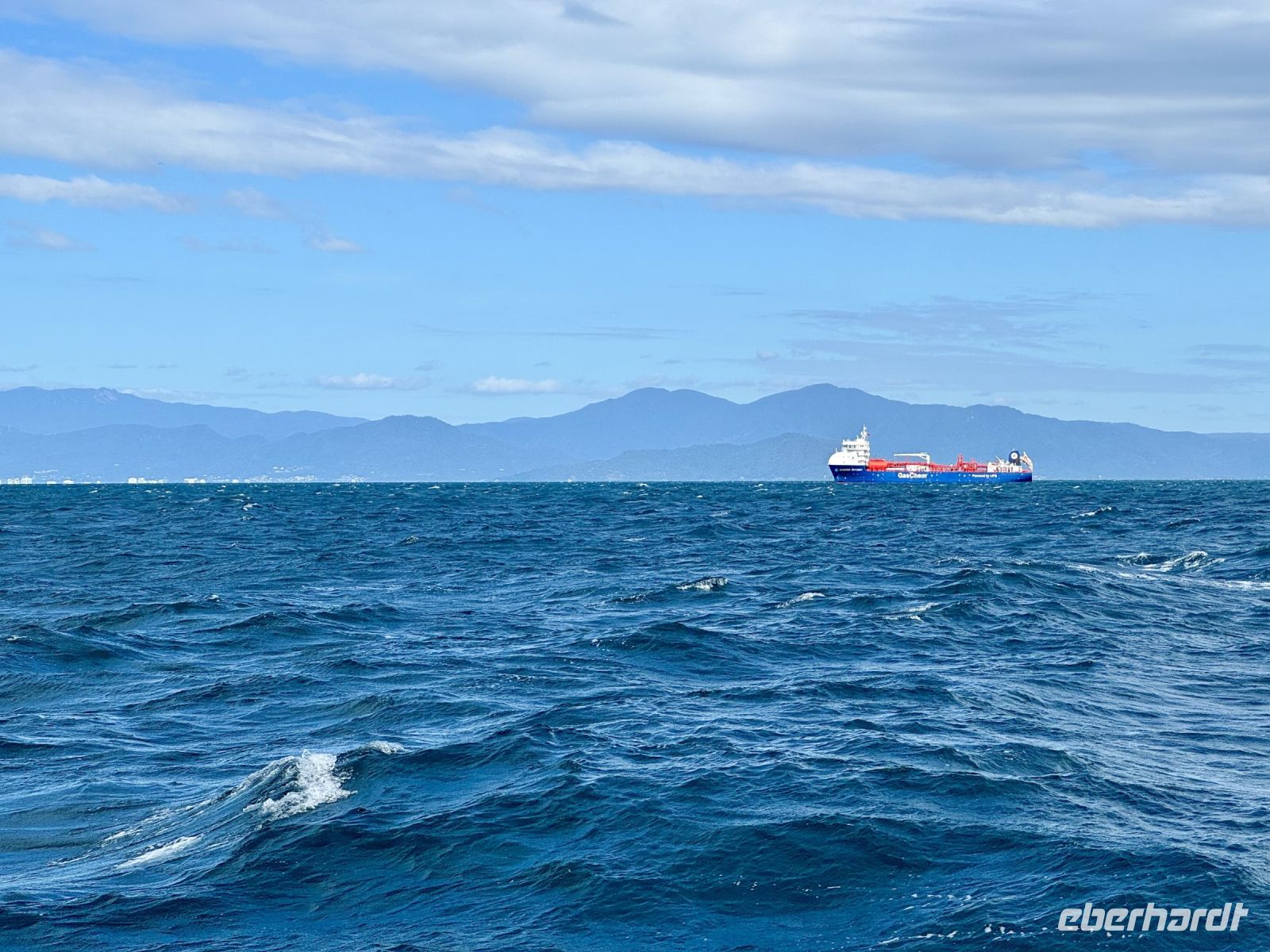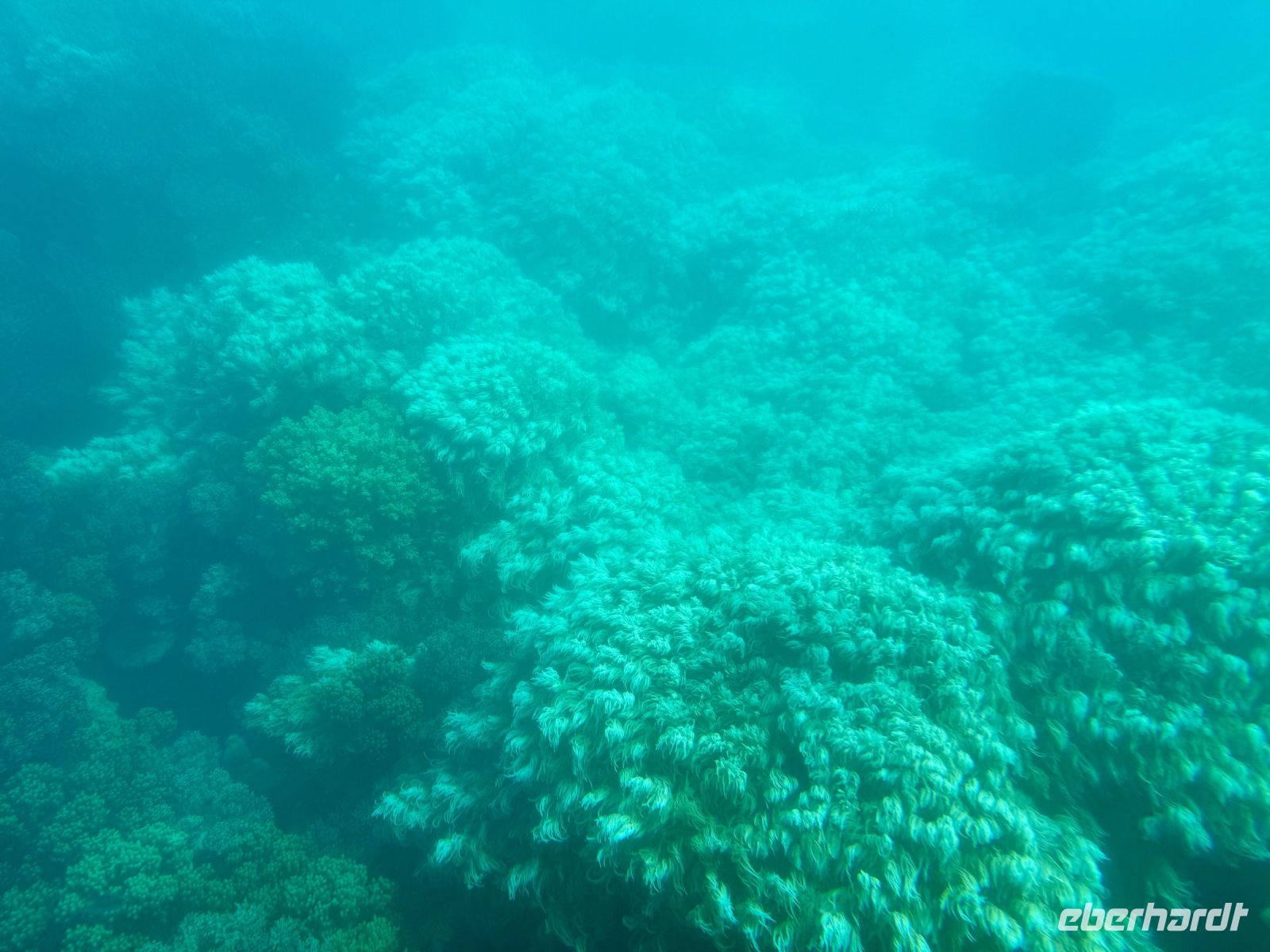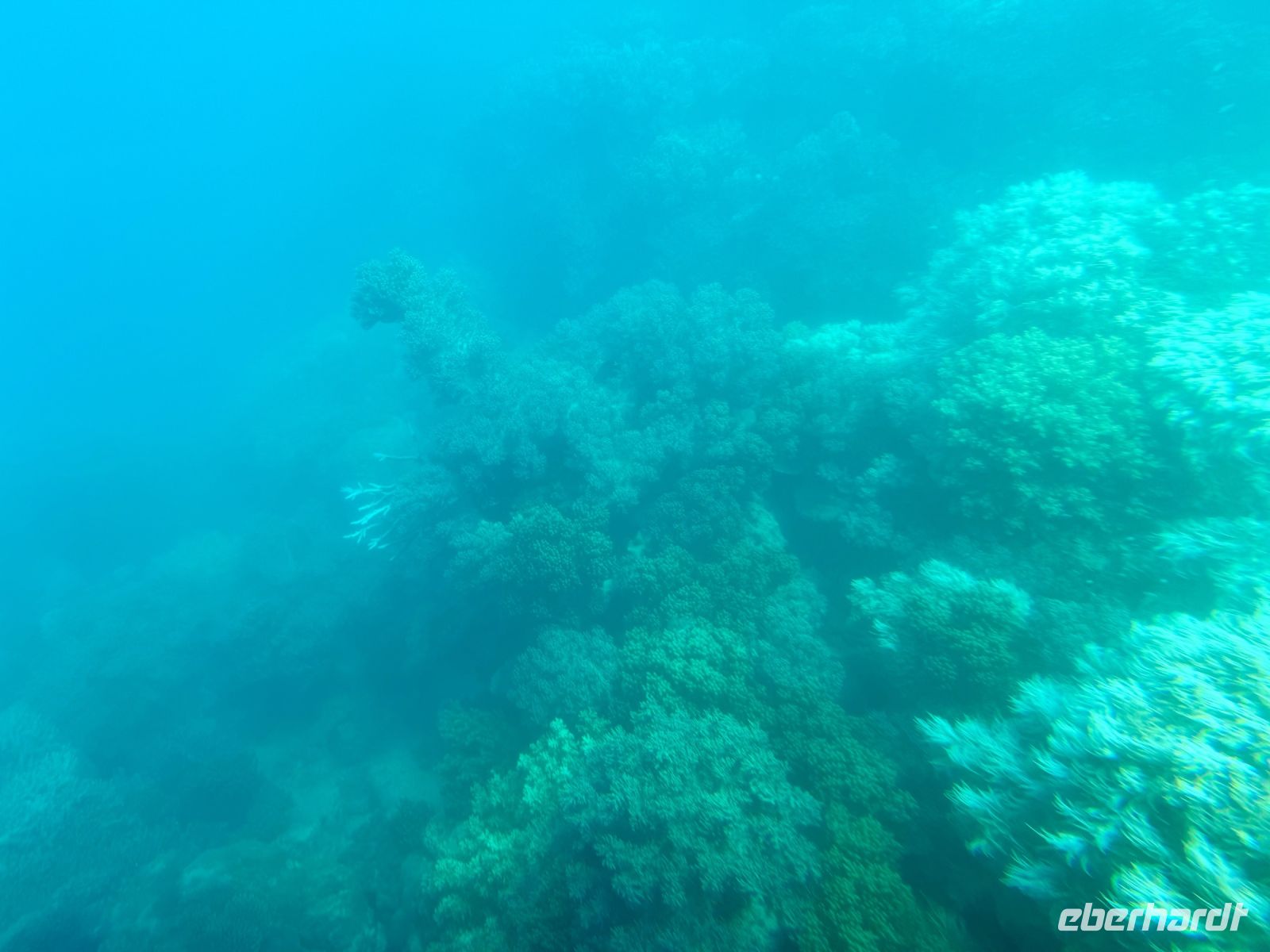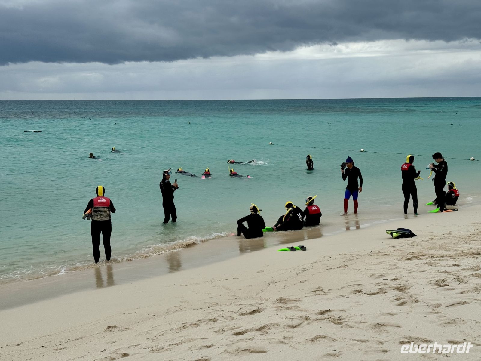 Nach dem gestrigen Dschungeltag steht heute ein Ganztagesausflug zum Great Barrier Reef an, dem zweiten Weltnaturerbe in der Umgebung von Cairns. Mit dem Katamaran „Ocean Spirit“ werden wir zur kleinen Insel Michaelmas Cay gebracht, die eigentlich nicht mehr ist als eine Sandbank und ein Vogelschutzgebiet. Witzigerweise bleibt jeder vorbildlich auf seiner Seite des Absperrseils: wir Menschen auf der einen, die Vögel auf der anderen. Wettertechnisch haben wir heute — und das ist schon eine erwähnenswerte Besonderheit auf dieser Reise mit meinen strahlenden Wetterengeln — nicht so viel Glück: Vor der Hinfahrt werden aus guten Gründen Tabletten gegen Seekrankheit verteilt und die Sonne zeigt sich nur sehr selten. Es herrscht auch ein starker Wind, der uns die feinen Sandkörner der kleinen Insel hartnäckig unter die Nase reibt. Wir lassen uns aber nicht abschrecken und gehen trotzdem auf große Schnorchel-Entdeckungstour. Einmal im Wasser, lassen wir uns dank der Schwimmwesten treiben und gelangen recht schnell hinaus zu den Riffen, wo sich viele Korallen, Riesenmuscheln und Fische erblicken lassen. Derweil ist die Crew unseres Ausflugsbootes stets um unser Wohlergehen besorgt und lässt uns nicht aus den Augen. Für das Mittagessen vom Buffet kehren wir rechtzeitig zum Katamaran zurück, damit wir anschließend noch eine halbstündige Spritztour mit dem Halbtauchboot unternehmen können. Wer beim Schnorcheln nicht dabei sein konnte, hat hier nochmals Gelegenheit für einen Blick auf unterschiedlichste Korallentypen und ganze Schwärme von Fischen. Sogar einen kleinen Hai können einige Gäste sehen. Inzwischen hat sich das Wetter auch gebessert, die Sonne lacht wieder vom Himmel, manch ein Ausflugsgast legt sich sogar aufs Sonnendeck unseres Katamarans. Vor der Rückfahrt gibt es ein Glas Sekt für jeden und Schokoladenkuchen — verhungern und verdursten muss heute wirklich niemand. Die Rückfahrt nach Cairns dauert rund 1,5 Stunden und führt uns an der Green Island vorbei. Als wir von Bord gehen, steht fast die ganze Crew Spalier und winkt zum Abschied. Beim HP-Abendessen stehen verschiedene Spezialitäten der modernen australischen Küche auf der Speisekarte, darunter nochmals Känguru und erstmals das australische Nationaldessert Pavlova.