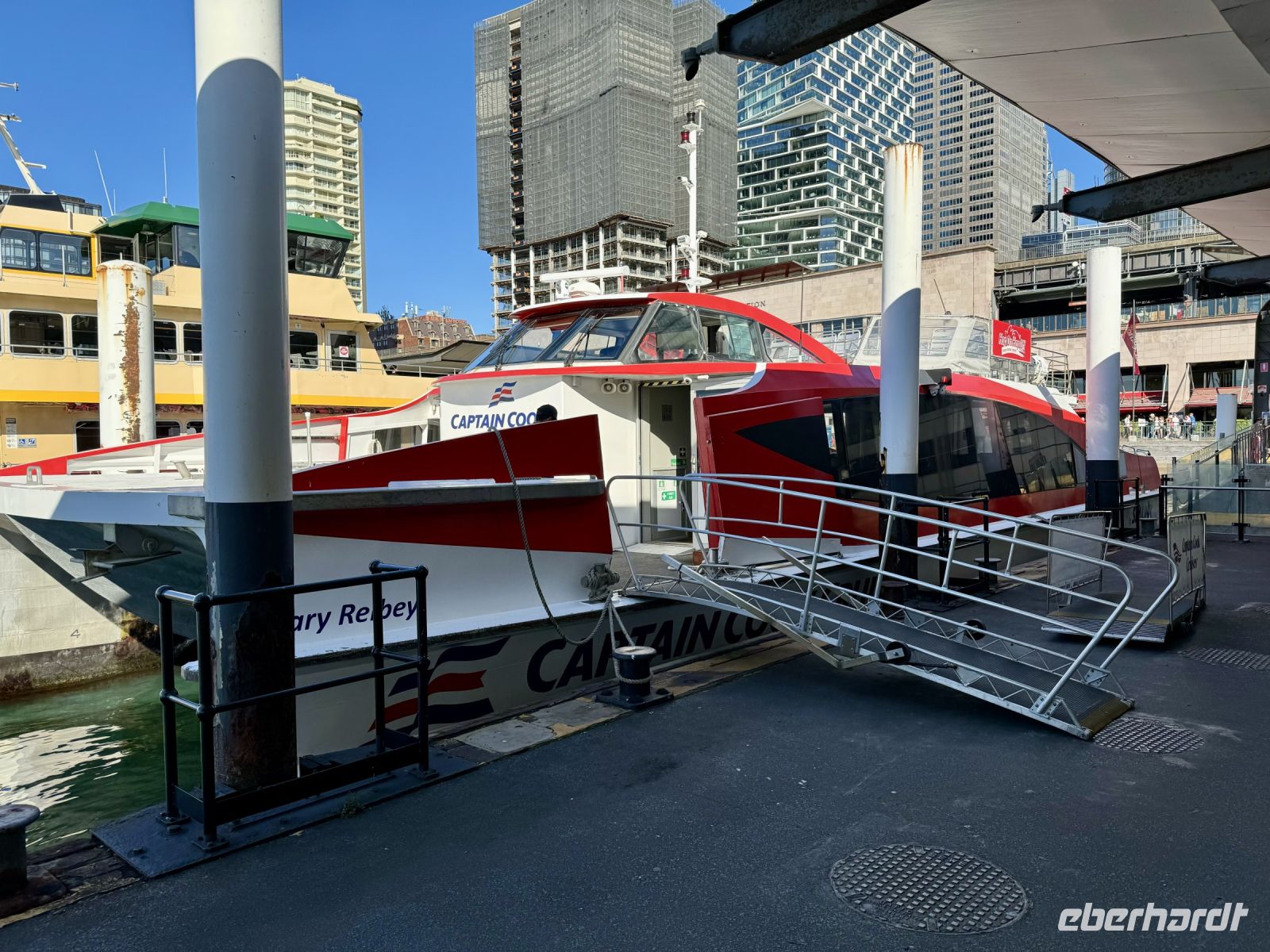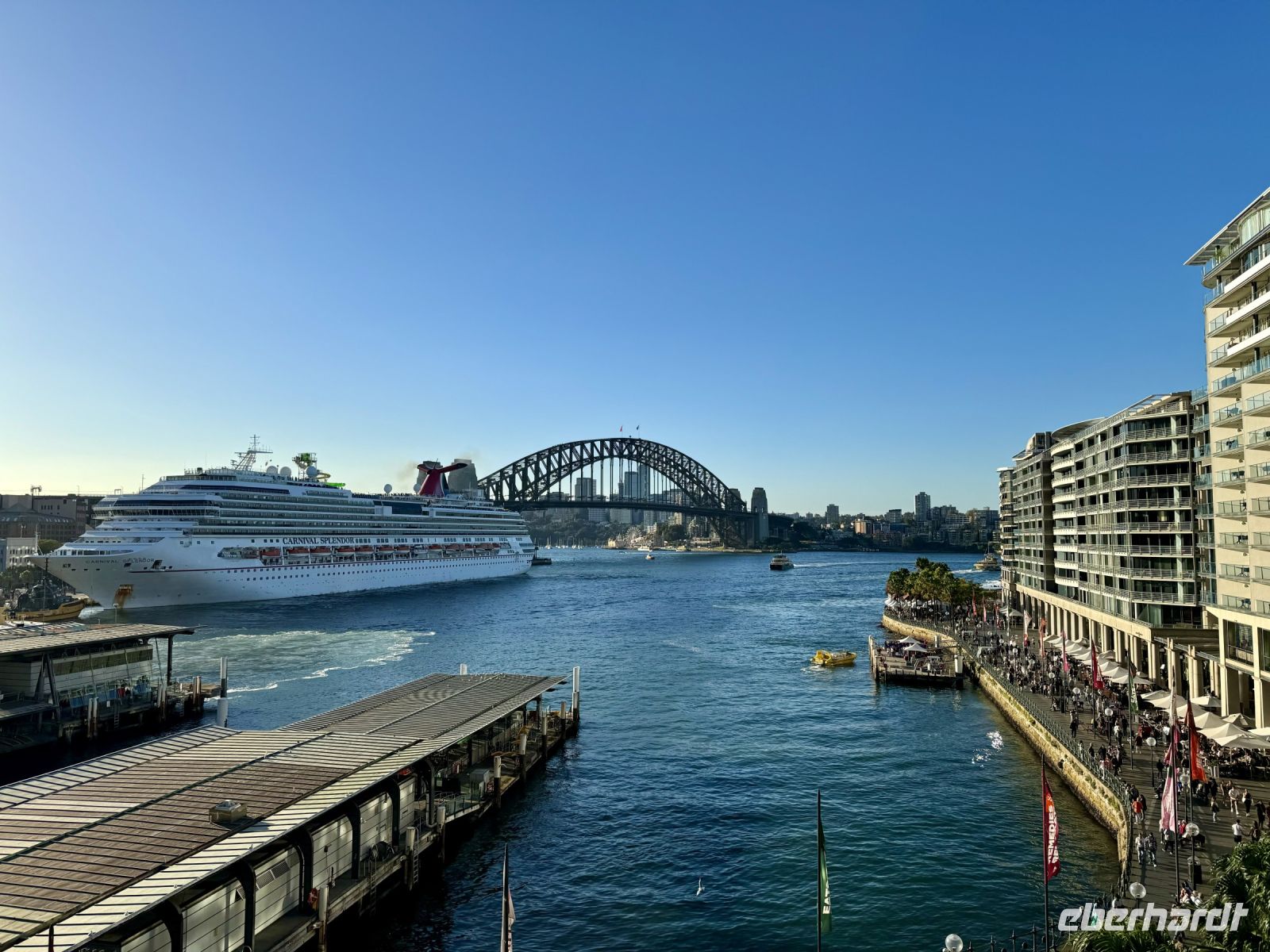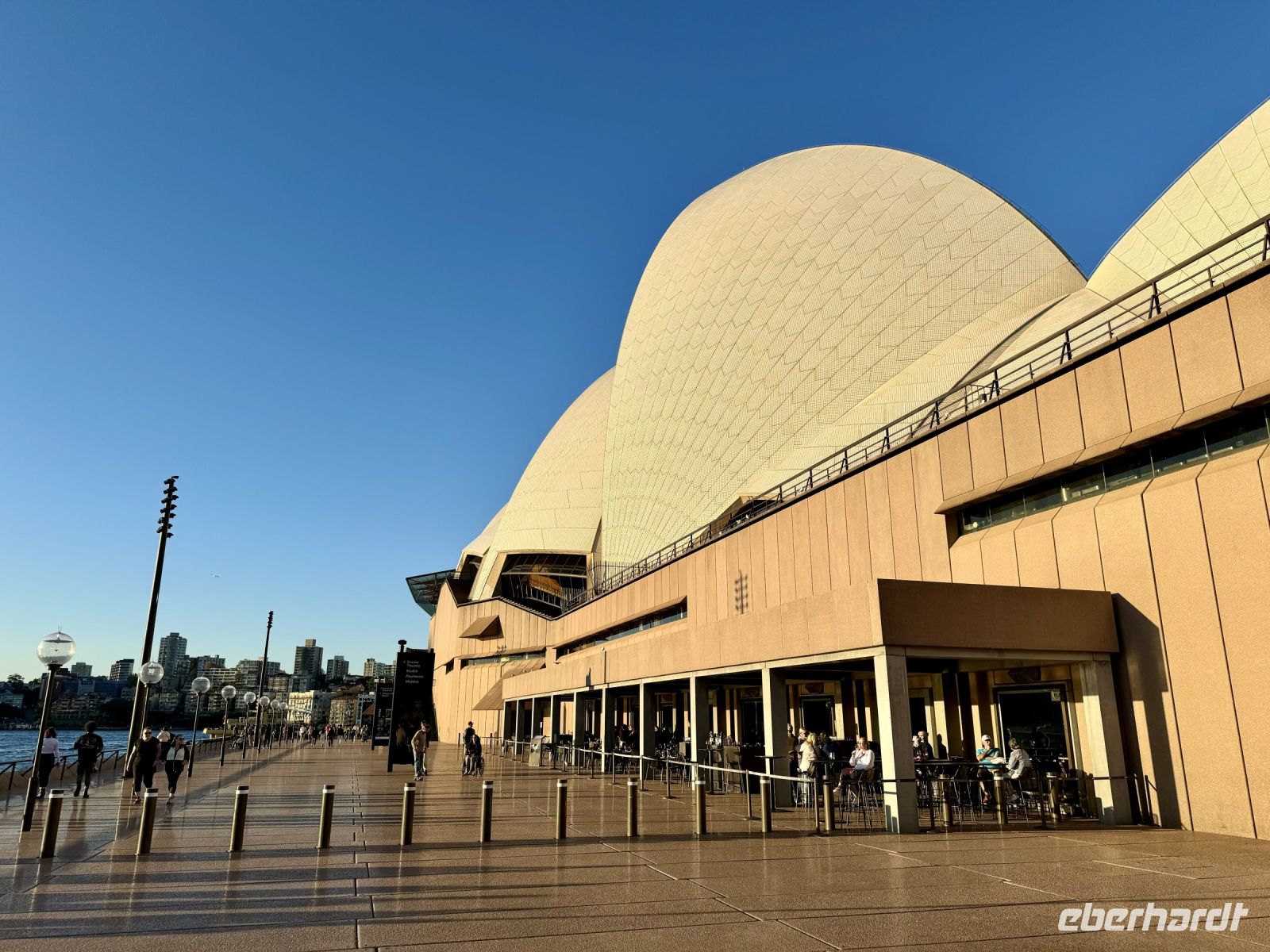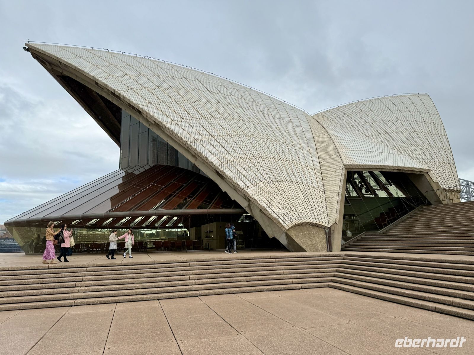 Während ich unseren einzelreisenden Unglücksraben vormittags im Krankenhaus besuche, unternimmt die Gruppe in der sicheren Obhut und Fürsorge von Uli eine halbtägige Stadtrundfahrt durch verschiedene Viertel von Sydney, beginnend mit dem ältesten Gebiet der jetzigen Millionenstadt, The Rocks. Dabei darf auch ein Fotostopp unter der Hafenbrücke nicht fehlen. Über den Botanischen Garten und die Rose Bay geht es hinaus bis zur Hafeneinfahrt, wo die Gruppe ebenfalls aussteigt und einen kleinen Spaziergang unternimmt. Am weltberühmten Bondi Beach dürfen meine Gäste dann ihre Füße ins Meer stecken (soll wohl recht frisch gewesen sein) und am Sandstrand entlangflanieren. Zur Mittagspause treffen wir uns alle wieder am Circular Quay. Statt Erholung nach dem Fußmarsch vom Krankenhaus steht allerdings ein großer Aufstieg auf dem Programm, denn ein Teil der Gruppe möchte gern auf den Pylon Lookout auf der Hafenbrücke. Na gut, dann los, zum Glück habe ich mich unterwegs schon stärken können! Gerade im Kneipenviertel unterhalb der Brücke herrscht heute zum ANZAC-Feiertag Hochbetrieb. Alle feiern ausgelassen und mit viel Alkohol. Wir schlängeln uns zur Hafenbrücke durch und erklimmen die Stufen bis zur Aussichtsplattform. Es lohnt sich immer wieder: Opernhaus, Innenstadt, Darling Harbour, Hafenbrücke. Zumal das Wetter heute auch ideal ist — Sonne satt, aber nicht zu warm. Während der anschließenden Hafenrundfahrt mit Captain Cook Cruises bis Manly und zurück erhalten wir wieder ganz andere Perspektiven auf Sydney. Der Kapitän steuert unseren Katamaran durch die Hafeneinfahrt sogar fast bis hinaus auf das offene Meer, bevor er in Richtung Manly abdreht. Da hat es schon ein bisschen mehr geschaukelt als im geschützten Bereich des riesigen natürlichen Hafens, der das Panorama von Sydney und das Leben in der Stadt bestimmt. Den Abschluss des Tagesprogramms — wir könnten es gut und gerne „Sydney intensiv“ nennen — bildet eine deutschsprachige Führung durch das weltberühmte Opernhaus nach den Plänen des dänischen Architekten Utzon. Dabei dürfen wir sowohl kurz im Konzertsaal als auch im Operntheater Platz nehmen und die beiden völlig unterschiedlichen Räume auf uns wirken lassen. Wir verabschieden uns für heute von Uli, kehren auf eigene Faust zum Hotel zurück und freuen uns auf das HP-Abendessen im Nick’s Seafood Restaurant am Darling Harbour. Um uns herum tobt das Nachtleben; die Fußgängerzone und die angrenzenden Pubs sind gefüllt mit vielen jungen Menschen, die ausgelassen feiern.