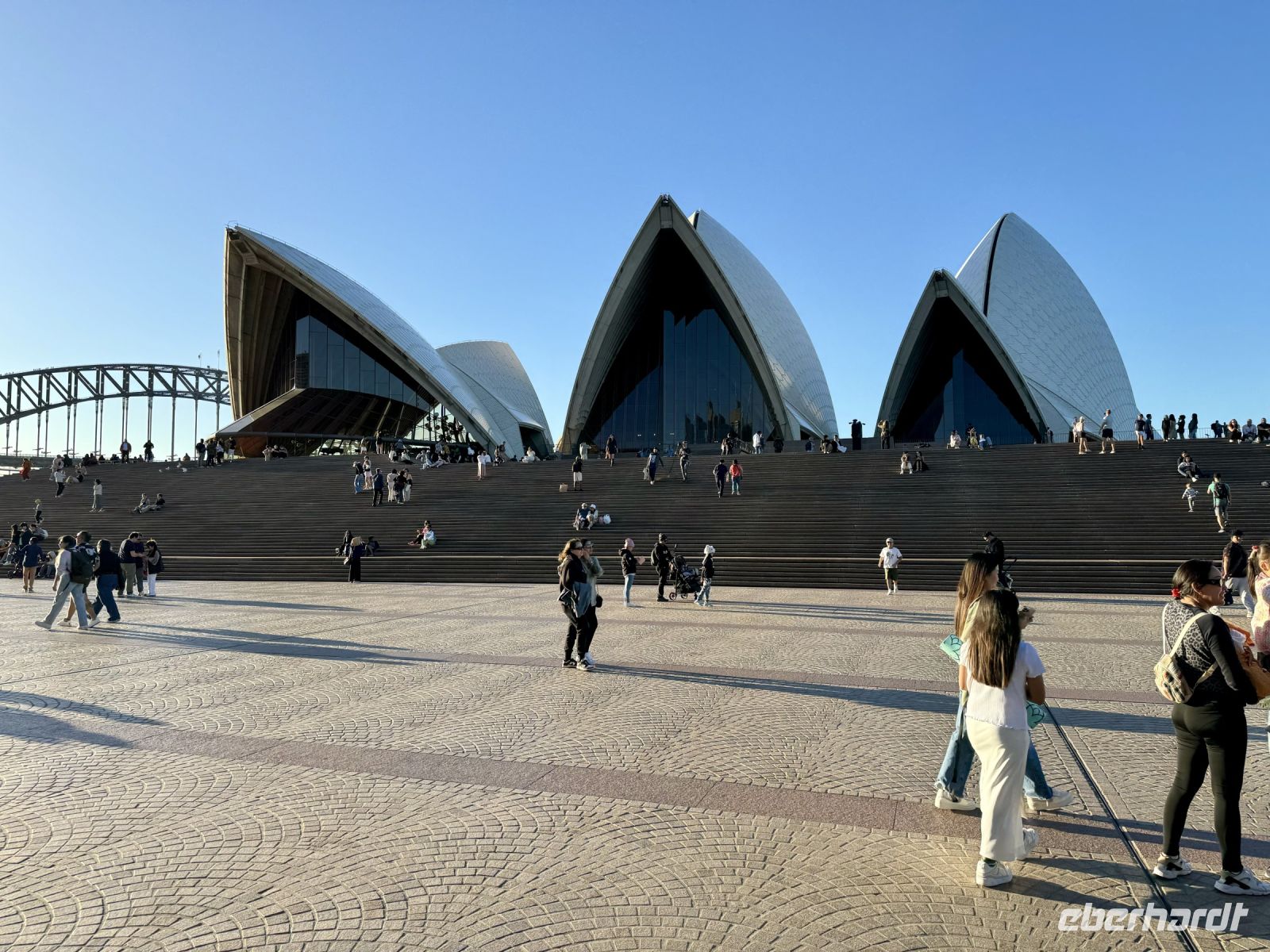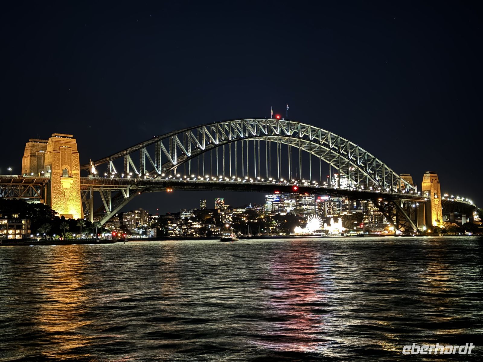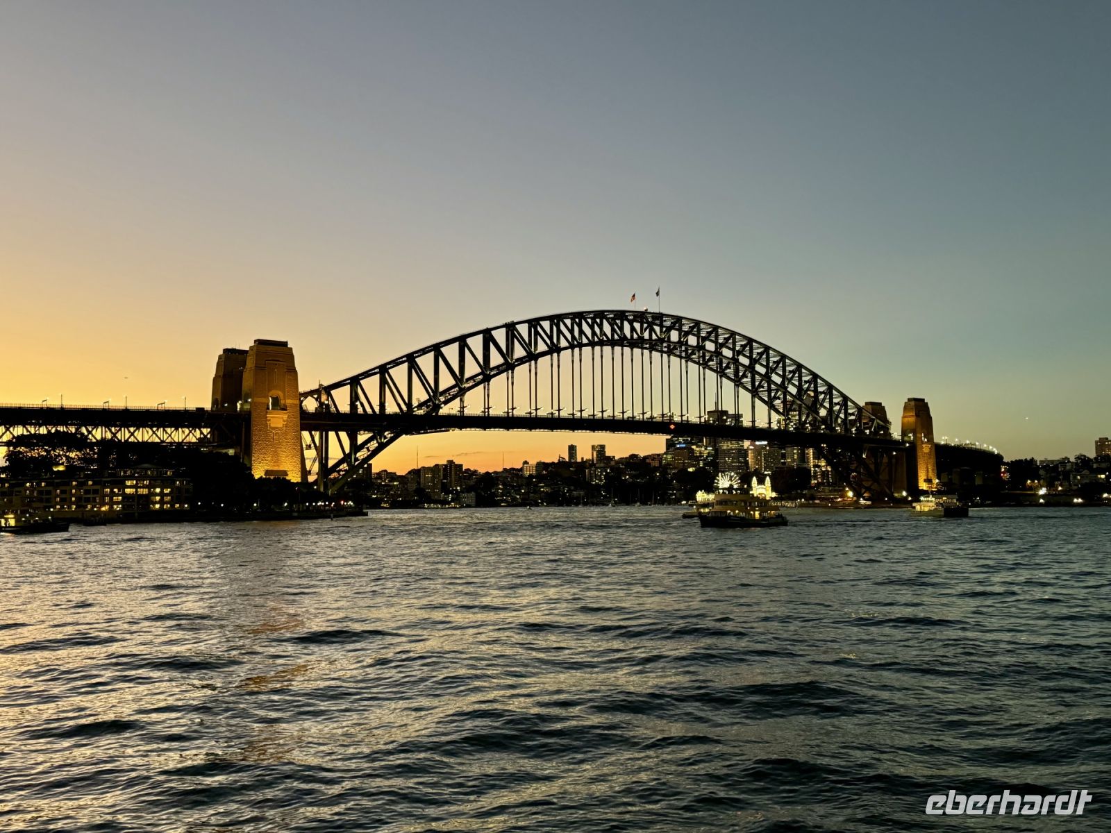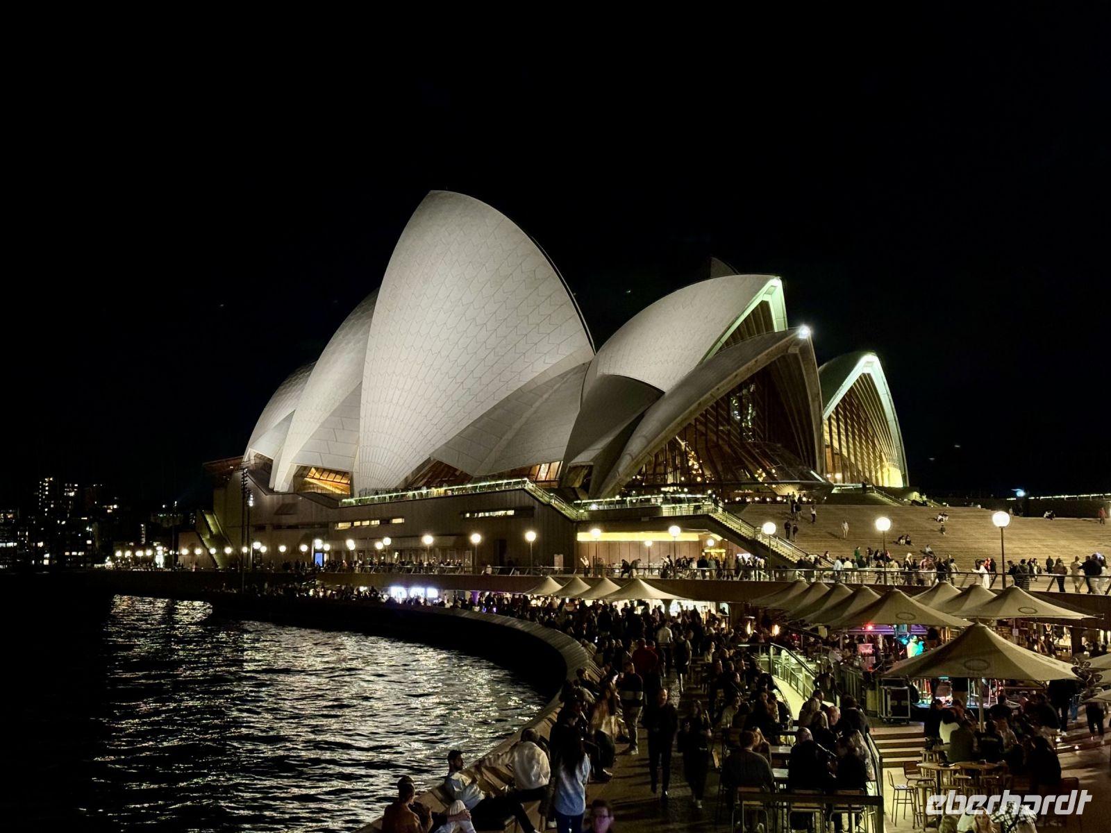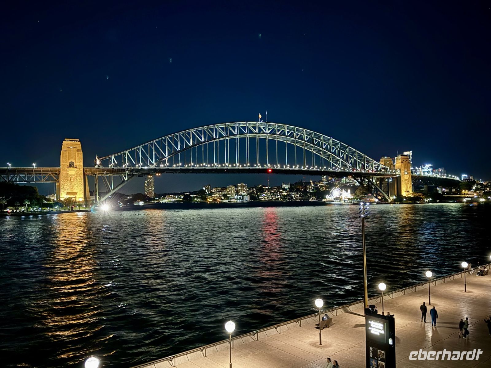 Wie schön, dass wir heute nach Sydney fliegen, unserer (leider) letzten Station in Australien! Dort erwarten uns sonniges Wetter und angenehme Temperaturen, während es in Cairns immer noch ein bisschen regnet. Meine Gäste schlafen alle noch, als ich leider mit einem Herrn mitten in der Nacht bereits ins Krankenhaus muss. Die gute Nachricht ist dann jedoch, dass wir alle zusammen als Gruppe nach Sydney weiterziehen dürfen und niemanden zurücklassen müssen. Beim Anflug auf die größte Stadt Australiens können wir auf der linken Seite das Hafenbecken, die Hafenbrücke und sogar das Opernhaus sehen. Viel Wasser und viel Grün dominieren den Blick nach unten und steigern unsere Vorfreude. Unsere langjährige erfahrene örtliche Reiseleiterin Uli erwartet uns bereits direkt nach dem Ausstieg mit dem Eberhardt-Schild. Ich freue mich wirklich riesig, sie wiederzusehen. Wie immer ist sie gut vorbereitet und hat Stadtpläne für uns besorgt, auf denen sie die wichtigsten Stationen und Ziele unseres Aufenthalts in Sydney markiert hat. Auf der Fahrt zum Hotel bekommen wir von ihr alle wichtigen Infos und können nach Ankunft im Hotel direkt das Stadtzentrum erkunden. Leider geht es unserem kranken Herrn nach dem Flug und langen Tag sehr viel schlechter, sodass wir uns gezwungen sehen, erneut den Krankenwagen zu rufen. Sowohl vom Hotelpersonal als auch allen anderen Gästen aus der Reisegruppe bekommen wir viel Unterstützung, allen voran von den medizinisch geschulten Gästen, wofür wir sehr, sehr dankbar sind. Fast alle Gäste stürzen sich spätestens nach dem Abendessen ins Nachtleben, laufen zum Circular Quay und Opernhaus und/oder fahren hinauf auf den Aussichtsturm. Auf meinem Telefon erreichen mich viele tolle Fotos von Sydney bei Nacht.