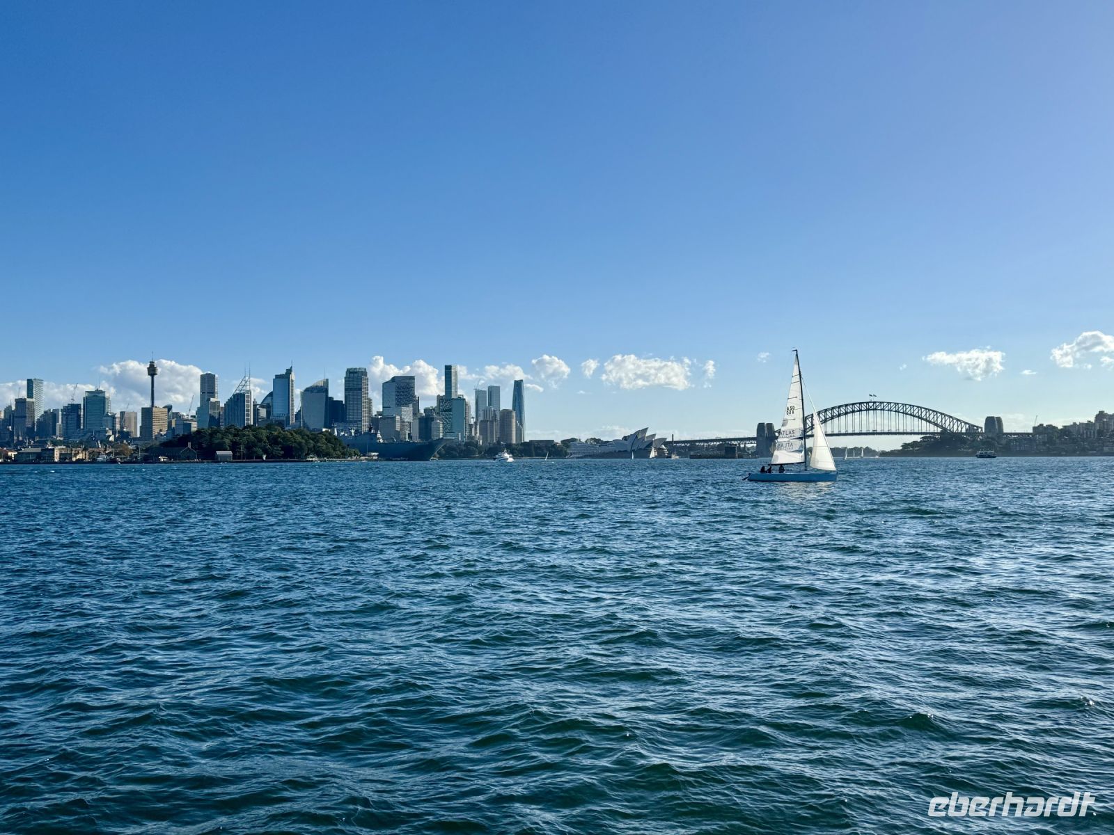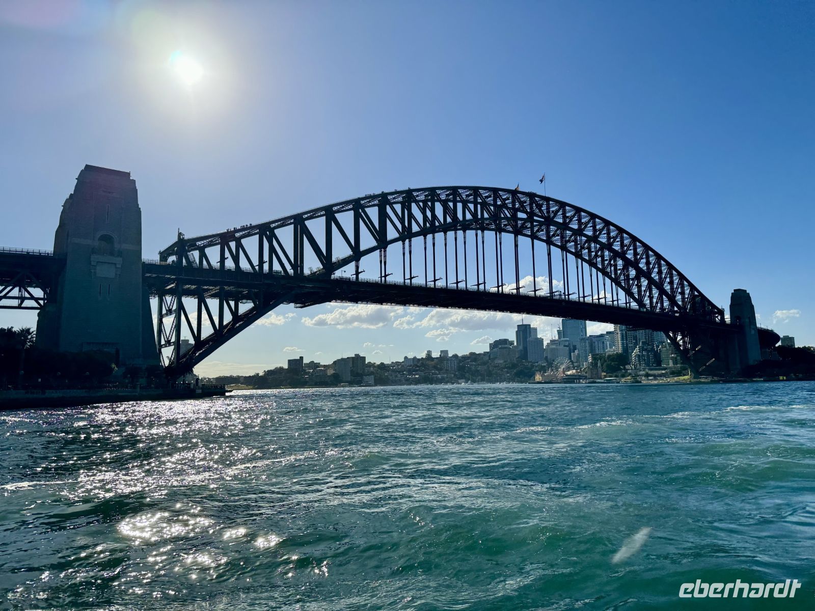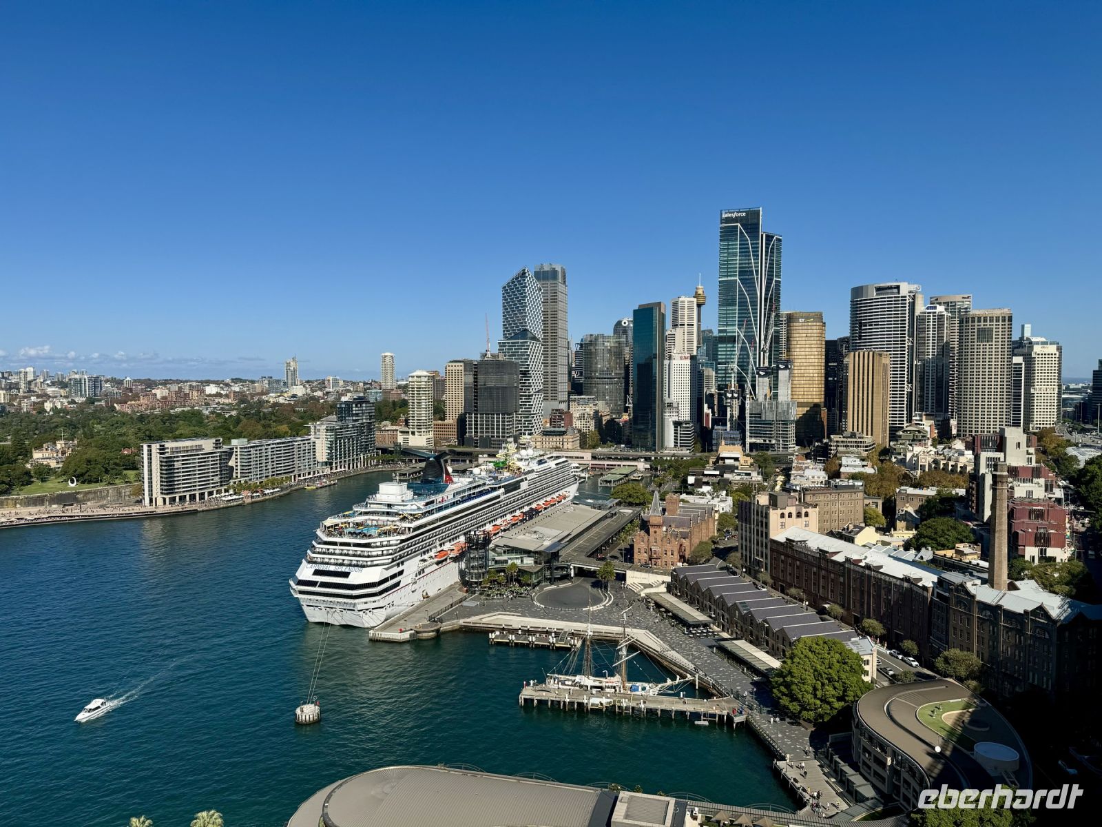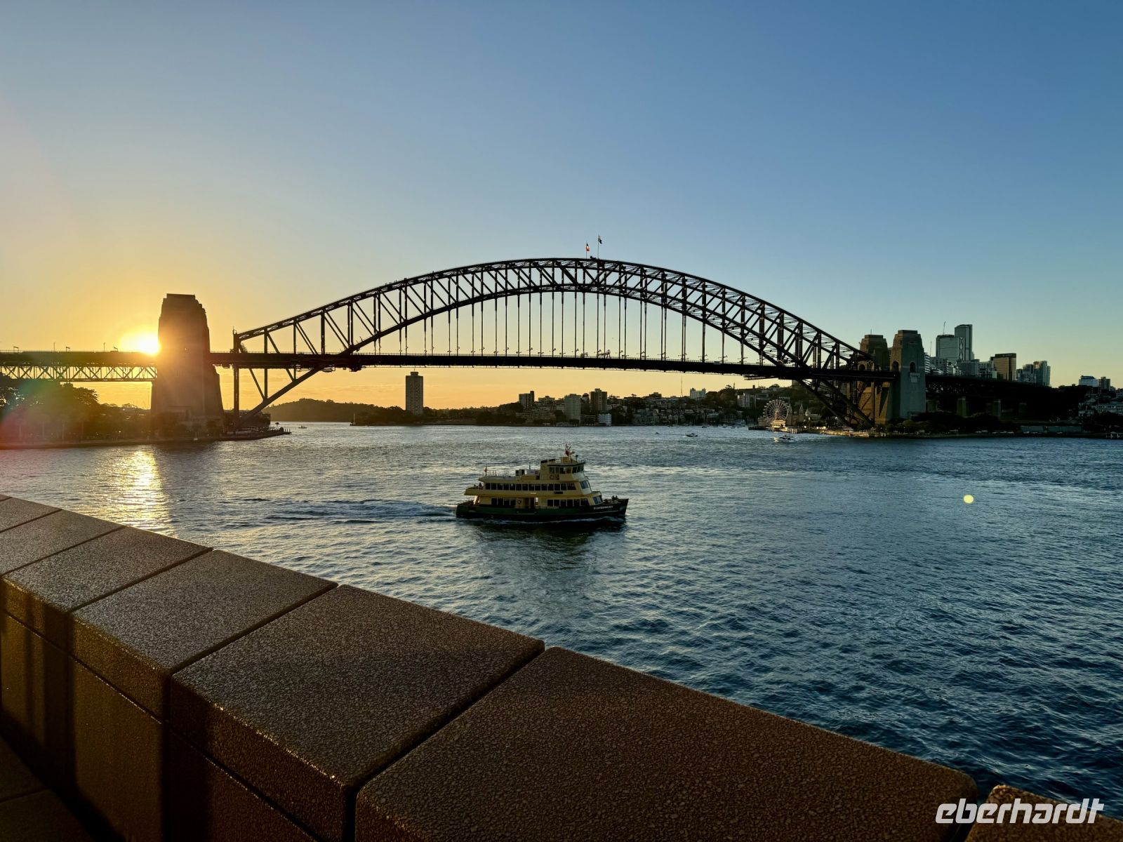 Wie schön, dass wir heute nach Sydney fliegen, unserer (leider) letzten Station in Australien! Dort erwarten uns sonniges Wetter und angenehme Temperaturen, während es in Cairns immer noch ein bisschen regnet. Meine Gäste schlafen alle noch, als ich leider mit einem Herrn mitten in der Nacht bereits ins Krankenhaus muss. Die gute Nachricht ist dann jedoch, dass wir alle zusammen als Gruppe nach Sydney weiterziehen dürfen und niemanden zurücklassen müssen. Beim Anflug auf die größte Stadt Australiens können wir auf der linken Seite das Hafenbecken, die Hafenbrücke und sogar das Opernhaus sehen. Viel Wasser und viel Grün dominieren den Blick nach unten und steigern unsere Vorfreude. Unsere langjährige erfahrene örtliche Reiseleiterin Uli erwartet uns bereits direkt nach dem Ausstieg mit dem Eberhardt-Schild. Ich freue mich wirklich riesig, sie wiederzusehen. Wie immer ist sie gut vorbereitet und hat Stadtpläne für uns besorgt, auf denen sie die wichtigsten Stationen und Ziele unseres Aufenthalts in Sydney markiert hat. Auf der Fahrt zum Hotel bekommen wir von ihr alle wichtigen Infos und können nach Ankunft im Hotel direkt das Stadtzentrum erkunden. Leider geht es unserem kranken Herrn nach dem Flug und langen Tag sehr viel schlechter, sodass wir uns gezwungen sehen, erneut den Krankenwagen zu rufen. Sowohl vom Hotelpersonal als auch allen anderen Gästen aus der Reisegruppe bekommen wir viel Unterstützung, allen voran von den medizinisch geschulten Gästen, wofür wir sehr, sehr dankbar sind. Fast alle Gäste stürzen sich spätestens nach dem Abendessen ins Nachtleben, laufen zum Circular Quay und Opernhaus und/oder fahren hinauf auf den Aussichtsturm. Auf meinem Telefon erreichen mich viele tolle Fotos von Sydney bei Nacht.
