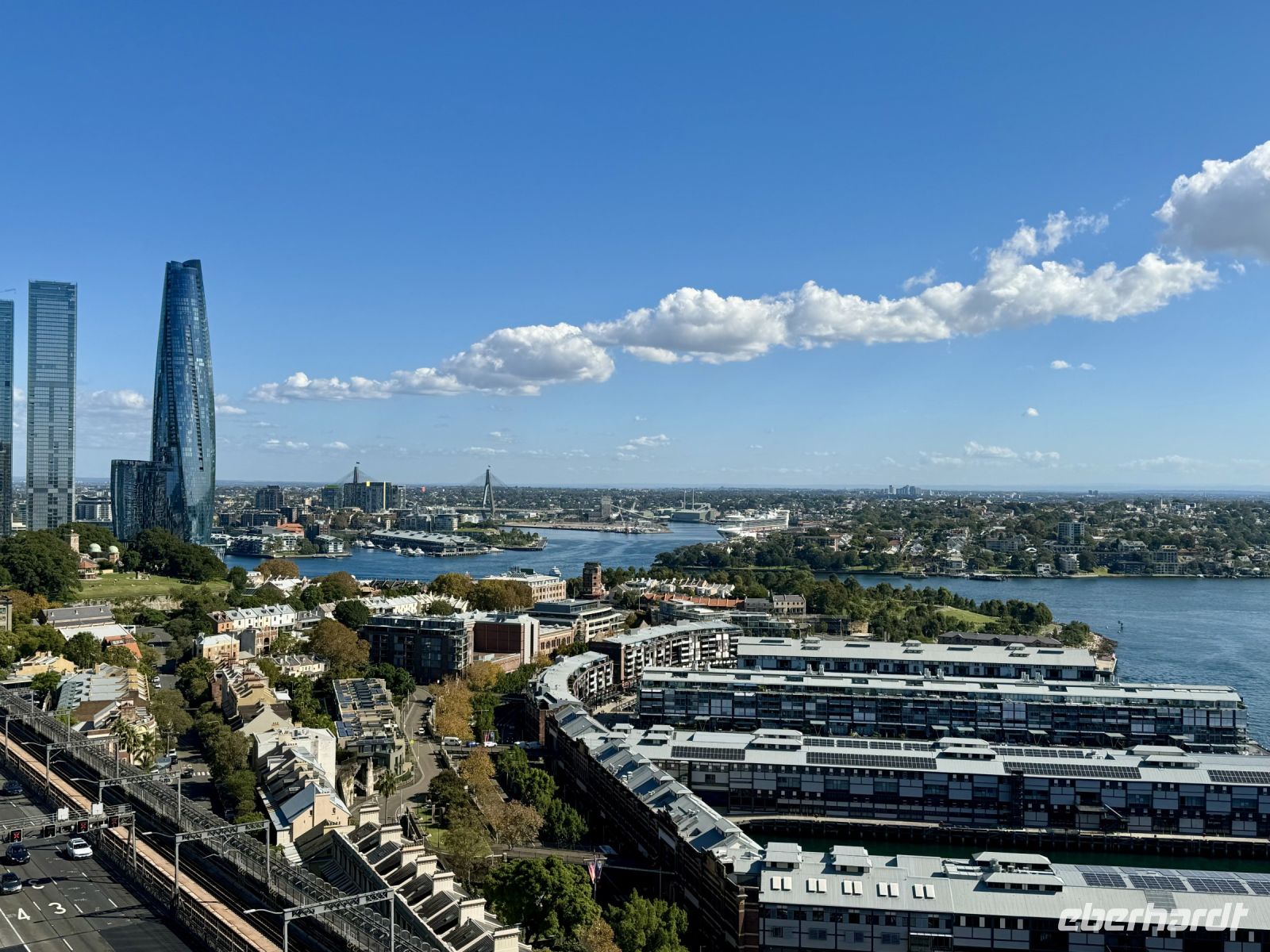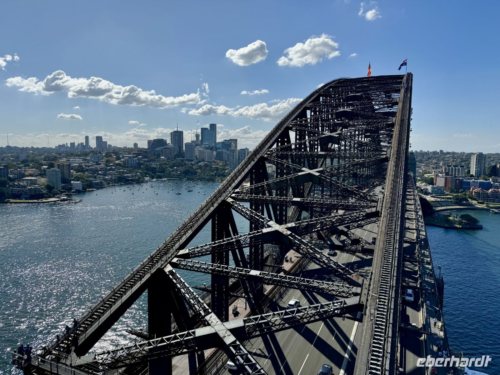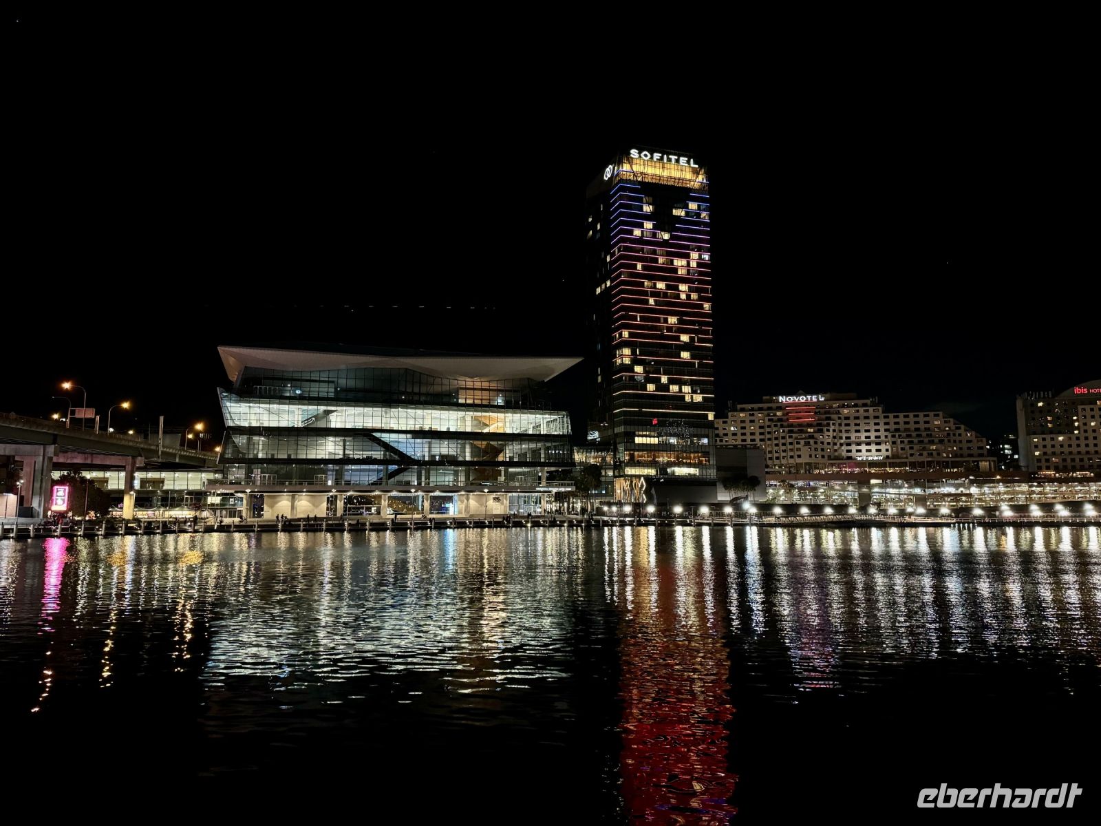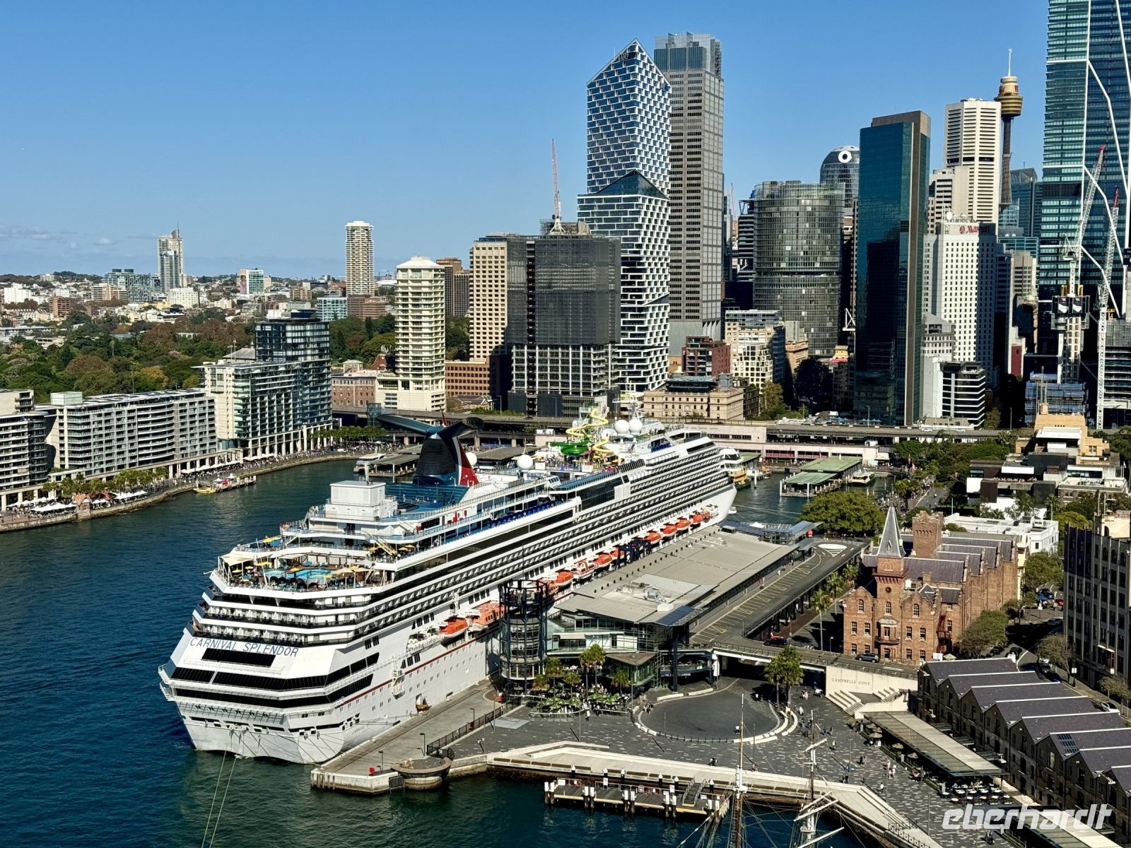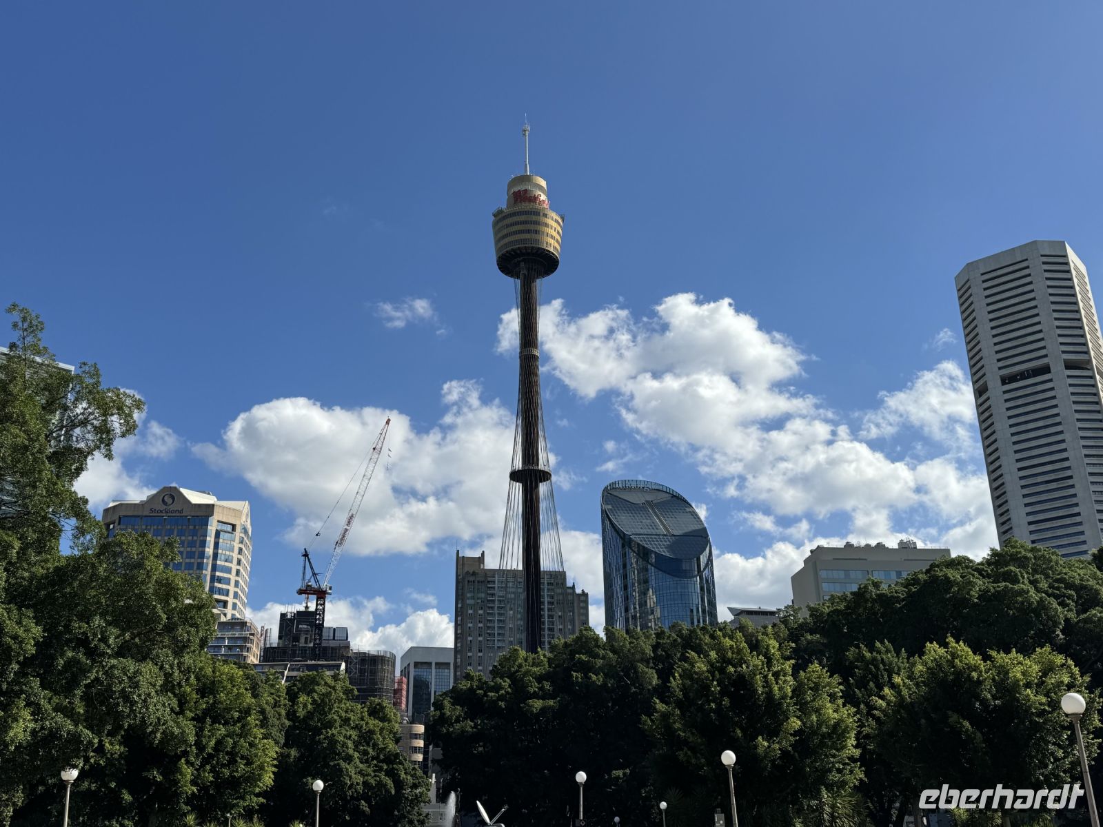 Wie schön, dass wir heute nach Sydney fliegen, unserer (leider) letzten Station in Australien! Dort erwarten uns sonniges Wetter und angenehme Temperaturen, während es in Cairns immer noch ein bisschen regnet. Meine Gäste schlafen alle noch, als ich leider mit einem Herrn mitten in der Nacht bereits ins Krankenhaus muss. Die gute Nachricht ist dann jedoch, dass wir alle zusammen als Gruppe nach Sydney weiterziehen dürfen und niemanden zurücklassen müssen. Beim Anflug auf die größte Stadt Australiens können wir auf der linken Seite das Hafenbecken, die Hafenbrücke und sogar das Opernhaus sehen. Viel Wasser und viel Grün dominieren den Blick nach unten und steigern unsere Vorfreude. Unsere langjährige erfahrene örtliche Reiseleiterin Uli erwartet uns bereits direkt nach dem Ausstieg mit dem Eberhardt-Schild. Ich freue mich wirklich riesig, sie wiederzusehen. Wie immer ist sie gut vorbereitet und hat Stadtpläne für uns besorgt, auf denen sie die wichtigsten Stationen und Ziele unseres Aufenthalts in Sydney markiert hat. Auf der Fahrt zum Hotel bekommen wir von ihr alle wichtigen Infos und können nach Ankunft im Hotel direkt das Stadtzentrum erkunden. Leider geht es unserem kranken Herrn nach dem Flug und langen Tag sehr viel schlechter, sodass wir uns gezwungen sehen, erneut den Krankenwagen zu rufen. Sowohl vom Hotelpersonal als auch allen anderen Gästen aus der Reisegruppe bekommen wir viel Unterstützung, allen voran von den medizinisch geschulten Gästen, wofür wir sehr, sehr dankbar sind. Fast alle Gäste stürzen sich spätestens nach dem Abendessen ins Nachtleben, laufen zum Circular Quay und Opernhaus und/oder fahren hinauf auf den Aussichtsturm. Auf meinem Telefon erreichen mich viele tolle Fotos von Sydney bei Nacht.