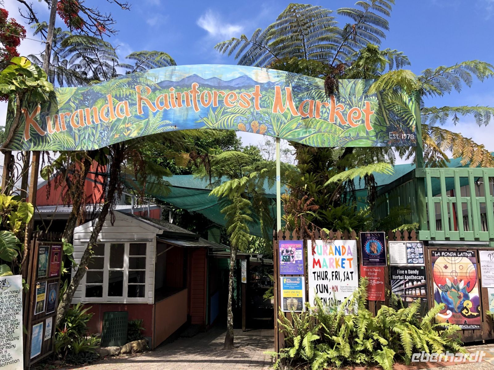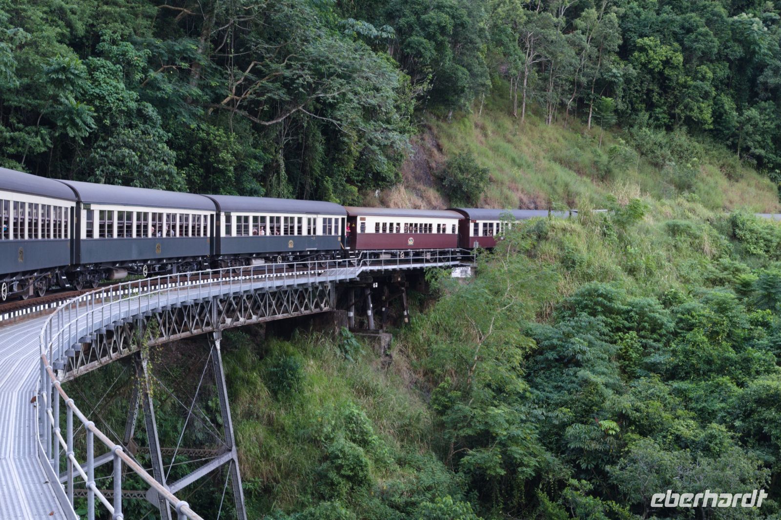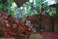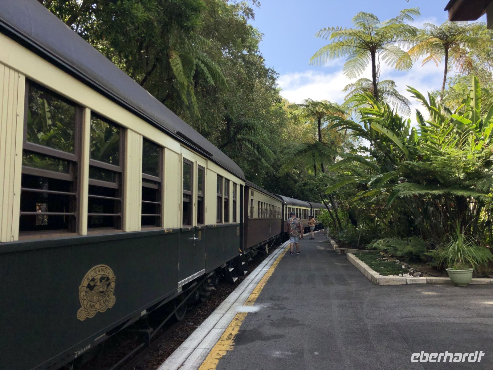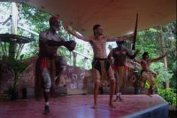 Heute steht ein erlebnisreicher Tagesausflug nach Kuranda auf dem Programm - ein charmantes Bergdorf mitten im Regenwald! Am Morgen fahren wir mit dem Bus zur Kuranda Skyrail, einer spektakulären Seilbahn, die uns hoch über den Baumwipfeln schwebend nach Kuranda bringt. Unterwegs steigen wir zweimal aus und machen kleine Spaziergänge durch den dichten Regenwald. Wir bestaunen endemische Pflanzen, beeindruckende Bäume wie den Queensland Kauri und entdecken auch die eine oder andere Spinne in ihrem Netz. In Kuranda angekommen, spazieren wir durch das hübsche Örtchen, bis zum Schmetterlings-Garten, wo wir vom Shuttlebus zur Rainforest Station abgeholt werden. Hier bleibt Zeit für einen Kaffee oder ein Foto mit einem Koala auf dem Arm, was sich einige nicht entgehen lassen. Danach besuchen wir den Pamagirri Aboriginal Kulturpark. Wir schauen uns die traditionelle Tanzshow an und machen dann mit unserem Aboriginal-Guide den Dreamtime Walk. Jeder darf einmal selbst den Bumerang werfen, bevor wir eine beeindruckende Demonstration von Tierlauten auf dem Didgeridoo und Speerwerfen erleben. Zurück in Kuranda haben wir Freizeit: Zeit für ein leckeres Mittagessen, z.B. einen australischen Pie oder auch eine deutsche Bratwurst, und zum Bummeln durch die kleinen Läden und Märkte. Einige nutzen die Gelegenheit und besuchen den Vogelpark, um den berühmten Kasuar (Cassowary) zu bestaunen. Am Nachmittag geht es zurück nach Cairns - und zwar stilecht mit der historischen Kuranda Scenic Railway. Die über 100 Jahre alte Bahn schlängelt sich auf einer atemberaubenden Strecke durch dichte Regenwälder und entlang steiler Berghänge. Unterwegs genießen wir spektakuläre Ausblicke auf tiefe Schluchten, grüne Täler und die weite Küstenlandschaft bis hinunter zum Meer. Der Zug hält außerdem kurz für einen kurzen Fotostopp an den Barron Falls, einem beeindruckenden Wasserfall, der sich über steile Felsen in die Tiefe stürzt - besonders beeindruckend am Ende der Regenzeit. Wir steigen kurz aus, um die gewaltigen Wassermassen zu bestaunen und ein paar Fotos zu machen. Danach geht es weiter durch zahlreiche Kurven und Tunnel zurück nach Cairns.