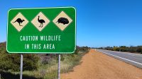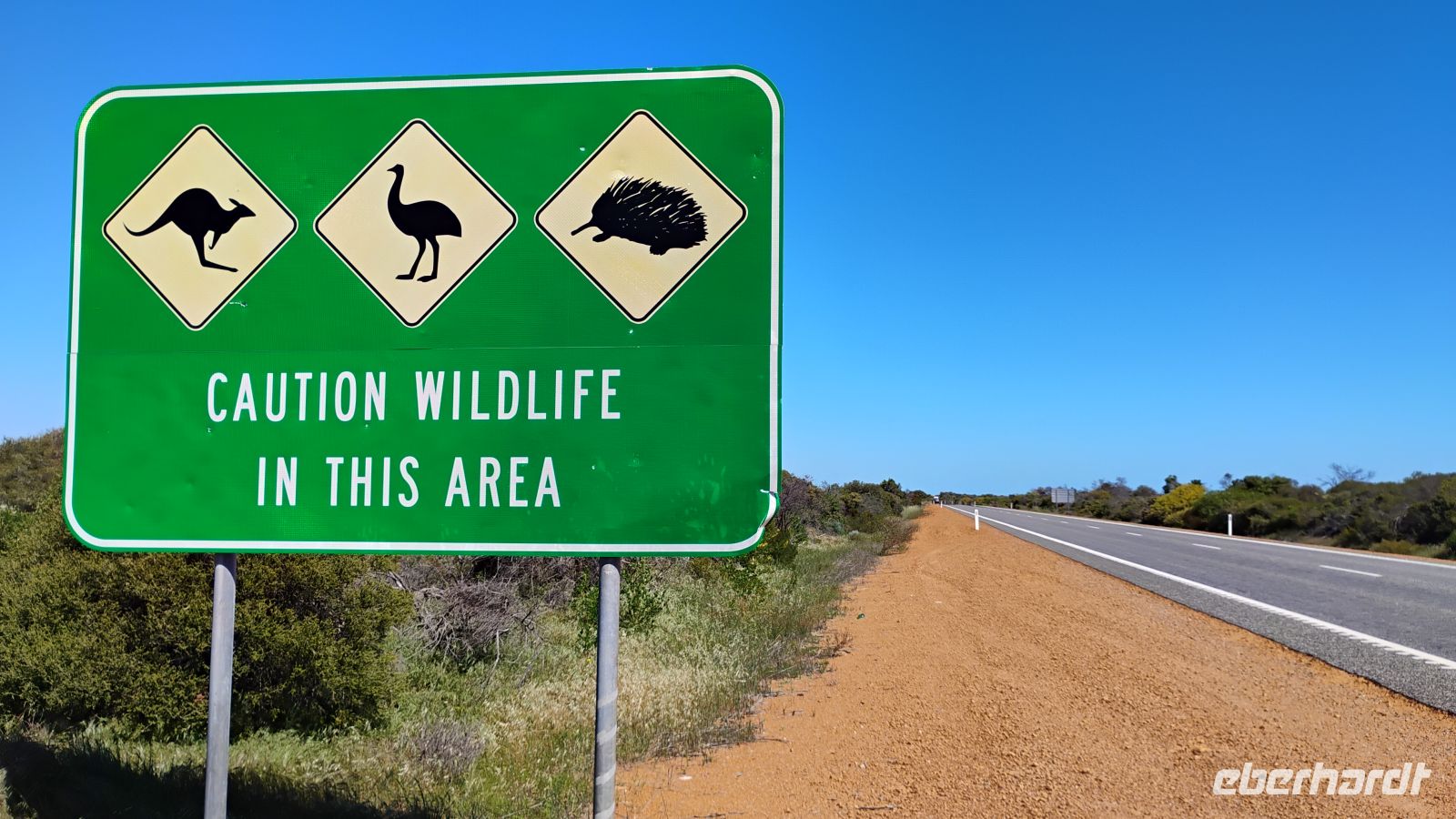 Auf der Weiterfahrt sehen wir am Straßenrand ein Verkehrsschild „Caution – Wildlife Crossing“ – und kurz darauf tatsächlich einen Emu! Damit haben wir heute alle drei australischen Klassiker gesehen: Koala, Känguru und Emu!