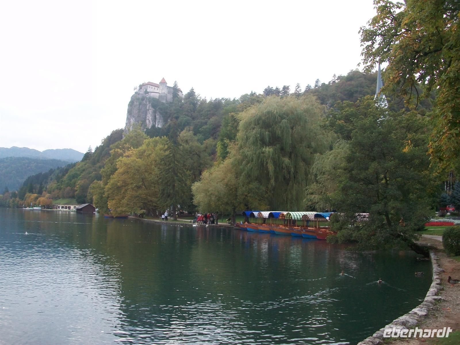 Der Ort Bled selbst ist an dem einen Ende des Sees entstanden und zieht sich im Bogen um diesen herum. Auf einem Felsen, 100 Meter über dem Wasserspiegel, thront die Burg, von deren Hof man seinen Blick weit schweifen lassen kann über den See und die Berge.