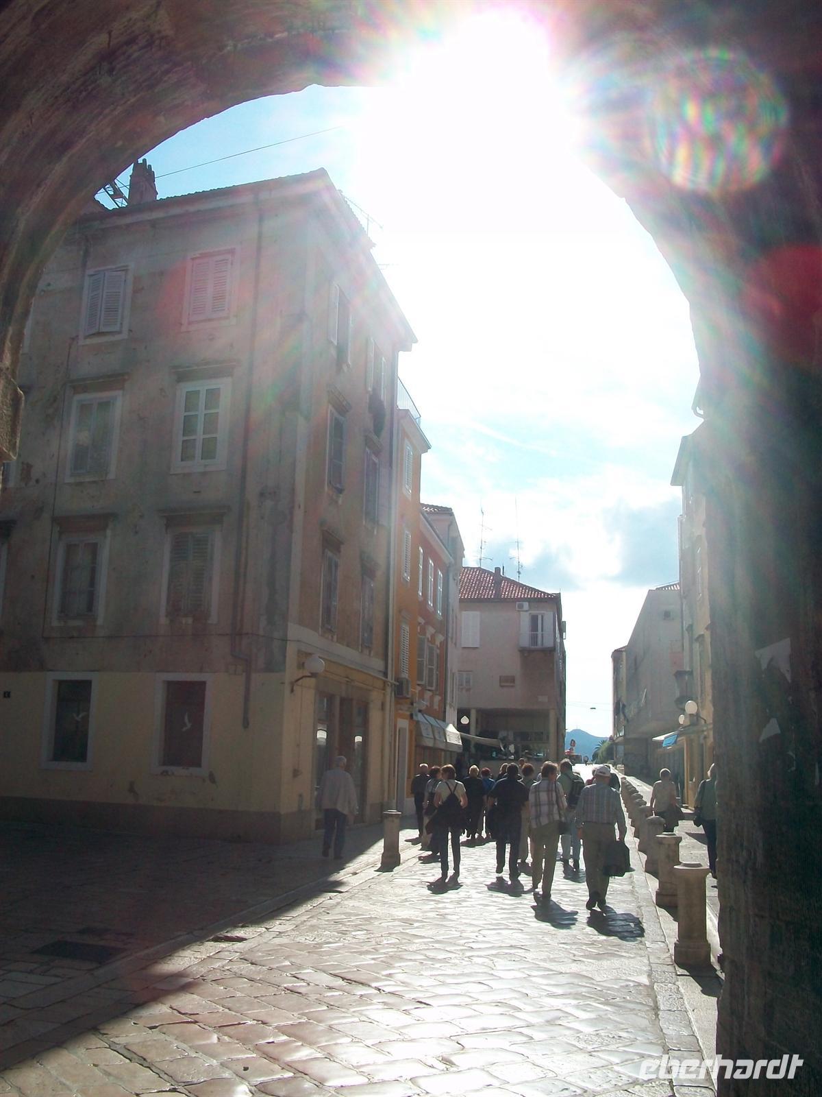 Die Sonne hat hier nun den Kampf gegen den Nebel gewonnen und bescheint eine außerordentlich reizvolle Szenerie. Im Hintergrund sind die bekannten Inseln des Kvarners zu sehen: Cres und Krk und rechts an das Gebirge schließt sich die Halbinsel Istrien an. Ein wunderschönes Panorama begleitet unsere Fahrt. Doch geht es hinter Rijeka, dem wichtigsten kroatischen Hafen, erst noch einmal in das Hinterland. Wenn wir auch jetzt die Adria verlassen müssen, in Zadar werden wir sie wieder sehen und die nächsten Tage auch nicht mehr verlassen.