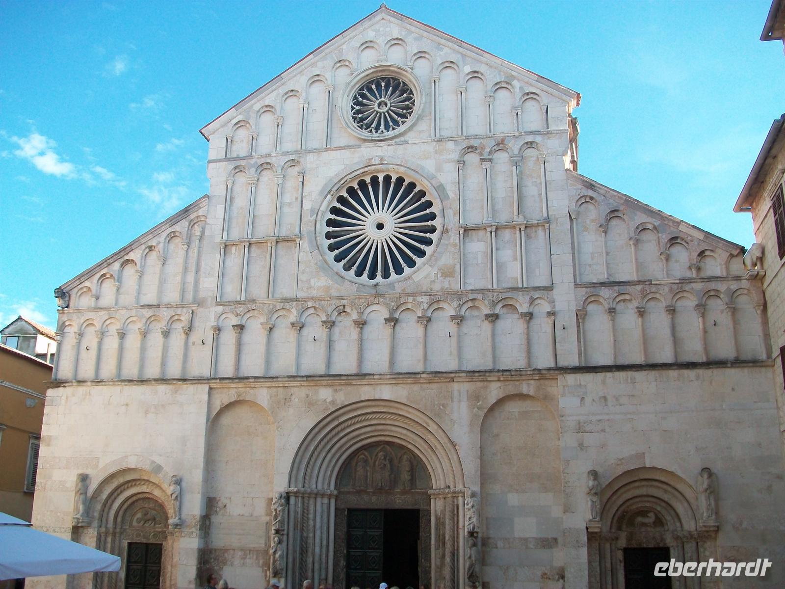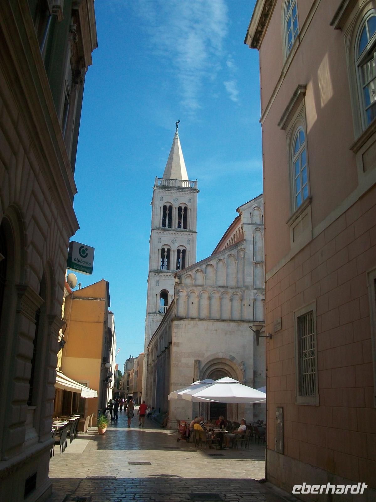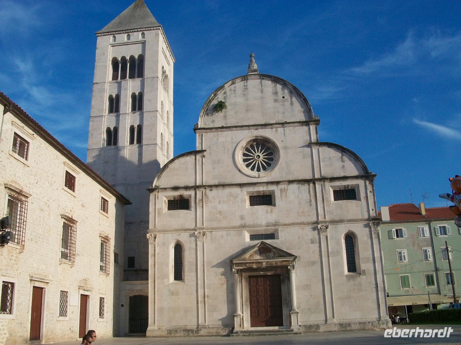 Die Tour geht zuerst zur Kathedrale die im romanischen Stil erbaut wurde und später auch andere Stilelemente bekam. Überhaupt bleibt anzumerken, dass Zadar die Stadt verschiedener Baustile ist, von den Überbleibseln aus der Römerzeit bis zur Moderne ist hier alles vorhanden. Als Kontrastprogramm führt uns Maja nun zum Neuesten was die Stadt zu bieten hat, zur Wasserorgel. Zadar liegt auf einer Halbinsel und an deren Spitze ist dieses eigenartige Musikinstrument eingebaut. Hier macht Mutter Natur Musik; die unter dem Gehweg liegenden Pfeifen werden durch den Wellengang der Adria zum Klingen gebracht. Man erwarte dabei aber keine Harmonien, alles klingt etwas abstrakt. Leider ist heute kaum Wind und das Konzert hält sich in Grenzen.