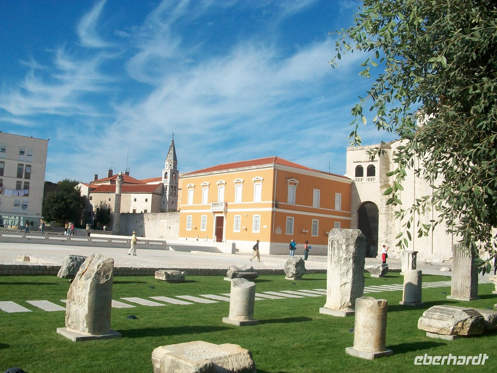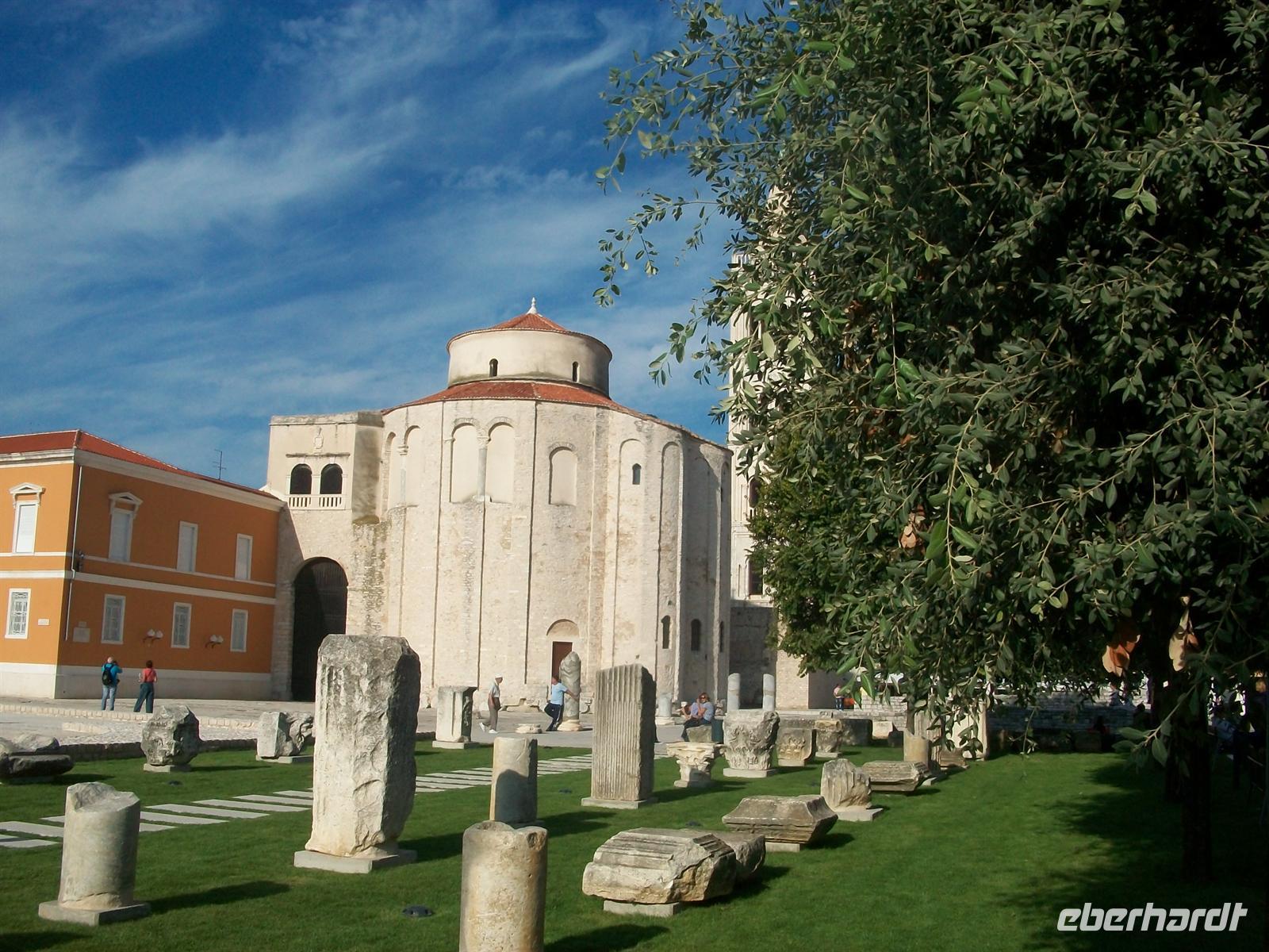 Unser Weg führt uns weiter an der schönen Strandpromenade entlang, bald stehen wir vor dem ehemaligen Forum Romanum und haben von hier einen wunderschönen Blick auf die Donatskirche und den Glockenturm der Kathedrale. Dieses einmalige Panorama ist das besondere Vorzeigemotiv von Zadar. Dann besuchen wir die Rotunde der Donatskirche, die in ihrem Inneren einen interessanten Aufbau hat und der Vorromanik zuzuordnen ist. Heute dient dieser Bau schönen Konzerten als Heimstatt, sie ist also verweltlicht.