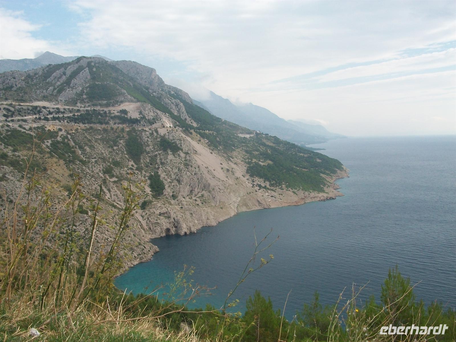 Vor uns eine Bucht und wir befinden uns über 100 Meter oberhalb dieser malerischen Stelle. Es ist 14.00 Uhr und eine Stunde nach Abfahrt haben wir diesen Ort erreicht, der einen Fotostopp immer lohnt. Hoch über der Adria, über die wir von hier unsere Blicke schweifen lassen, sehen wir die Inseln Brac und Hvar und an der Küste entlang ziehen sich die schroffen Karsthänge des Biokovogebirges. Hier beginnt ein besonders schöner Abschnitt der Dalmatinischen Küste: die Makarska- Riviera. Diese Fahrt entlang der Küste zählt mit zum Schönsten was Europas Panoramastraßen zu bieten haben.