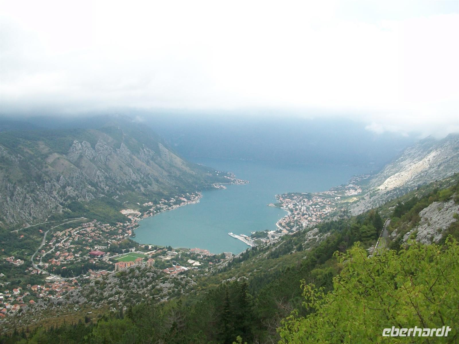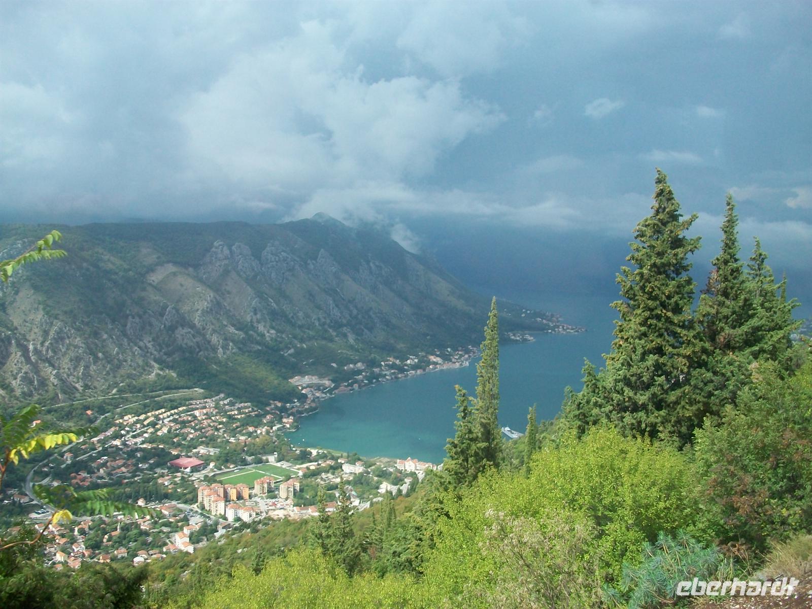 Oben in den Bergen haben sich die Wolken fest gehangen, es sieht schon etwas bedrohlich aus, zumal es wieder etwas gewittrig geworden ist. Kurve für Kurve arbeiten wir uns nach oben, der Blick geht immer wieder hinunter nach Kotor und zur Bucht, alles wird kleiner.