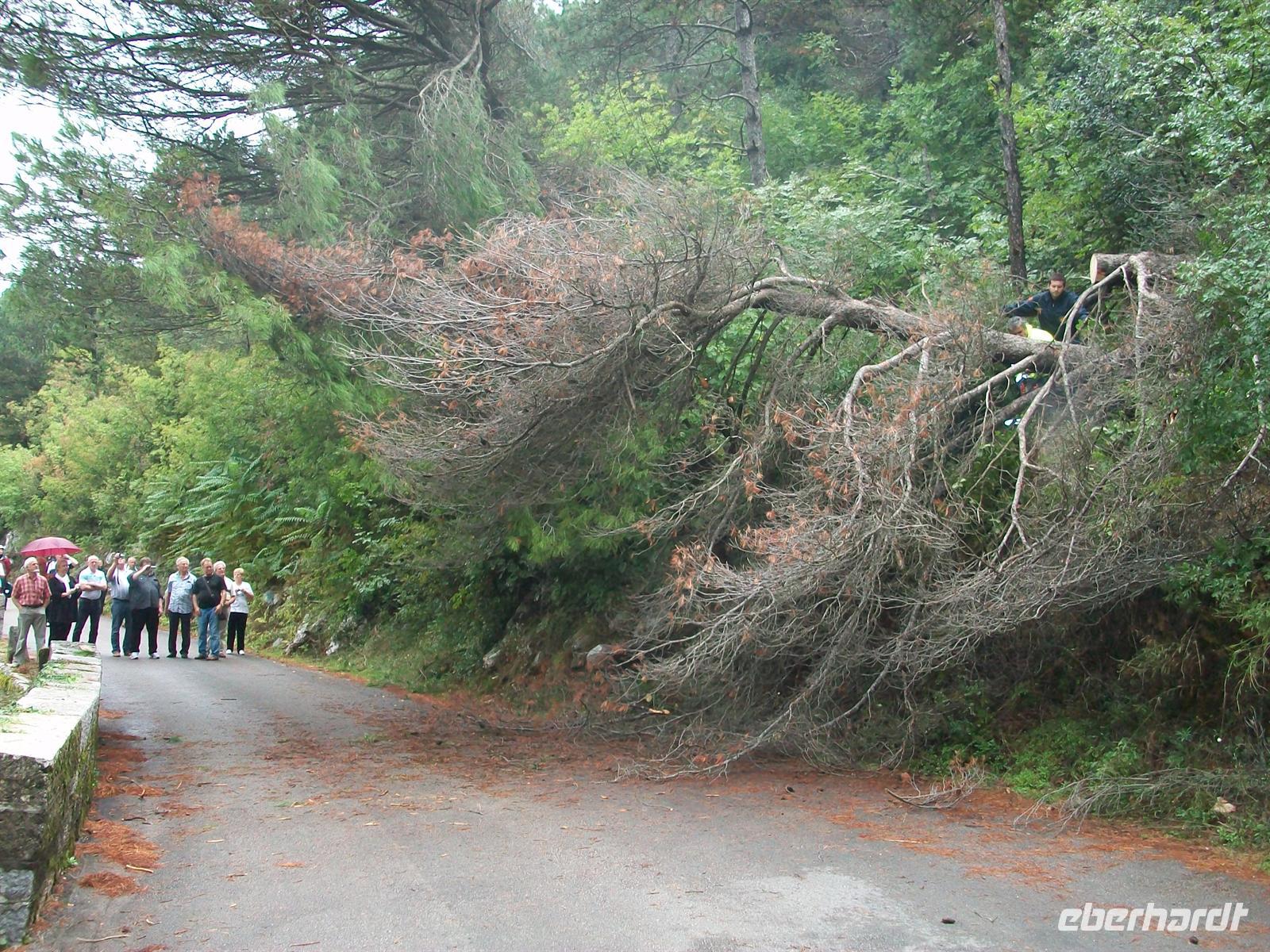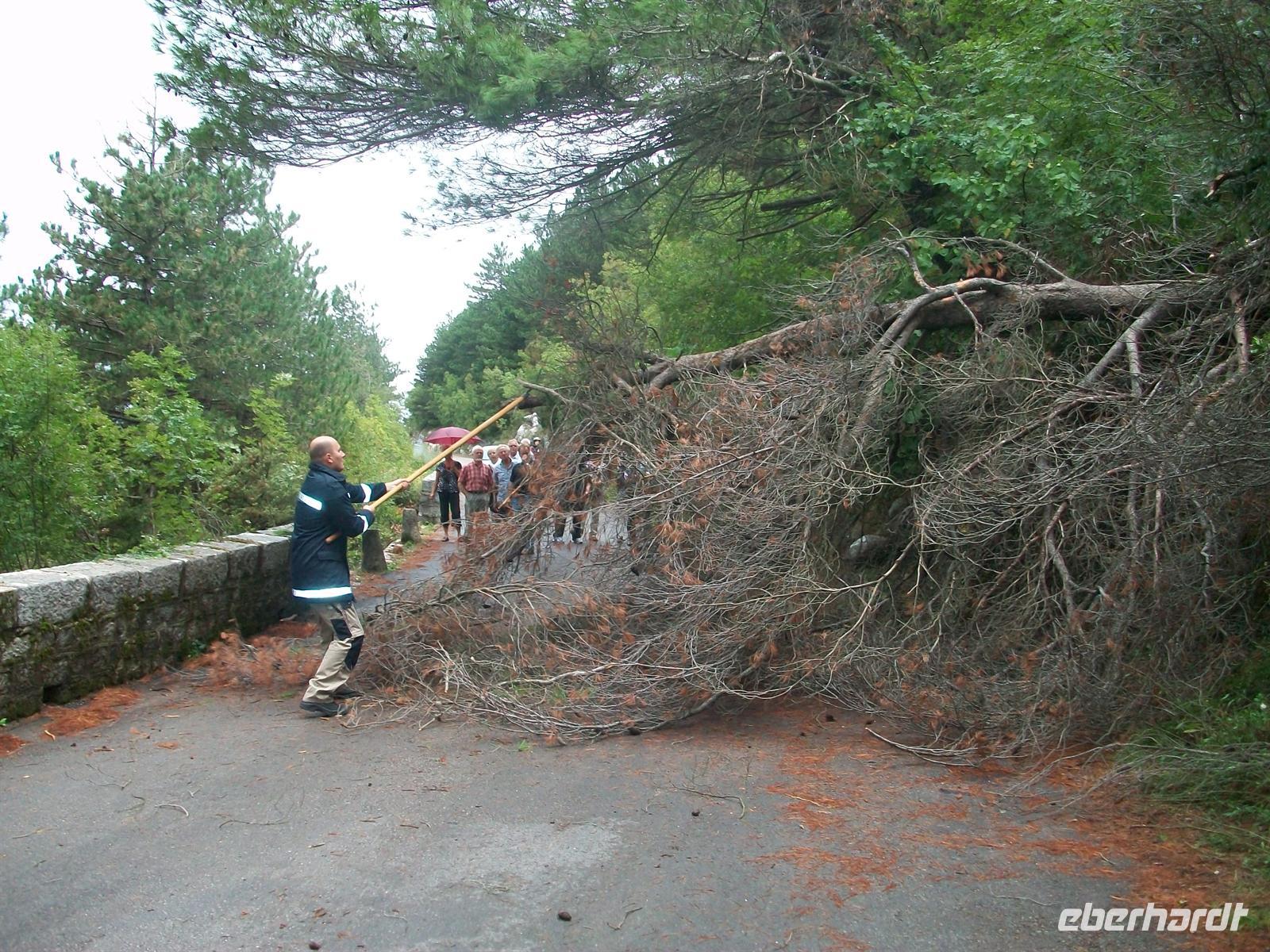 Doch nach einer knappen halben Stunde sind die Kameraden der Feuerwehr angekommen und zügig gehen diese ans Werk. Mit Kettensäge und Handarbeit wird der Baum zerlegt, zum Glück ist keine Erde nachgerutscht und bald ist die Straße wieder frei- die Fahrt kann weiter gehen. Das Problem ist nur, wir haben hier fast eine Stunde Zeit eingebüßt und der Zeitrahmen an diesem Tag ist eng begrenzt. Aber es sind höhere Gewalten und Mutter Natur beweist uns manchmal dass nicht wir die Herren über die Welt sind.
