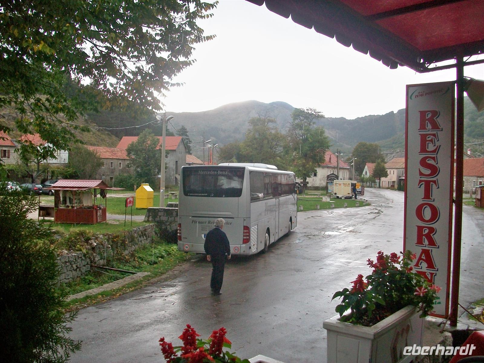 Bald haben wir die 1 000 Metermarke geknackt, aber hier sind wir schon in den Wolken, die geheimnisvoll unseren Weg umwabern, Berggeistern gleich, die Ausschau halten nach den kecken Touristen die sich in ihr Reich wagen. Sie treiben mit uns allerlei Spiel, unseren sicheren Chauffeur können sie aber nicht narren. Mit geübter Hand führt er den Bus hinauf und oben, in der Hochebene von Njegusi, ziehen sich die Wolken zurück und geben uns den Weg frei. Wir durchfahren diese eindrucksvolle Hochebene und bald schon haben wir das Restaurant erreicht, wo für uns ein kleiner Mittagsimbiss vorbereitet ist.