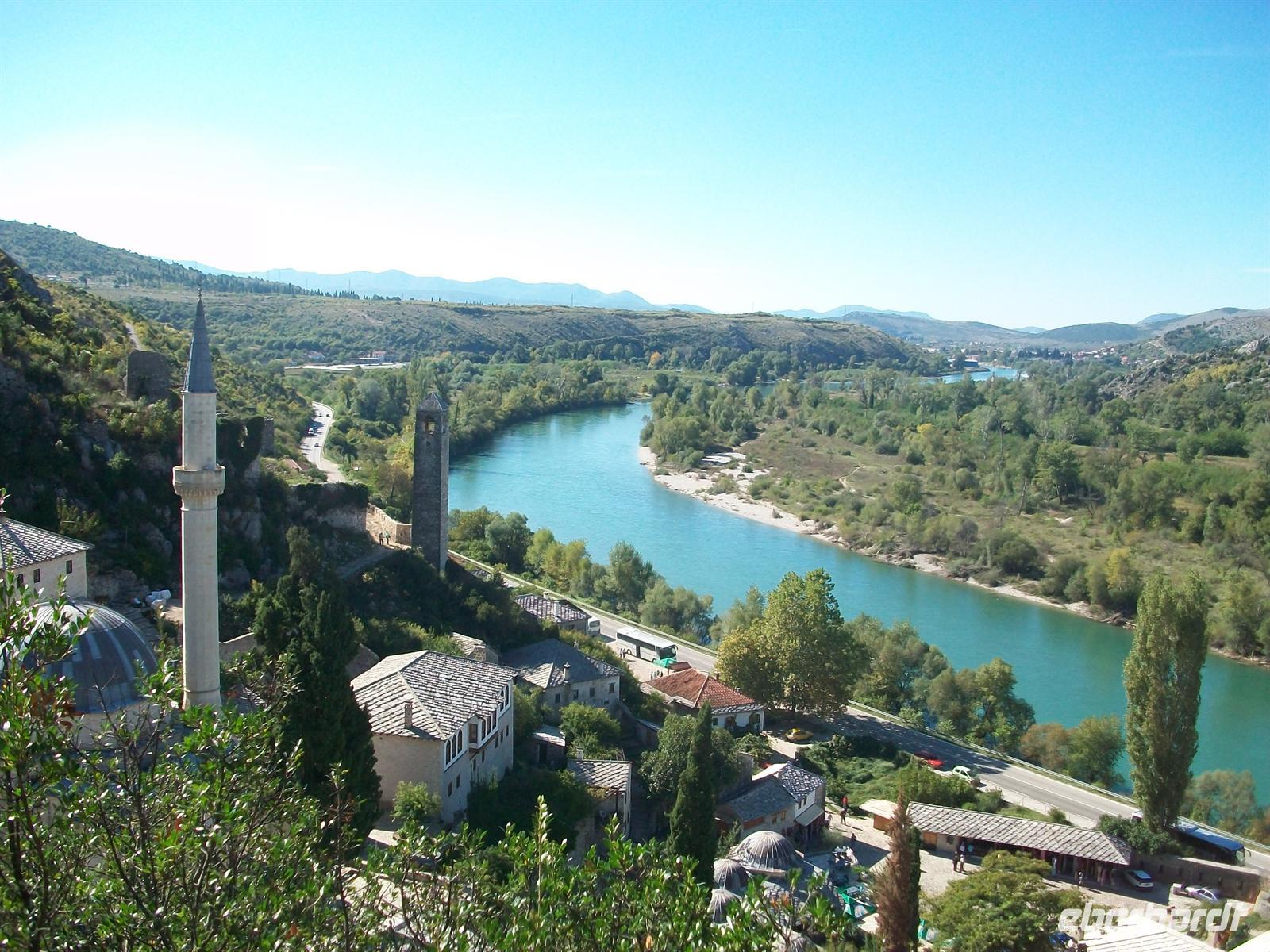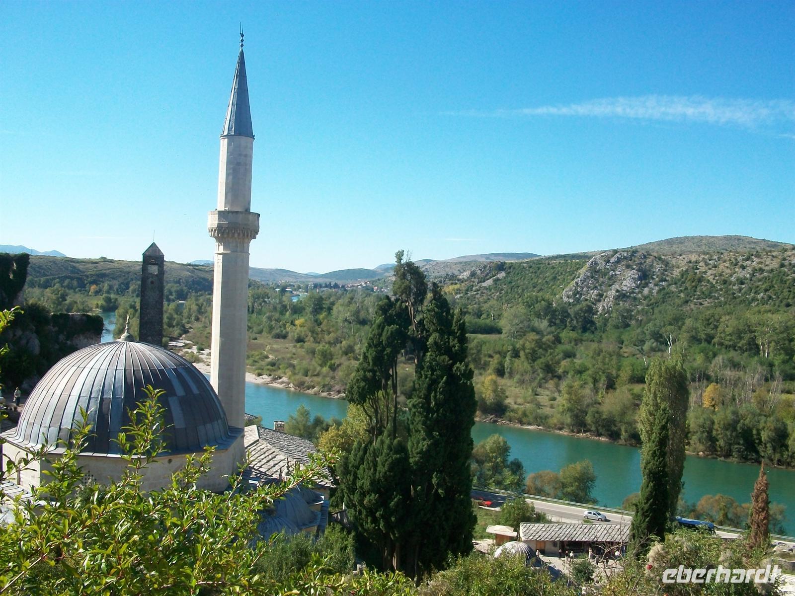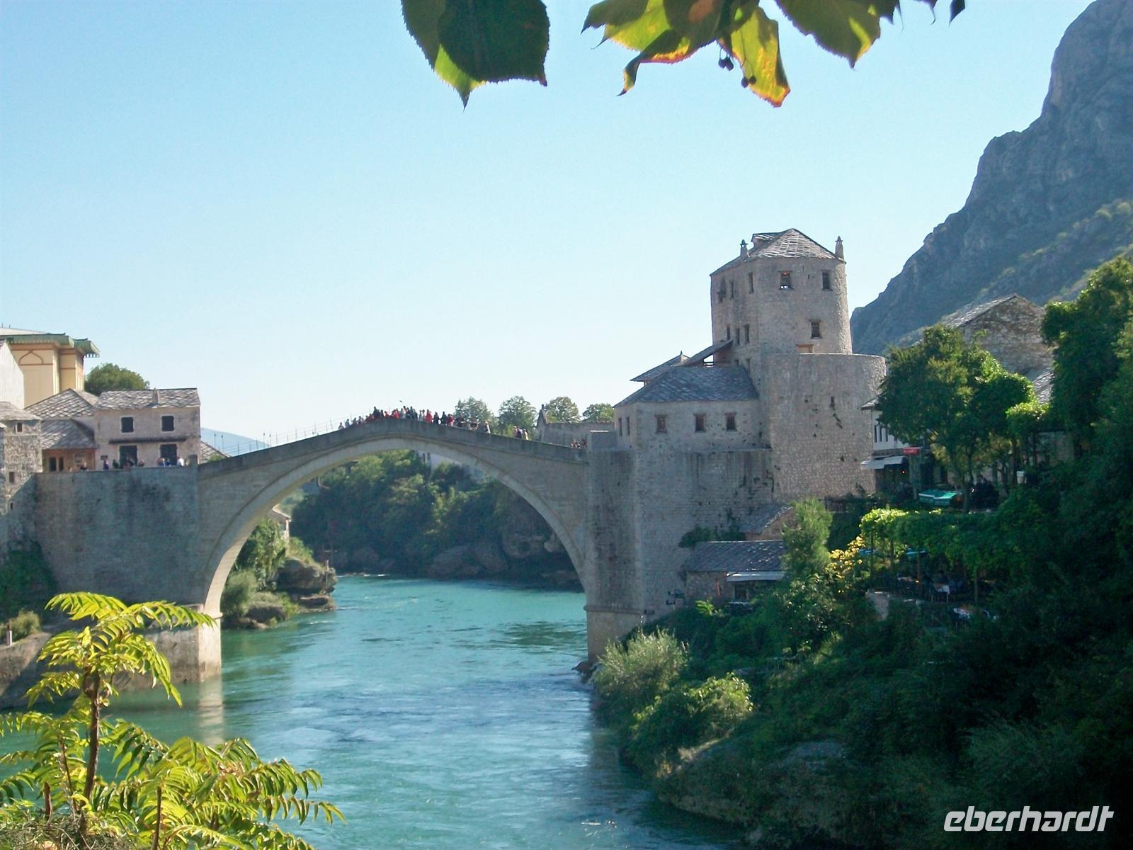 Ein kurzer Stopp an unserem Hotel, hier treffen wir uns mit dem örtlichen Guide und die Besichtigung kann losgehen. Wir fahren zuerst zum Franziskanerkloster mit dem mächtigen Uhrturm, der nach dem Krieg neu entstand. Hier stellen wir den Bus ab und nun werden wir uns die Altstadt zu Fuß erschließen. Ein kleiner Spaziergang und bald haben wir das etwas holprige Pflaster der Altstadt erreicht. Vor unseren Augen breitet sich nun ein Panorama aus welches ganz typisch für diese Gegend ist. Auch hier sind alle Gebäude im osmanischen Stil gehalten, die bis hinunter zur Neretva angelegt wurden. Durch eine schmale Gasse erreichen wir die Stari Most, die Alte Brücke. Sie ist im Jahre 2004 völlig neu entstanden und präsentiert sich dem Auge des Betrachters mit einer eleganten Schönheit. Erbaut aus weißem Kalkstein überspannt sie den Fluss in einem Bogen und die weiße Farbe der Steine bildet mit dem blauen Himmel einen schönen Kontrast.