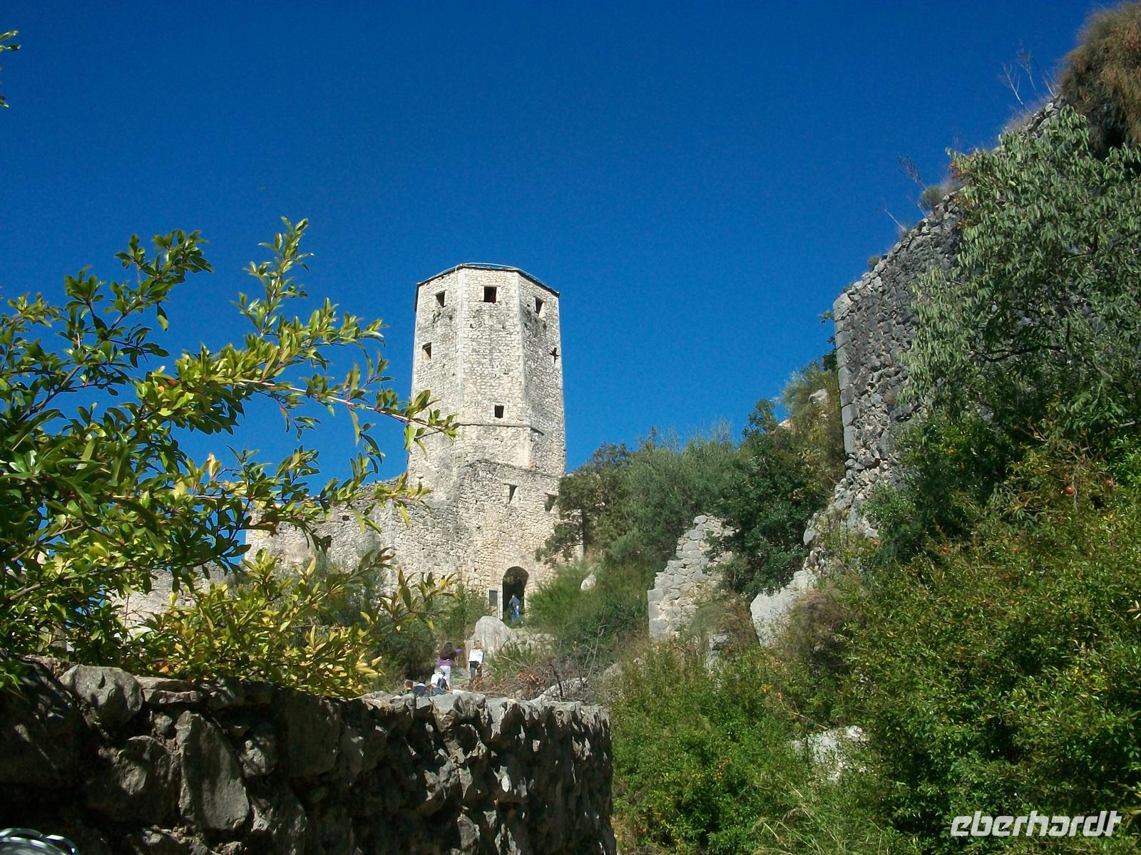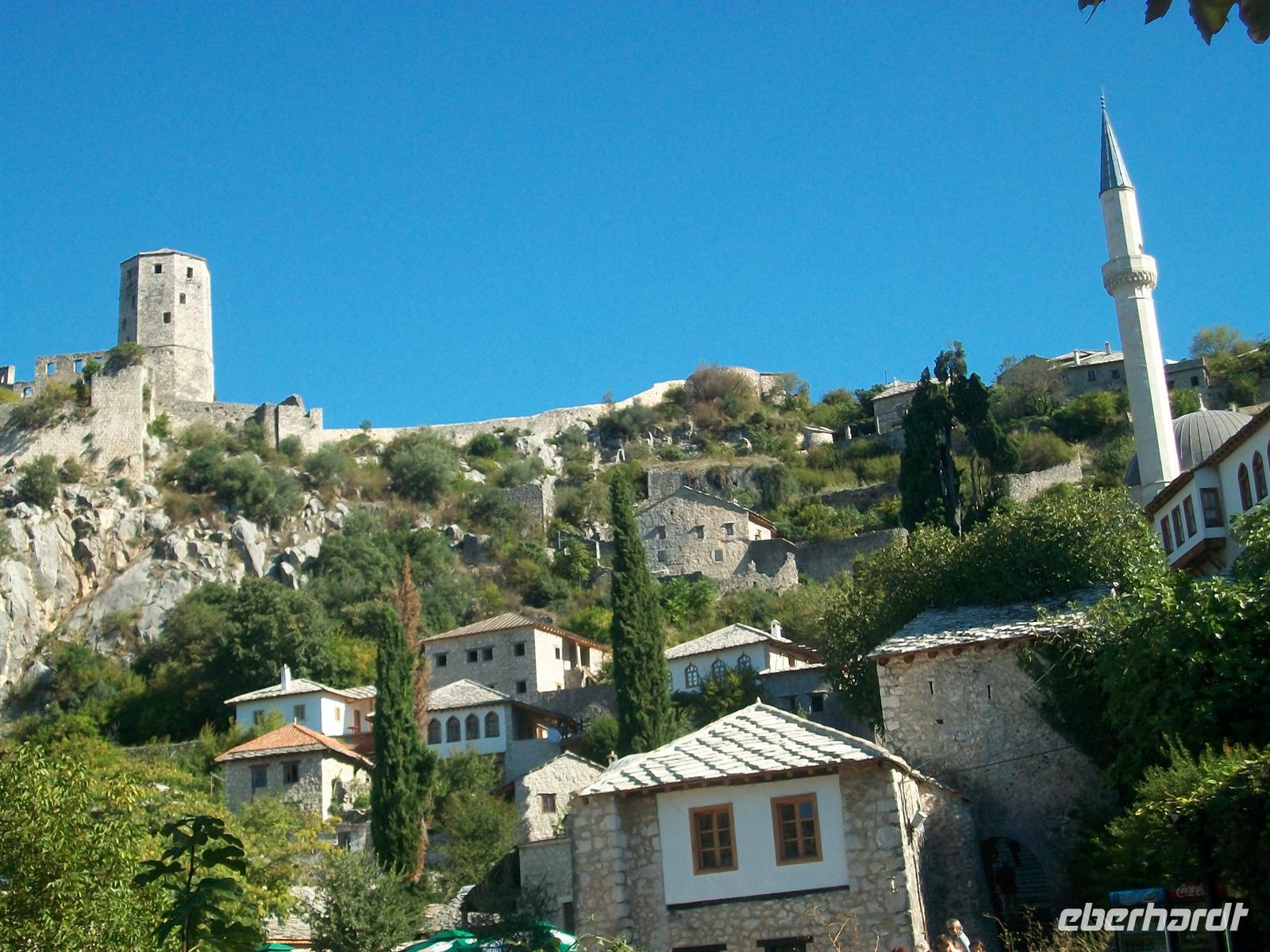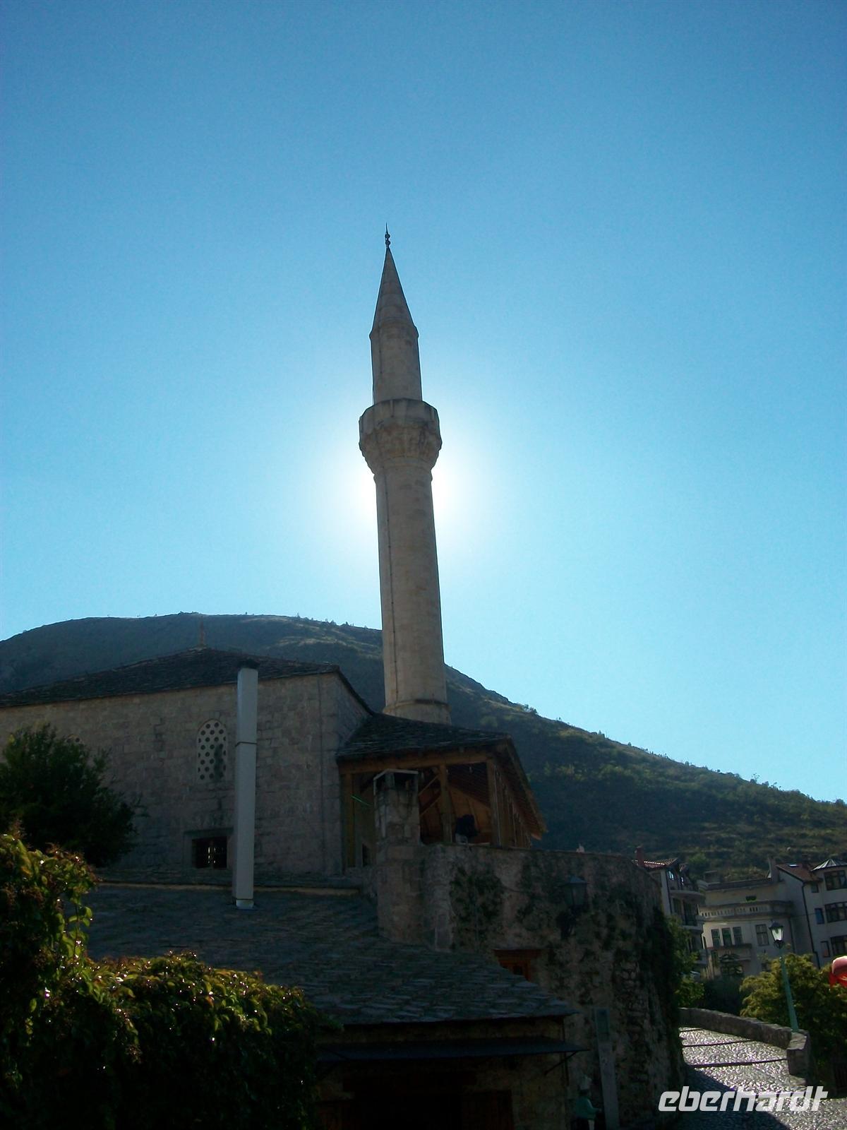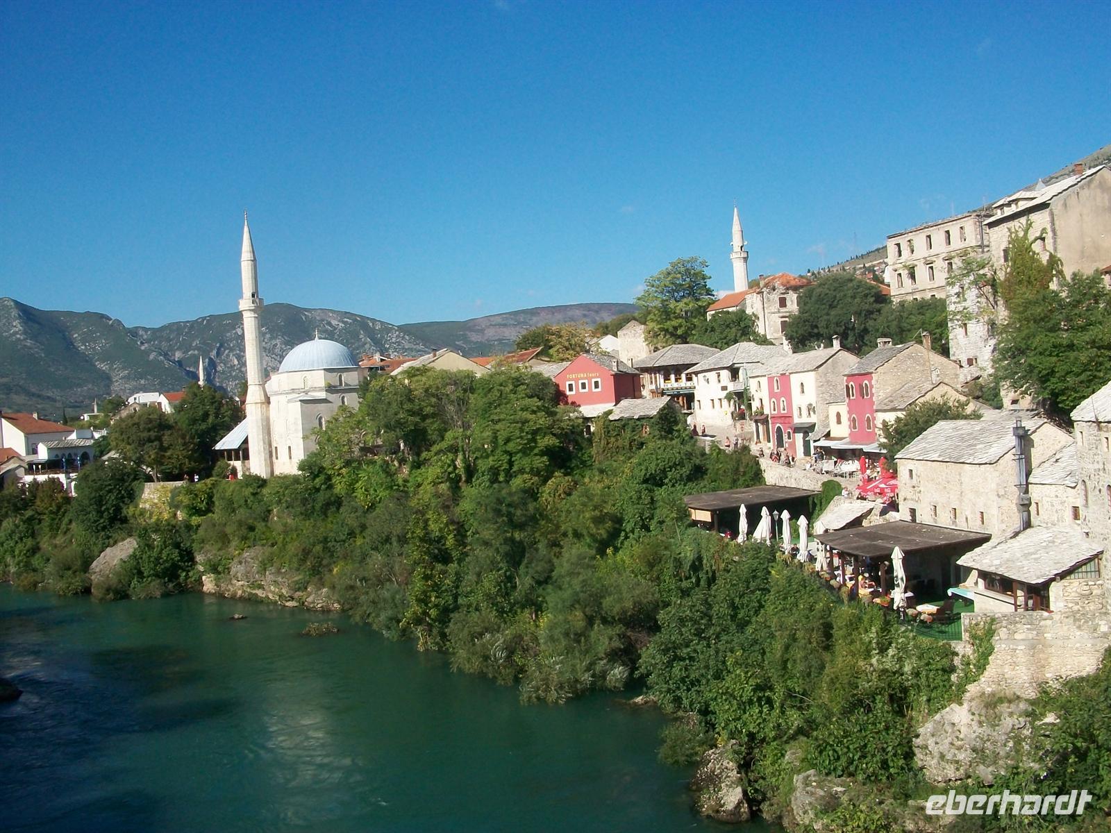 Ein kurzer Stopp an unserem Hotel, hier treffen wir uns mit dem örtlichen Guide und die Besichtigung kann losgehen. Wir fahren zuerst zum Franziskanerkloster mit dem mächtigen Uhrturm, der nach dem Krieg neu entstand. Hier stellen wir den Bus ab und nun werden wir uns die Altstadt zu Fuß erschließen. Ein kleiner Spaziergang und bald haben wir das etwas holprige Pflaster der Altstadt erreicht. Vor unseren Augen breitet sich nun ein Panorama aus welches ganz typisch für diese Gegend ist. Auch hier sind alle Gebäude im osmanischen Stil gehalten, die bis hinunter zur Neretva angelegt wurden. Durch eine schmale Gasse erreichen wir die Stari Most, die Alte Brücke. Sie ist im Jahre 2004 völlig neu entstanden und präsentiert sich dem Auge des Betrachters mit einer eleganten Schönheit. Erbaut aus weißem Kalkstein überspannt sie den Fluss in einem Bogen und die weiße Farbe der Steine bildet mit dem blauen Himmel einen schönen Kontrast.