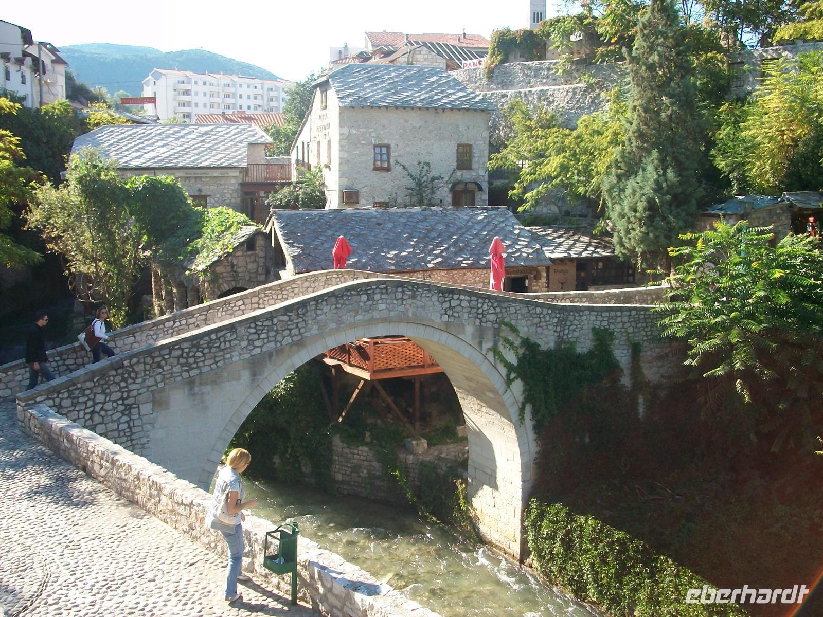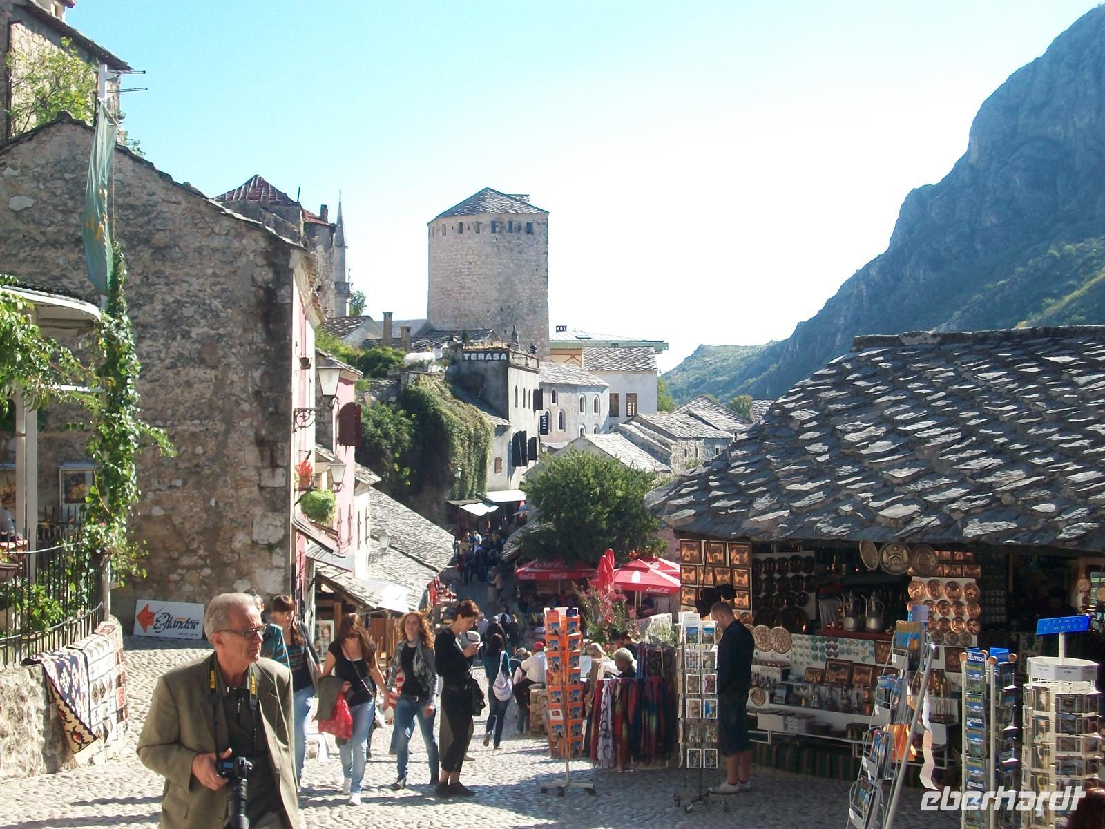 Wir gehen über die Brücke hinüber in den anderen Teil von Mostar, hier das gleiche Bild, niedrige Häuser aus Stein, dazwischen die Touristen und zahlreiche Souvenirhändler.