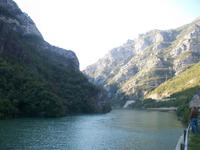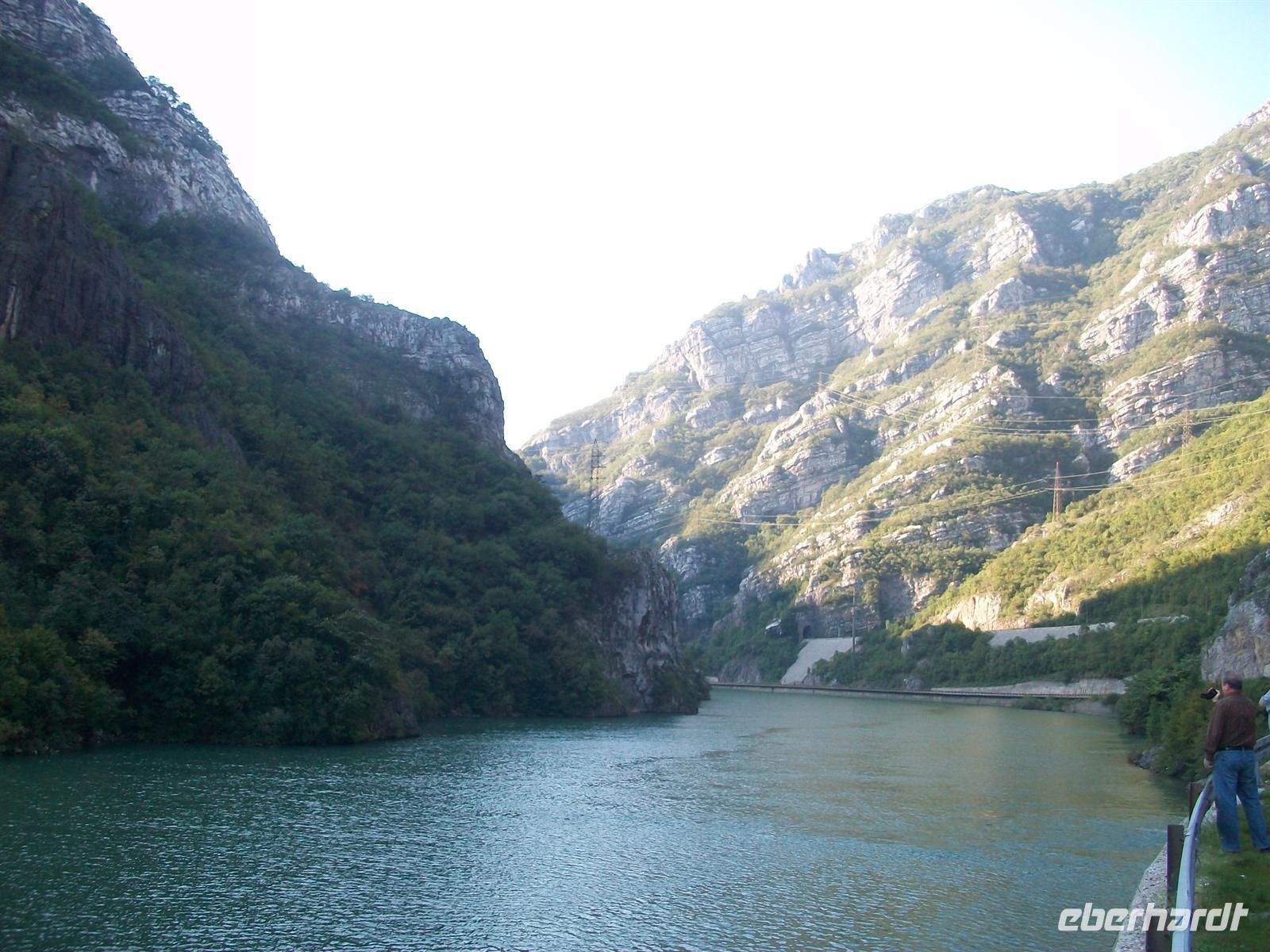 Wildromantisch ist die Fahrt durch diese Schlucht, die Berge steigen hier direkt vom Wasser steil empor und zaubern dabei ein Licht- und Schattenspiel in das Flusstal. An den Bergen eine schöne Vegetation die teilweise schon in den bunten Farben des Herbstes erstrahlt. Dieser Fahrtabschnitt zählt mit zum Schönsten auf dieser Tour, zumal uns Petrus auch heute mit viel Sonne verwöhnt.