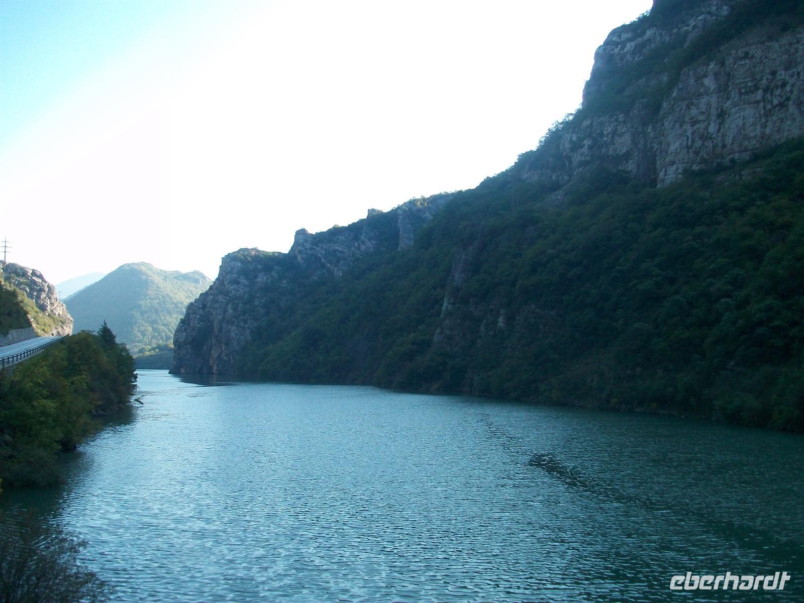 Im Ort legen wir einen Stopp ein, dann geht die Fahrt weiter in Richtung Serbien. Bald haben wir den Fluss Drina erreicht, der sich hier seinen Weg durch die Berge gesucht hat und an dieser Stelle ein reizendes Flusstal bildet. Die Sonne hat sich ihren Weg durch den Nebel gebahnt und bescheint eine wirklich schöne Szenerie mit ihren goldenen Herbststrahlen. Wir fahren an einem See vorbei, dem Zvornicko- Jezero, der auf unserer rechten Seite liegt und durch die Drina gebildet wird. Er widerspiegelt die Berge der Umgegend und hat, eingebettet in dieser Felsenlandschaft, eine wildromantische Lage.
