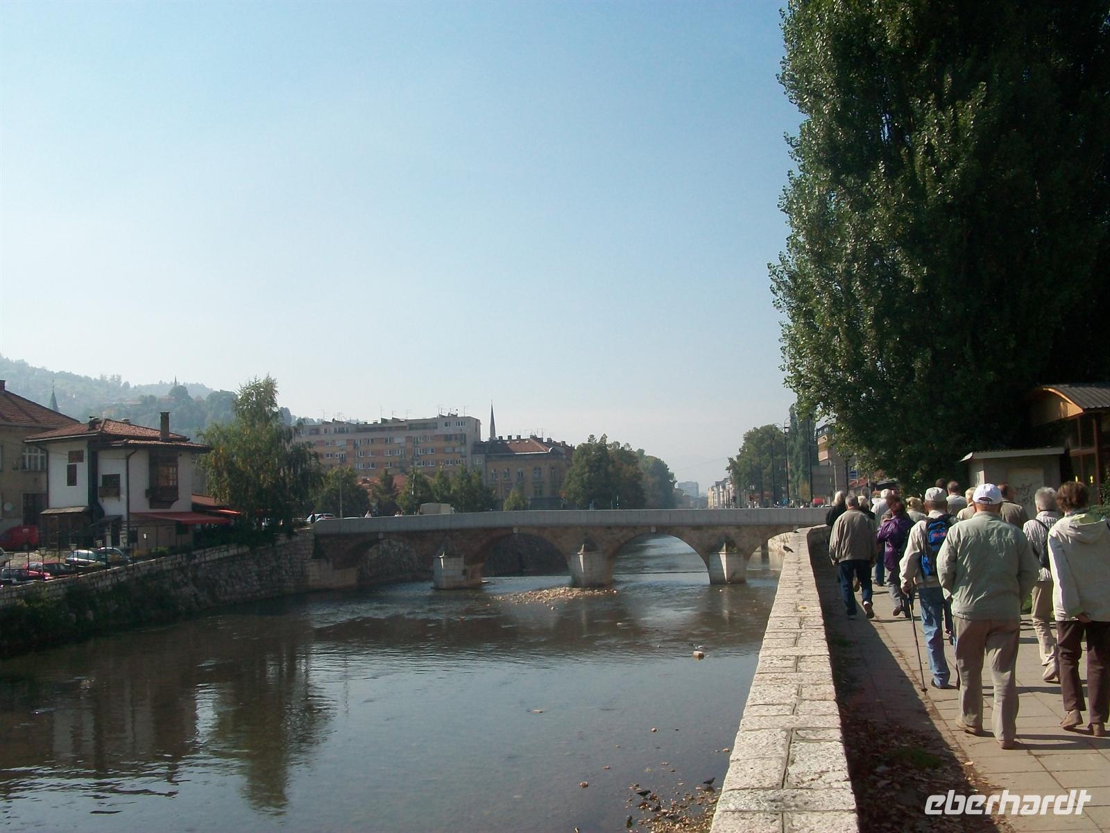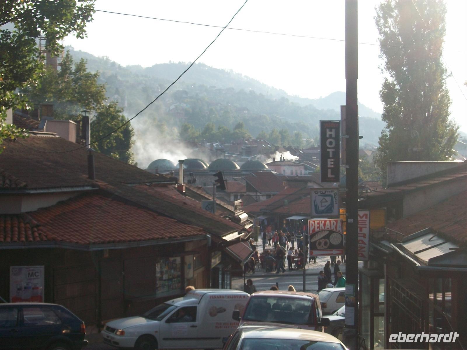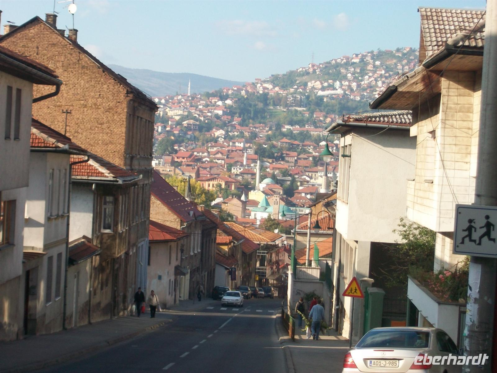 Die bosnische Hauptstadt hat in den letzten Jahren eine rasante Entwicklung hinter sich. Auf unserer Fahrt aus westlicher Richtung kommend, durchqueren wir die Vororte in denen die Gewerbegebiete wie die Pilze aus dem Boden schießen. Spätestens das ist ein Zeichen dass hier die Normalität wieder Einzug gehalten hat. Im letzten Krieg über drei Jahre blockiert, mit mehr als 10 000 Opfern, fast alles Zivilisten, war die Stadt Symbol für die Sinnlosigkeit und Grausamkeit dieses Bürgerkrieges. Aber- wie man sagt- das Leben muss weiter gehen und das kann man mit Fug und Recht von Sarajevo sagen, trotz aller noch zu lösenden Probleme: Sarajevo ist auf dem Weg eine moderne europäische Hauptstadt zu werden, in ihrem historischen Teil war sie immer schon sehenswert und den werden wir uns nun anschauen.
