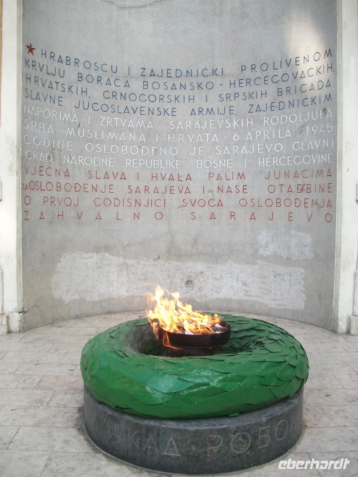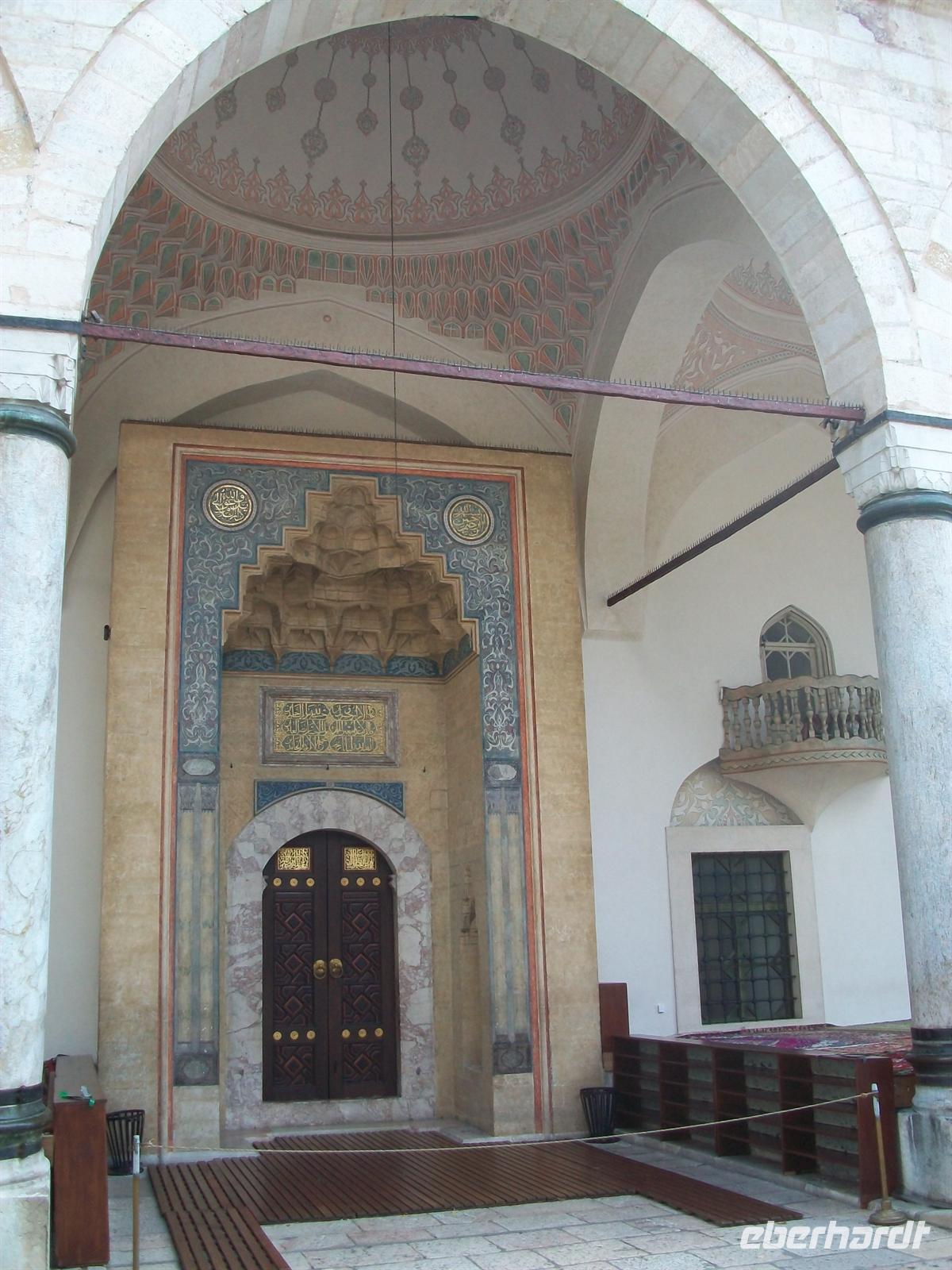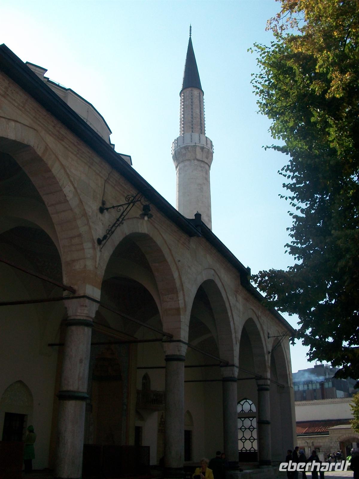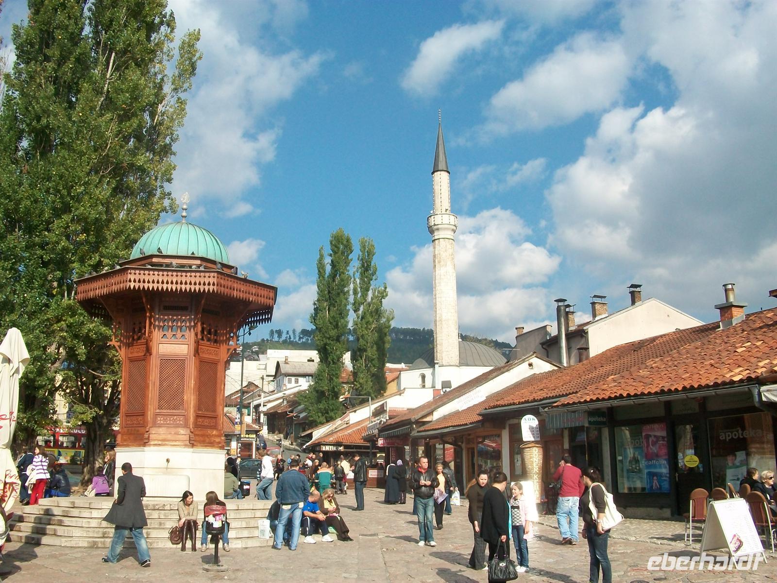 Zuerst durchqueren wir den türkischen Teil, der geprägte ist durch die schon von Mostar her bekannte Architektur niedriger Häuser, schmalen Gassen und Moscheen mit den schlanken Minaretten. Dieser Stadtteil heißt Bascarsija- eine Ableitung des Wortes Basar. Dieser Begriff aus dem Orient trifft das Leben hier am Treffendsten, die Händler bieten schöne und zum Teil handgearbeitete Waren feil, man lässt dem Touristen Zeit und Ruhe sich alles anzuschauen.