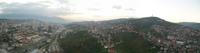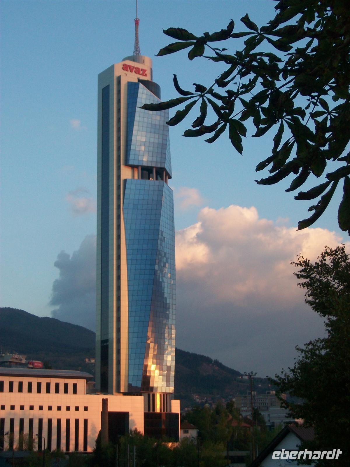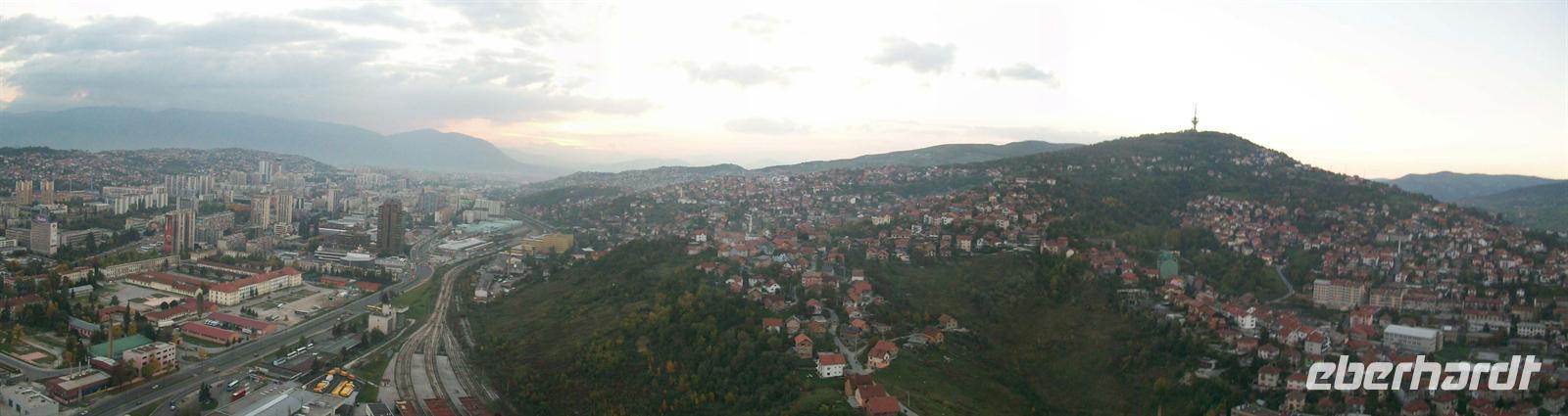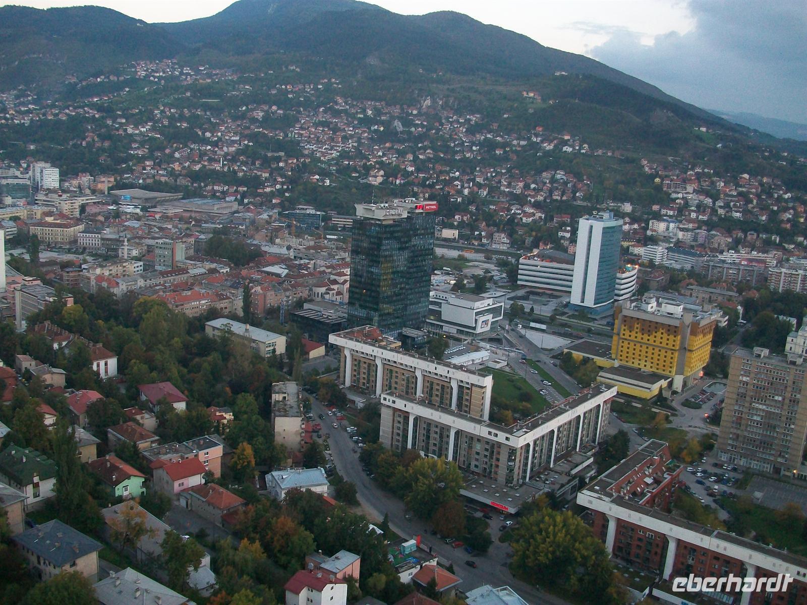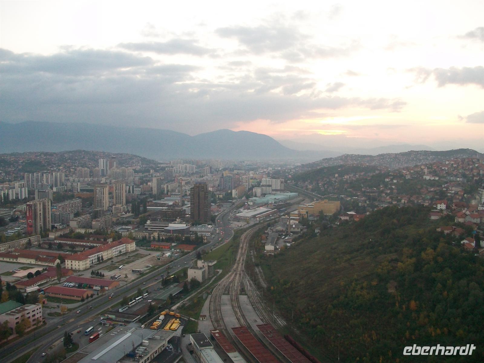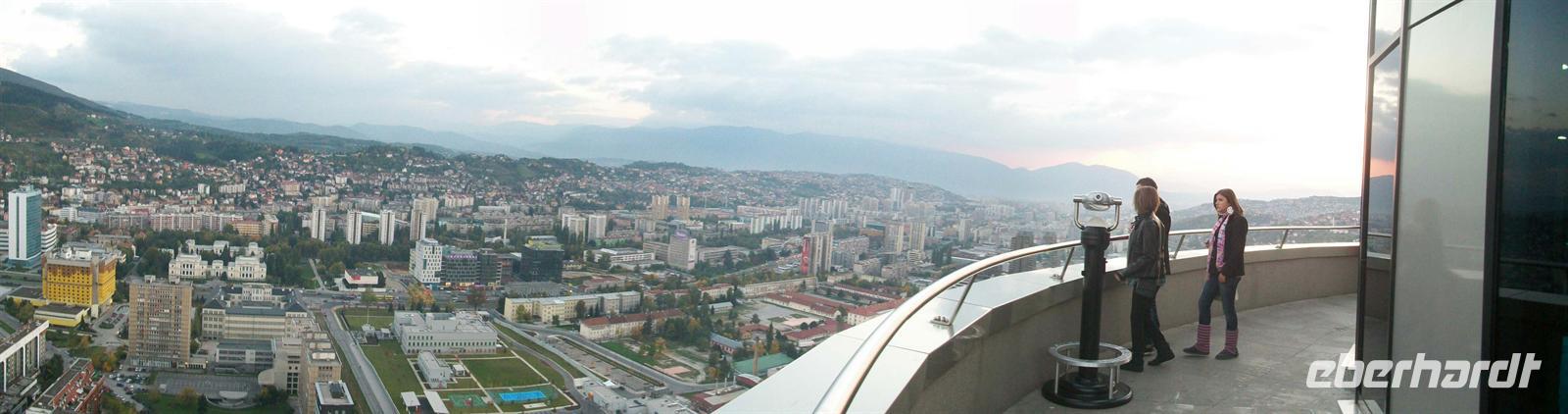 Es ist das völlig neu entstandene, hypermoderne Bürohochhaus welches hier den Blick dominiert. Mit einem Lift ist man in sekundenschnelle oben und genießt von hier einen atemberaubenden Blick über die Stadt, das Umland und die gleich hinter Sarajevo aufsteigenden Berge, wo 1984 die alpinen Skirennen stattfanden. Die gerade untergegangene Sonne malt uns noch eine schöne rote Farbe an den Himmel und an die sanften Wolken. Es ist ein besonders schöner Ausklang des Tages hier hoch oben über den Dächern einer schönen Stadt.