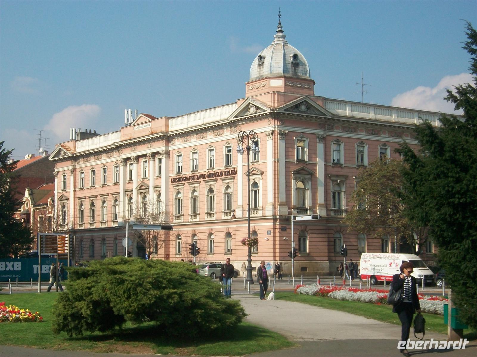 Dann geht unsere Tour weiter, der größte Teil wird ab jetzt zu Fuß erfolgen. An der ehemaligen Bibliothek, die im letzten Krieg ausbrannte und zurzeit wieder neu aufgebaut wird, beginnt unser Rundgang durch Sarajevo.