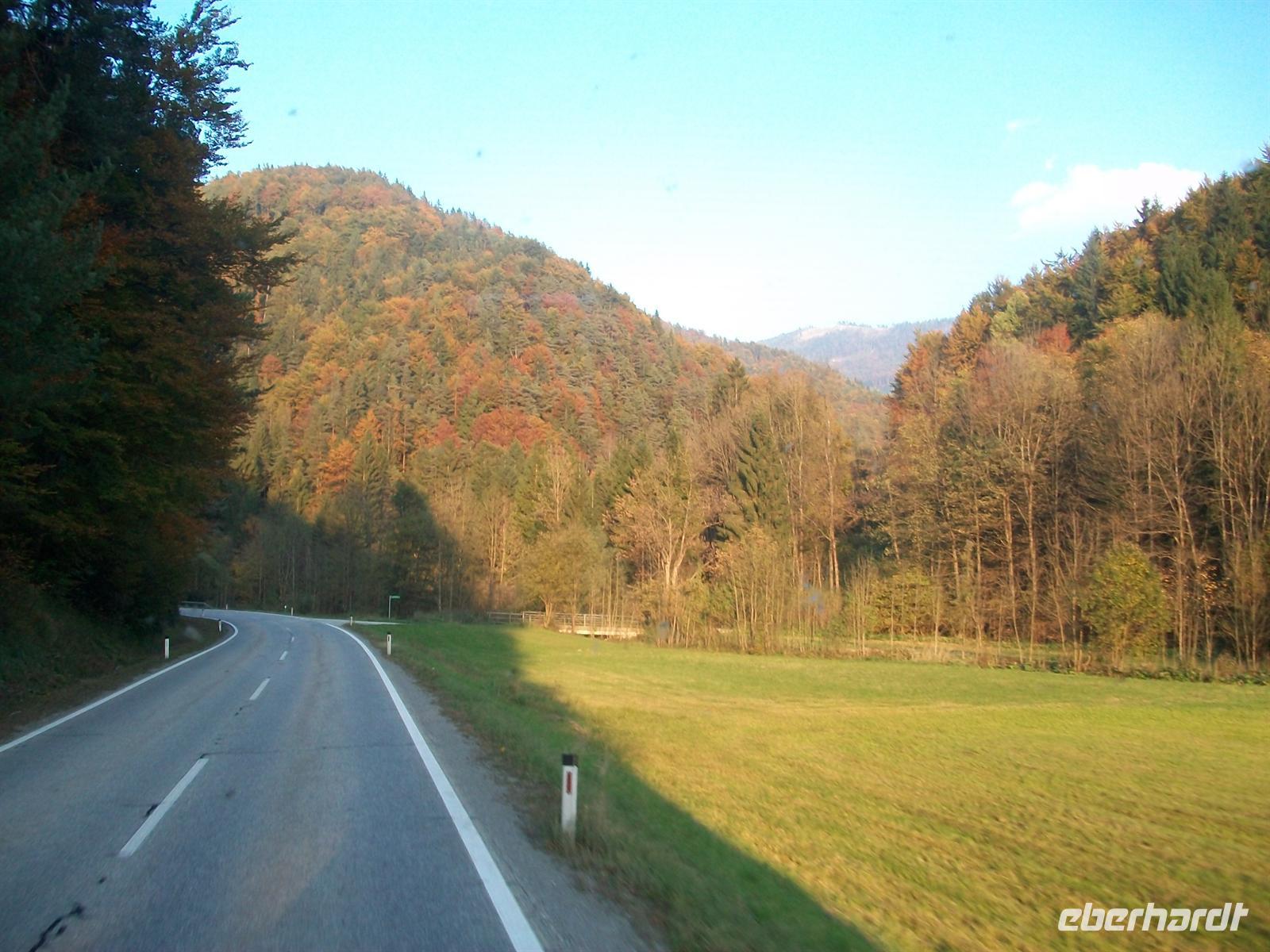 Wir durchfahren noch einmal das Seitental der Mur, mit seiner schönen Laubfärbung, unten angelangt geht es auf der Autobahn weiter. Hinter dem Gleinalmtunnel liegen Hochnebelbänke über der Autobahn, sie schränken die Sicht auf die Berge ein.
