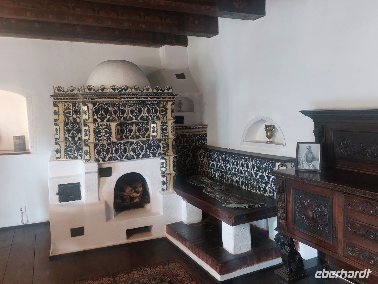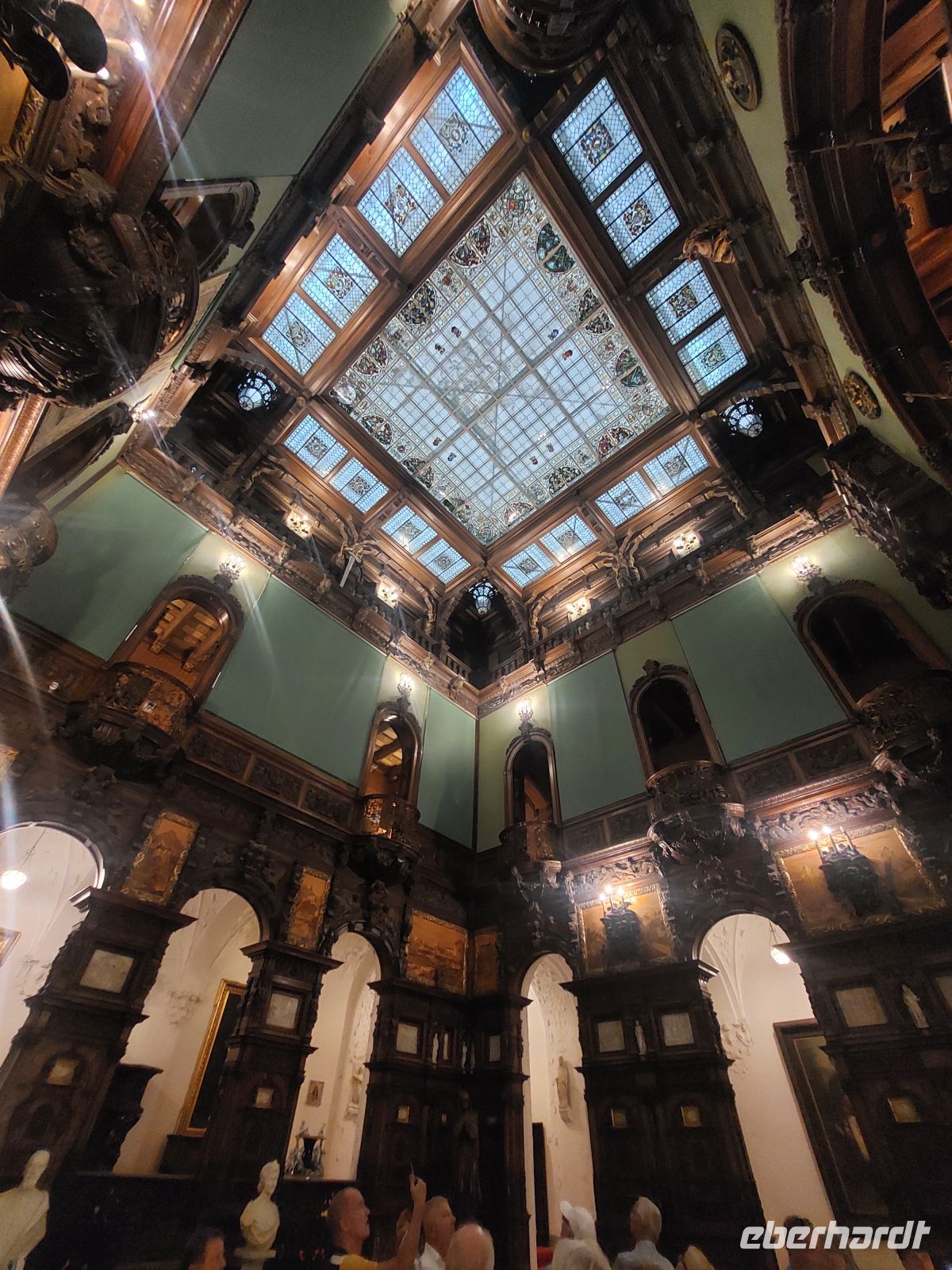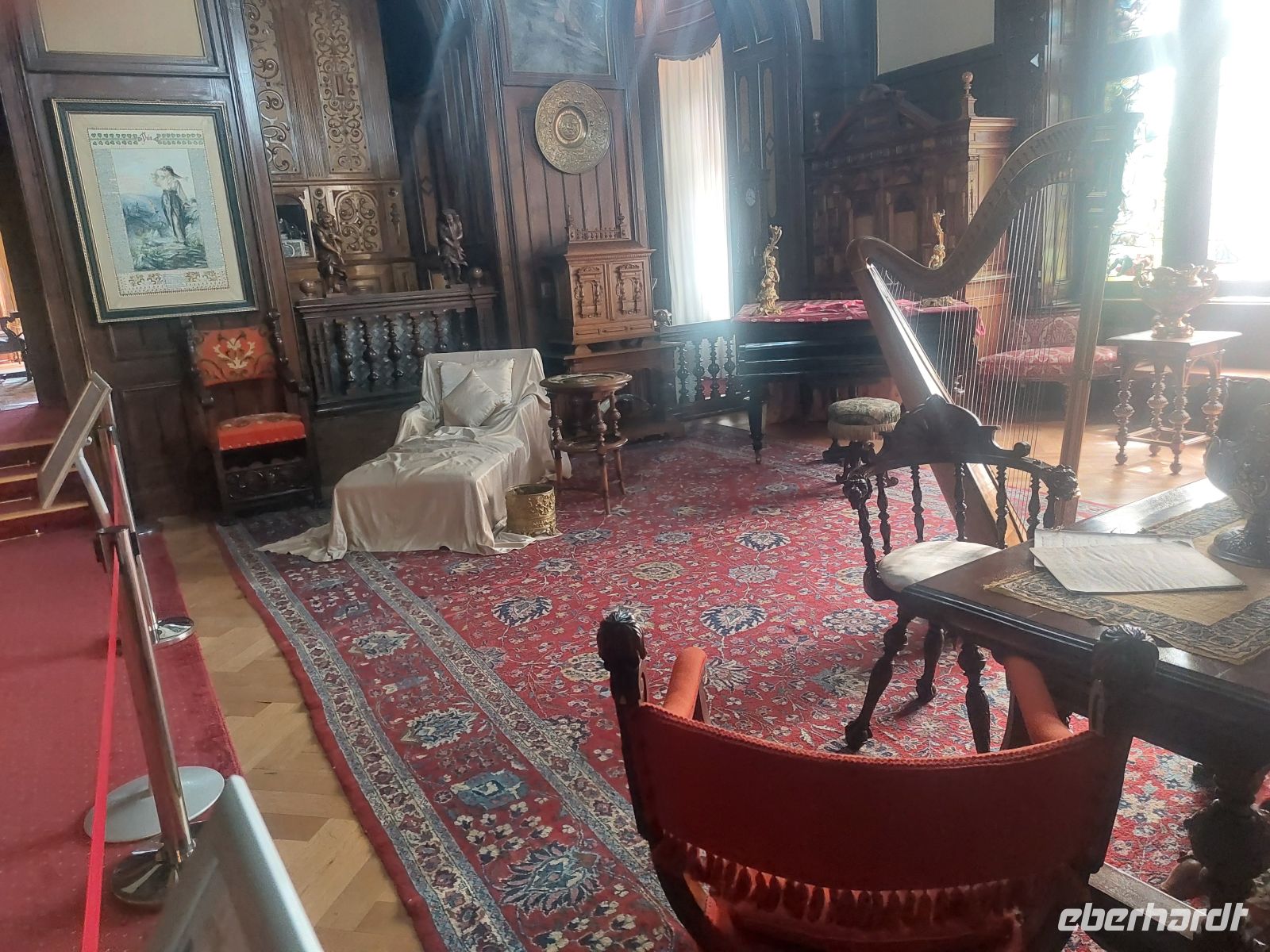 Im Inneren des Schlosses wurde an den Wänden und Decken extrem viel Holz verarbeitet. Mit der Ausführung der Wandgemälde wurde Gustav Klimt beauftragt. Um, bei so viel Holzeinbauten offenes Feuer zu vermeiden, wurde das Schloss, für die damalige Zeit sehr modern, mit einer Zentralheizung ausgestattet. Neben den vielen beeindruckenden, voll eingerichteten Räumen faszinierte besonders das dunkel getäfelte und mit verglasten Oberlicht versehene Treppenhaus. Durch die Empfangshalle, den Waffensaal, das Arbeitszimmer, das Musikzimmer, den Maurischen Saal und den Florentina Saal durchschritten wir auch die Privaträume Carol I., die im Sanitärbereich, für damalige Verhältnisse sehr modern ausgestattet waren.
