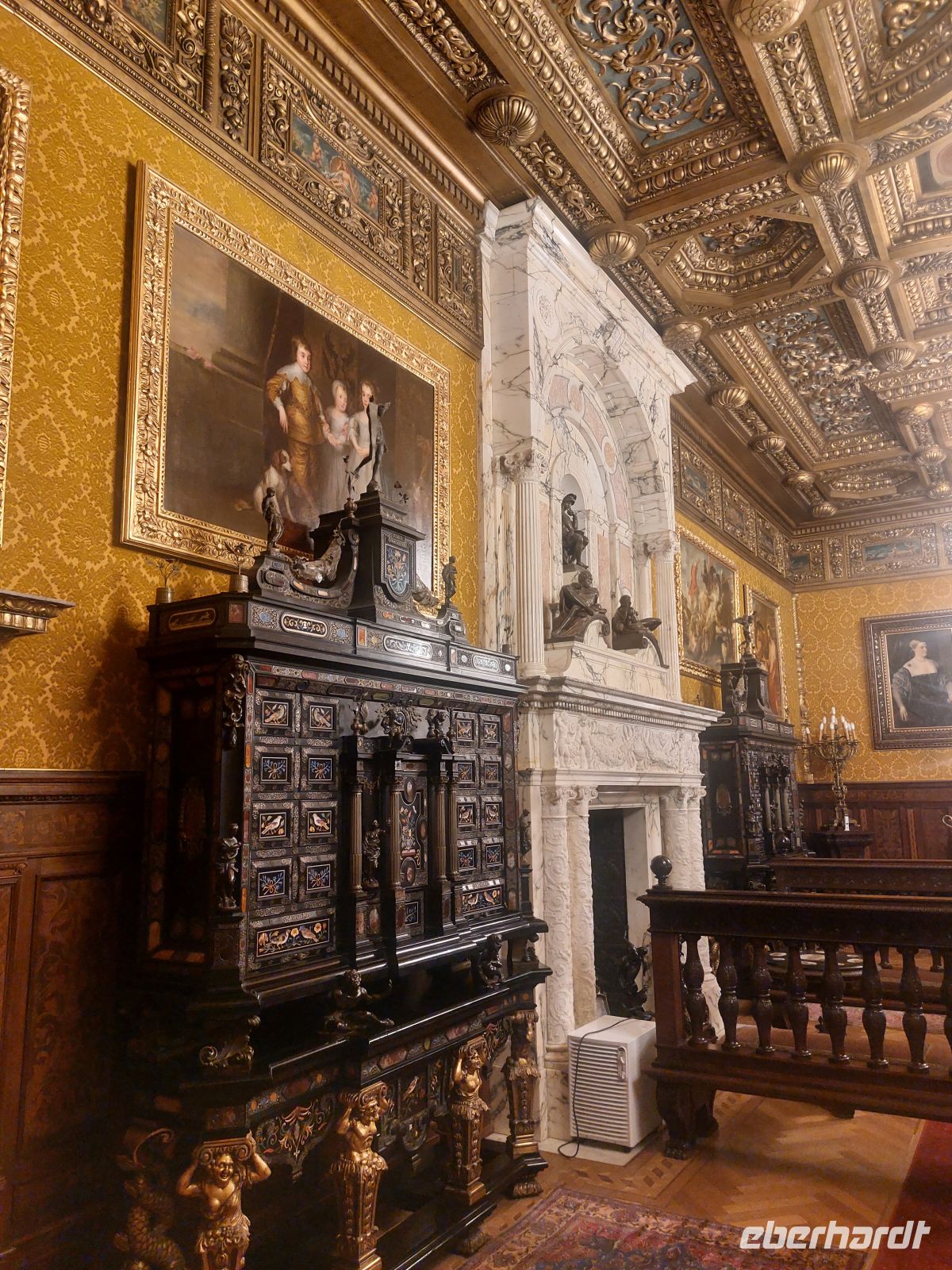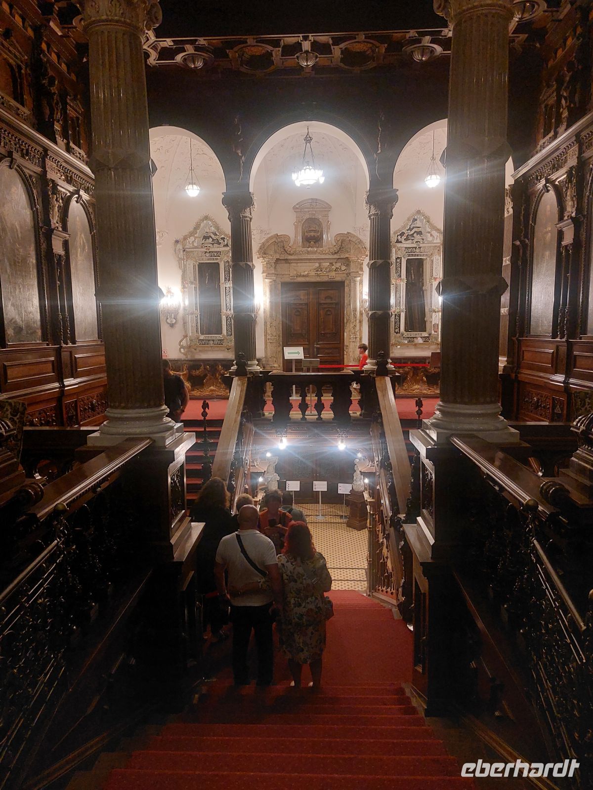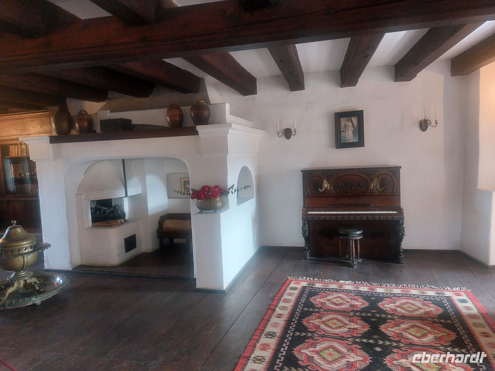 Im Inneren des Schlosses wurde an den Wänden und Decken extrem viel Holz verarbeitet. Mit der Ausführung der Wandgemälde wurde Gustav Klimt beauftragt. Um, bei so viel Holzeinbauten offenes Feuer zu vermeiden, wurde das Schloss, für die damalige Zeit sehr modern, mit einer Zentralheizung ausgestattet. Neben den vielen beeindruckenden, voll eingerichteten Räumen faszinierte besonders das dunkel getäfelte und mit verglasten Oberlicht versehene Treppenhaus. Durch die Empfangshalle, den Waffensaal, das Arbeitszimmer, das Musikzimmer, den Maurischen Saal und den Florentina Saal durchschritten wir auch die Privaträume Carol I., die im Sanitärbereich, für damalige Verhältnisse sehr modern ausgestattet waren.