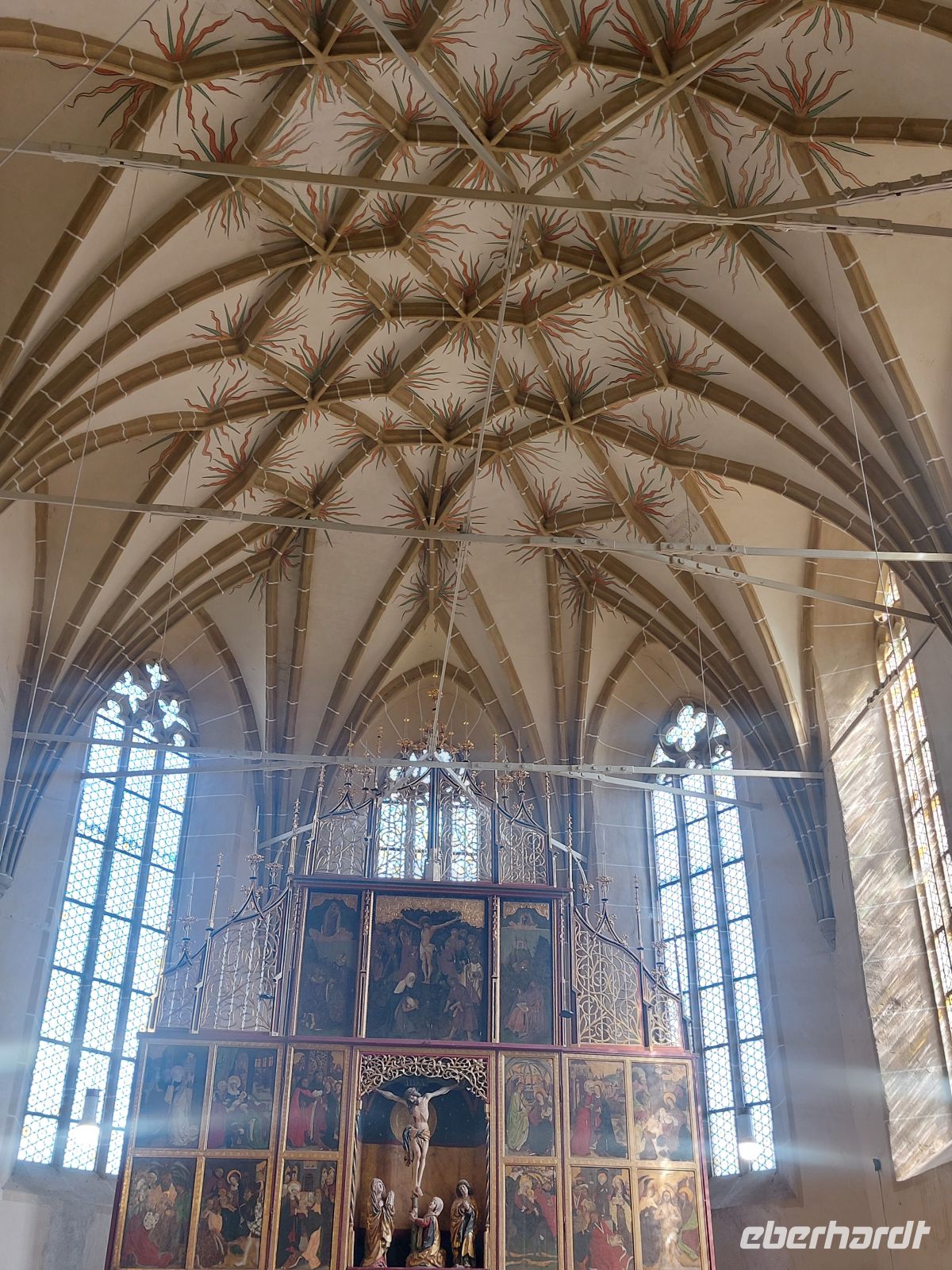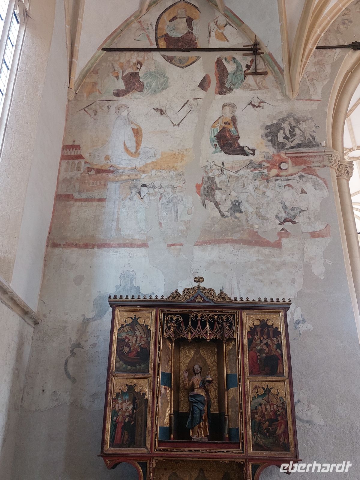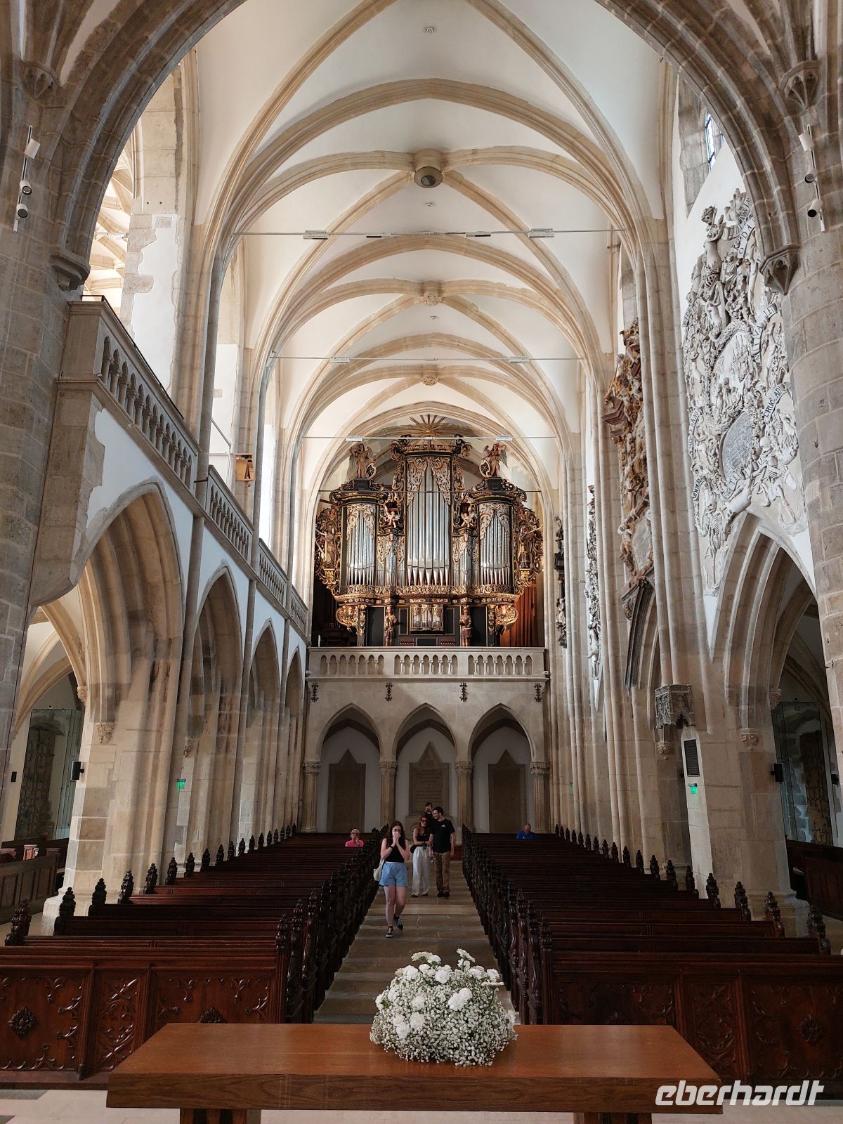 Das Pendant zur Katholischen ist die Evangelische Stadtpfarrkirche, die ehemals 1523 als katholische Kirche geweiht wurde. In einem akzentfreien Deutsch hat uns eine örtliche Führerin das Innenleben der Kirche nähergebracht. Sie begann mit der Interpretation der im Eingangsbereich ausgestellten Grabplatten. In dieser Kirche waren auch einige Orgeln aus anderen, nicht mehr geweihten Kirchen Siebenbürgens zusammengetragen. Oberhalb der Hauptkirche thronte eine barocke Orgel mit einem Prospekt von 1672.
