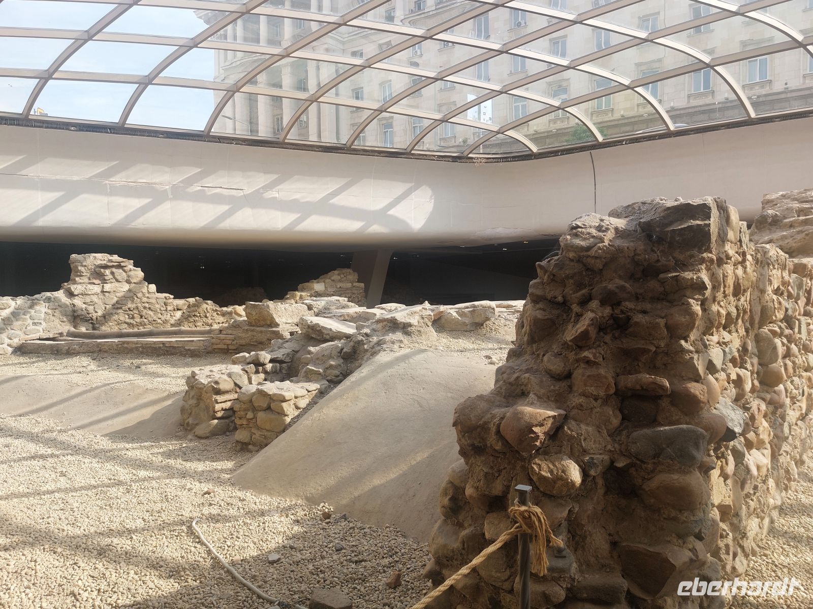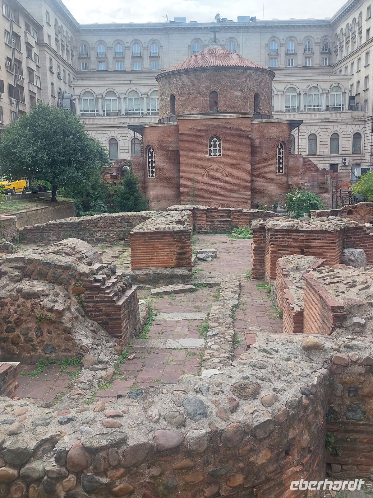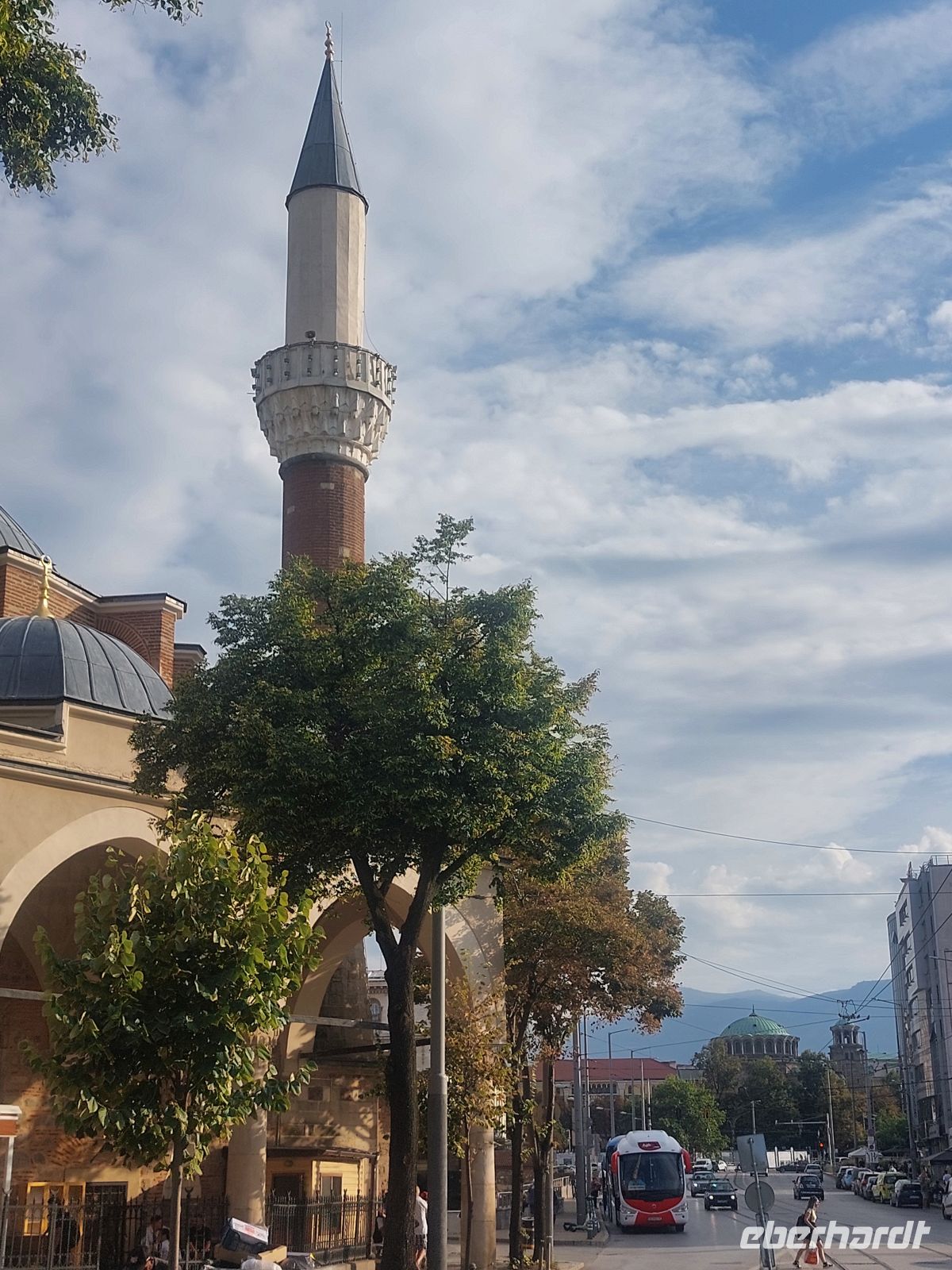 Nach der Mittagspause begannen wir gestärkt unseren Stadtspaziergang. Zuerst gingen wir zur Wachablösung vor dem Präsidentenpalast. Nach der Zeremonie besuchten wir im Innenhof die Rotunde des heiligen Georges, einer kleinen, sehr alten Kirche. Dann zeigte uns Corina einige Ausgrabungen aus dem 6. und 7. Jahrhundert, die im Zusammenhang mit dem Bau der Metro freigelegt und jetzt in die Unterführungen mit eingebunden wurden. Wir erreichten das im 19. Jahrhundert erbaute architektonische Wunderwerk und Heiligtum Bulgariens, die Alexander-Newski-Kathedrale. Sie gilt als Symbol für das reiche orthodoxe Erbe der Stadt Sofia. Corina erklärte uns am Beispiel des Altars der Kirche, wie dieser bei den Orthodoxen immer mit 2x2 Bildern aus dem Leben Jesu gleichgestaltet sind. Vorbei am ehemaligen Königspalast, der heute ein Kunstmuseum beherbergt, der Katholischen Kirche und der Synagoge waren wir um 18:00 Uhr wieder am Bus. Von hier hatte man auch einen guten Blick auf das Sofia umgebende Vitosha Gebirge.