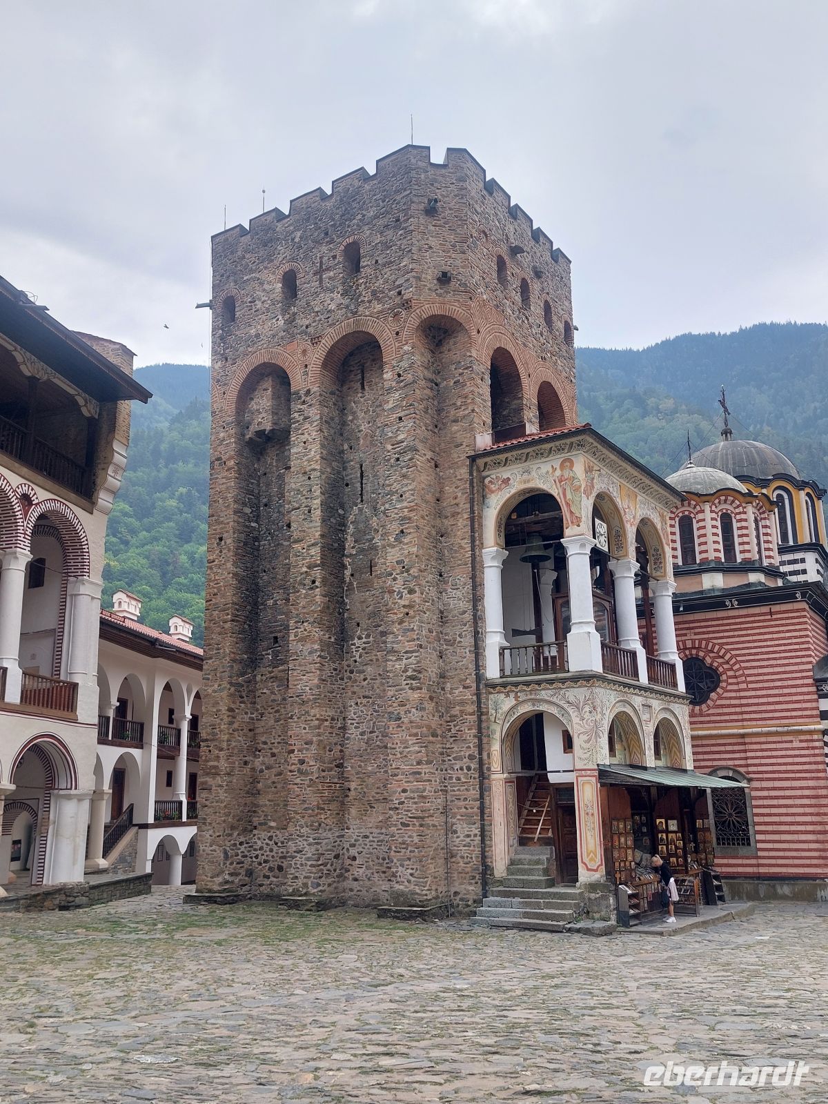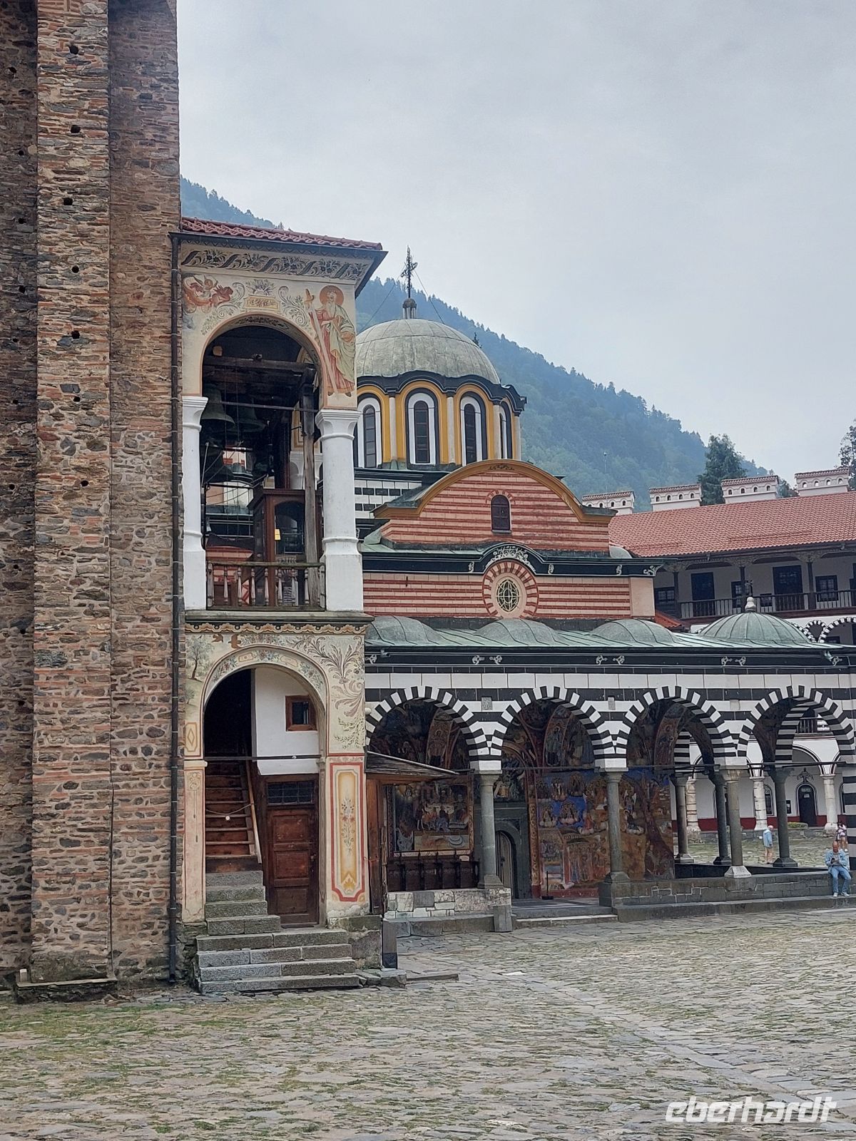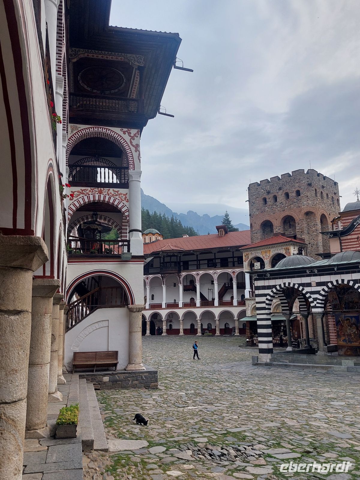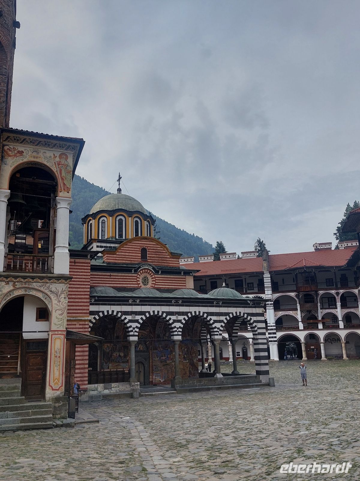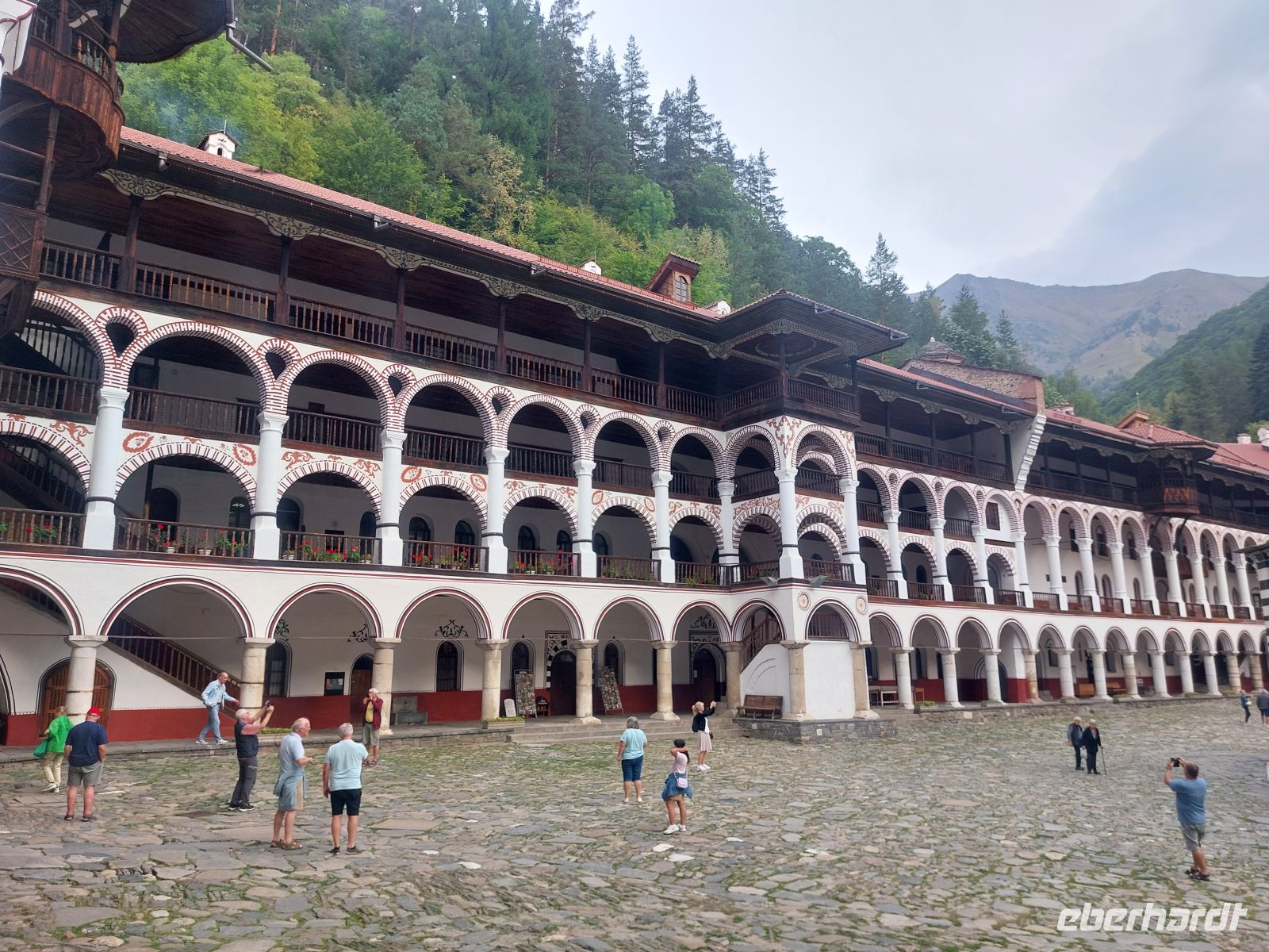 Nachdem wir Sofia verlassen hatten, ging es auf einer gut ausgebauten Autobahn durch die wunderschöne Gebirgslandschaft Bulgariens. Auf der rechten Seite sahen wir die Bergketten des Pirin- Gebirges und vor uns lag das Rila- Gebirge, mit dem weltberühmten, am Ende des Rila-Tales, auf einer Höhe von 1.147 m gelegenen Rila- Kloster. Der Ursprung geht auf das 12. Jahrhundert zurück. Aus dieser Zeit ist nur noch der Glockenturm von 1334 erhalten. Alle anderen Bauten des Klosters, inkl. der sehr farbenfrohen Wandbemalungen, stammen aus dem 19. Jahrhundert. Derzeit leben noch ca. 200 Mönche im Kloster.