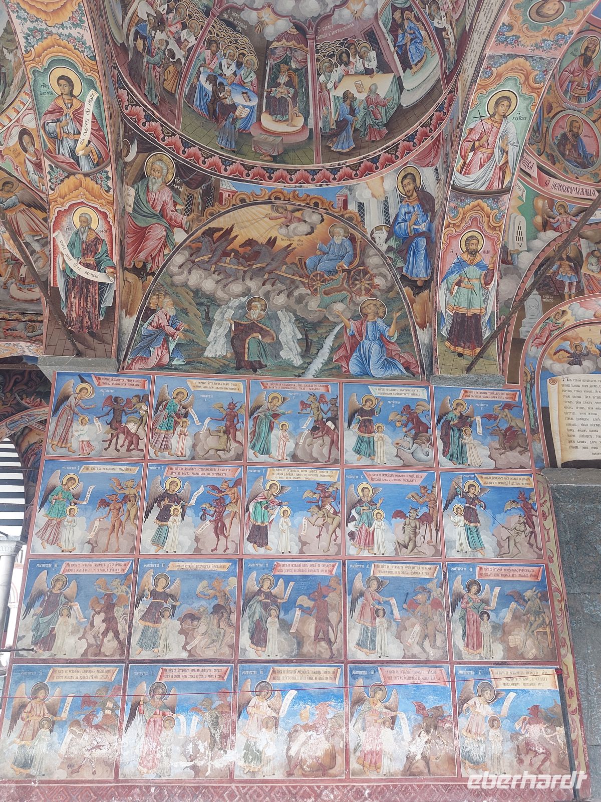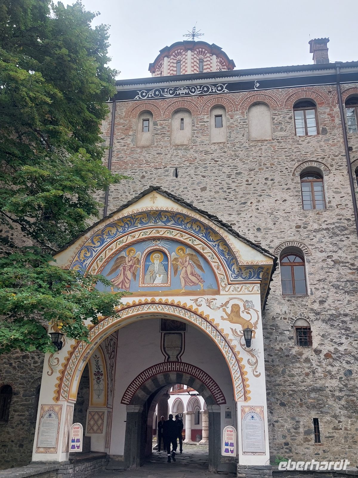Wir wurden durch die örtliche Führerin Nuscha empfangen und durch die, fast zu 100% mit biblischen Motiven und Szenen bemalte Kirche, geführt. Sämtliche Gemälde der Kirche waren über die Jahrhunderte durch Kerzenruß bis zur Unkenntlichkeit geschwärzt worden und wurden durch Restoratoren in filigraner Kleinarbeit wieder freigelegt. Nuscha interpretierte einige der schönen Malereien für uns. Im 2. Raum war der Stammbaum Jesus künstlerisch verarbeitet. Drumherum waren antike Gelehrte zu sehen. Zum Abschluss unserer Führung erklärte uns Nuscha das Bild "Rad des Lebens".
