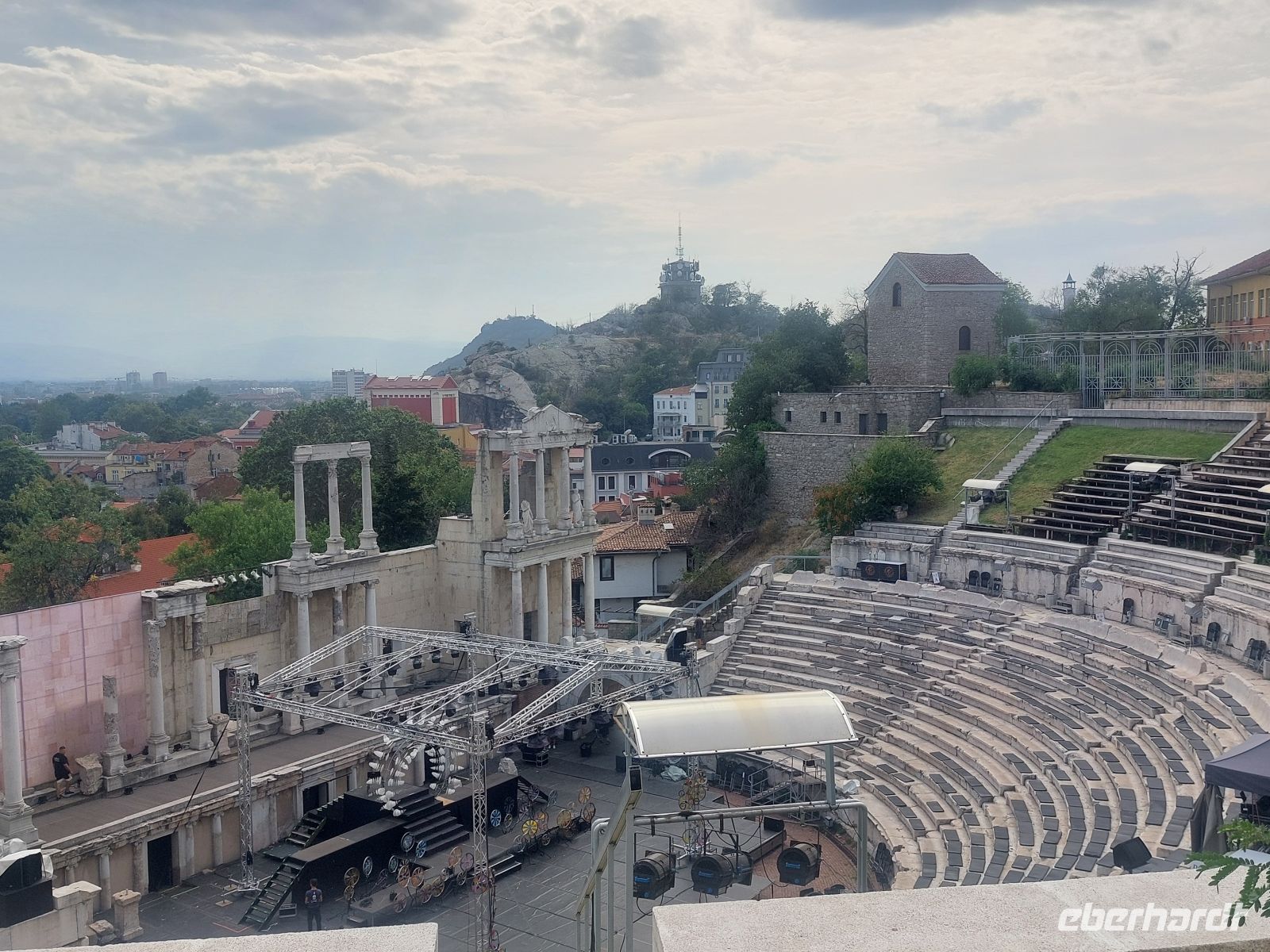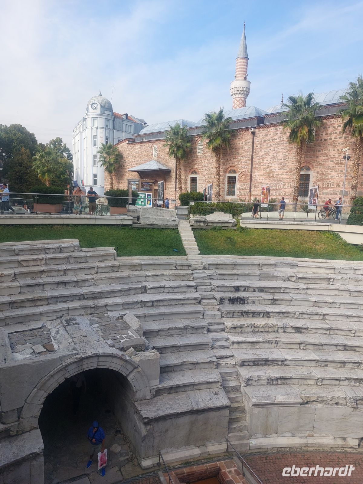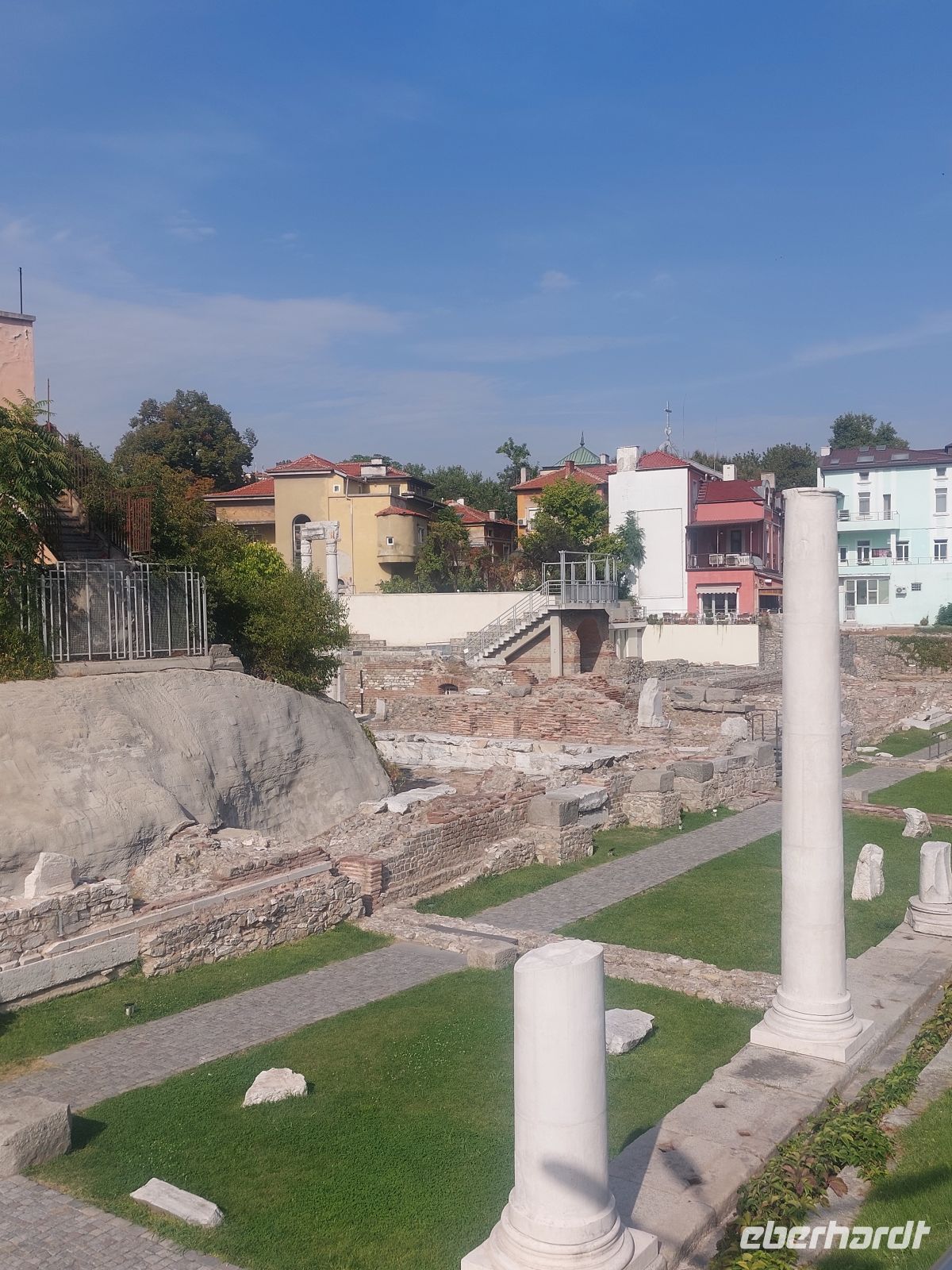 In einer rasanten Fahrt verließen wir wieder das Rila- Gebirge. Unser "Überflieger" brachte uns, trotz der vielen Hindernisse, wie für den Bus viel zu niedrige Brücken, Baumfällarbeiten etc., mit zwei Minuten Reserve, zum Bahnhof von Septemvri, wo wir in die Rhodopen- Schmalspurbahn einstiegen. Die, beginnend in den 20iger Jahren des 20. Jahrhundert erbaute Schmalspurbahn verbindet das Vorland der Rhodopen mit dem des Rila- Gebirges. Der höchste Punkt der Streck liegt auf 1.267 m. Nach gut 90 Minuten erreichten wir unseren Zielbahnhof in Velingrad. Nach wiederum 90 min Busfahrt erreichten wir eine der ältesten Siedelungen Europas und zweitgrößte Stadt Bulgariens, Plovdiv. Über die Fußgängerzone gingen wir zum Antiken Amphitheater, das einmal 3.000 Besucher fasste. Oben, auf einem der 7 Hügeln Plovdivs sahen wir das Römische Odeon (5.000 Besucher fassend), in dem heute noch, jedes Jahr im Sommer, Verdis Musik intoniert wird. Durch die historische Altstadt, den Garten des Ethnografischen Museums und einem kleinen ungewollten „Umweg“ kamen wir zu unserem Ausgangspunkt zurück.