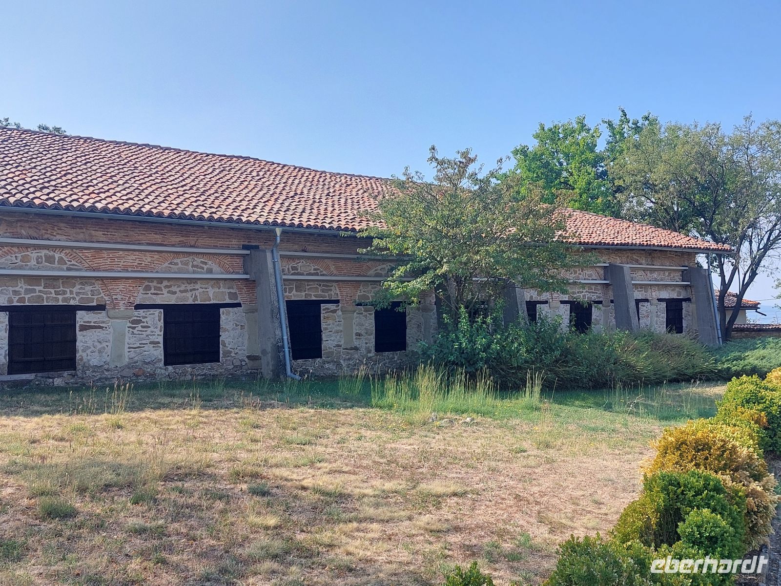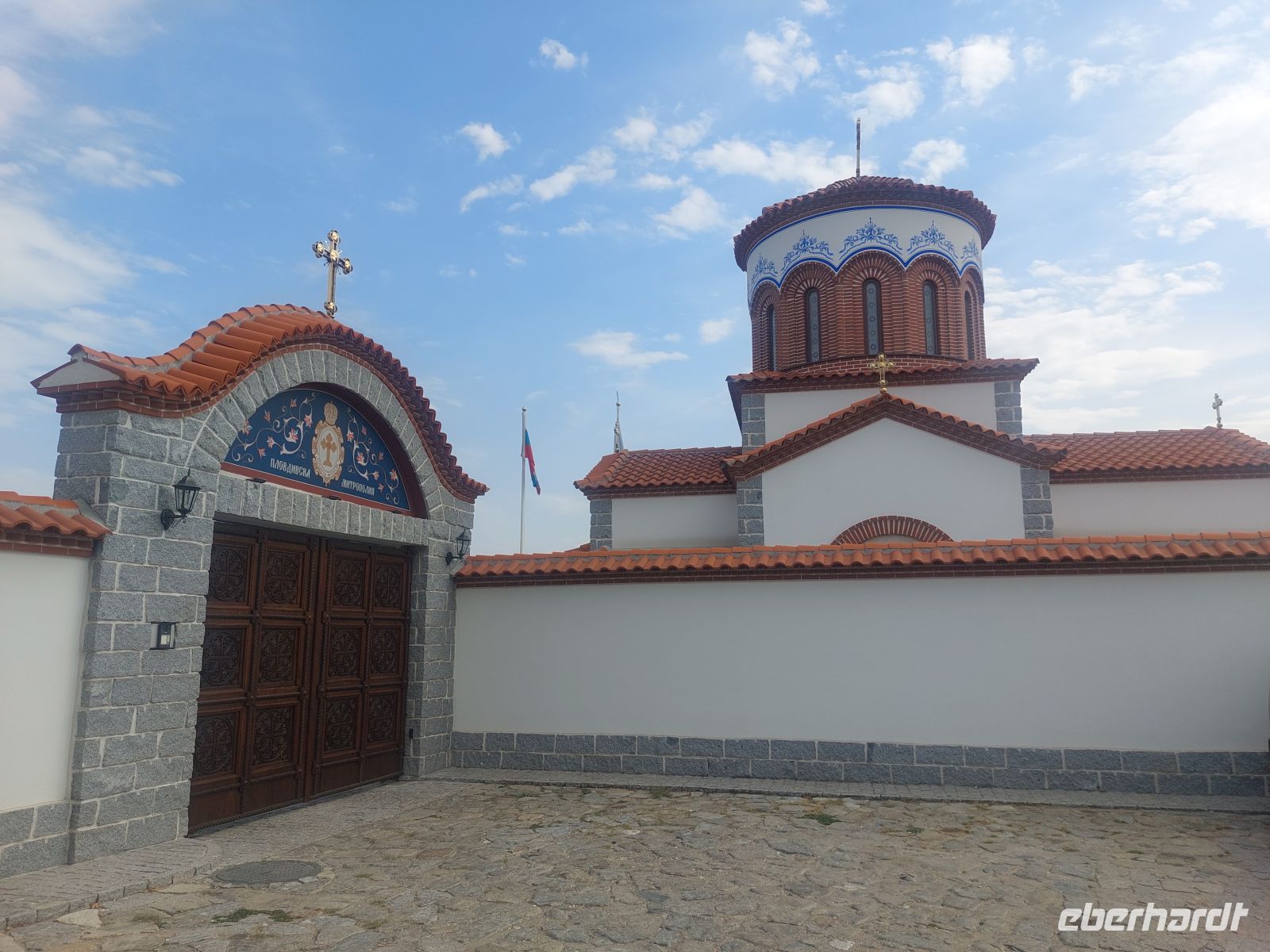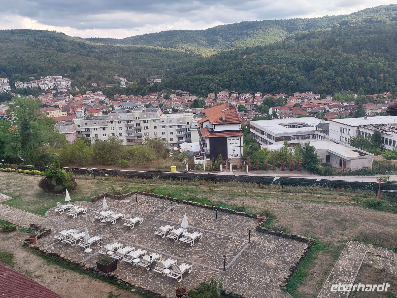 Bevor wir in unser heutiges Hotel, oberhalb von Tryavna, eincheckten, hatte Corina noch eine zusätzliche Besichtigung dieser kleinen Handwerkerstadt eingeschoben. Sie führte uns in eine Orthodoxe Kirche, die von außen nicht als eine solche zu erkennen war. Während der osmanischen Besetzung hatten die Türken erst den Bau von Kirchen unterbunden und dann, unter Auflagen, wieder erlaubt, so dass die Christen ihre Gotteshäuser in die Erde versenkten. Der Turm durfte erst im 17. Jahrhundert hinzugefügt werden. Nach etwas Freizeit fuhren wir zu unserem, hoch über dem Ort gelegenen und mit guter Aussicht über die umliegenden Berge versehenen Hotel. Abends gab es das erste Mal ein Essen vom Buffet und Corinas Agentur spendierte die Getränke.