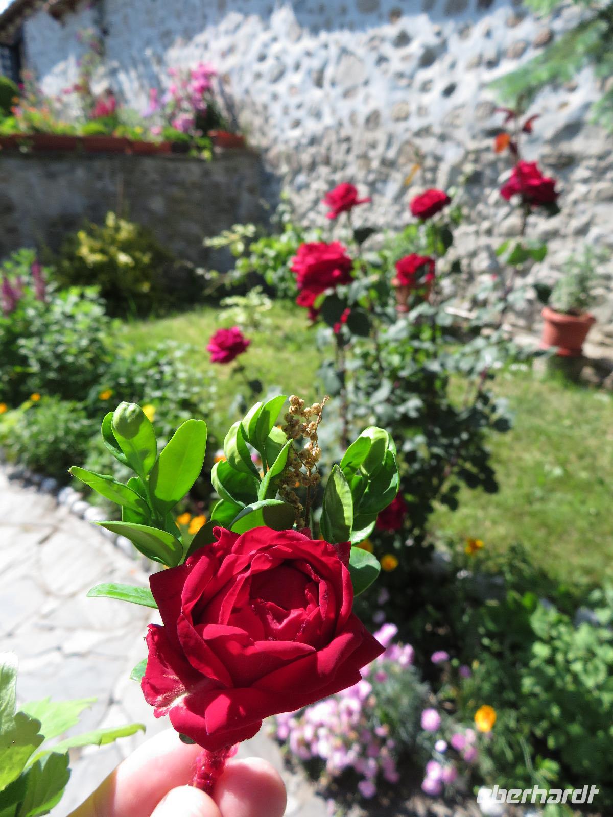 Nach Ankunft in Kazanlak besuchten wir zunächst den Nachbau eines Thrakischen Grabmals. Danach kämpften wir uns durch verstopfte Straßen zu unseren vorreservierten Sitzplätzen, von welchen wir den Umzug beobachten konnten. Es kam uns so vor, als würde sich die gesamte Region an diesem beteiligen, u. a. Spielmannszüge, Turner, Schulen, der Motorradclub. Es wurden auch viele Rosenblüten verteilt und getanzt.